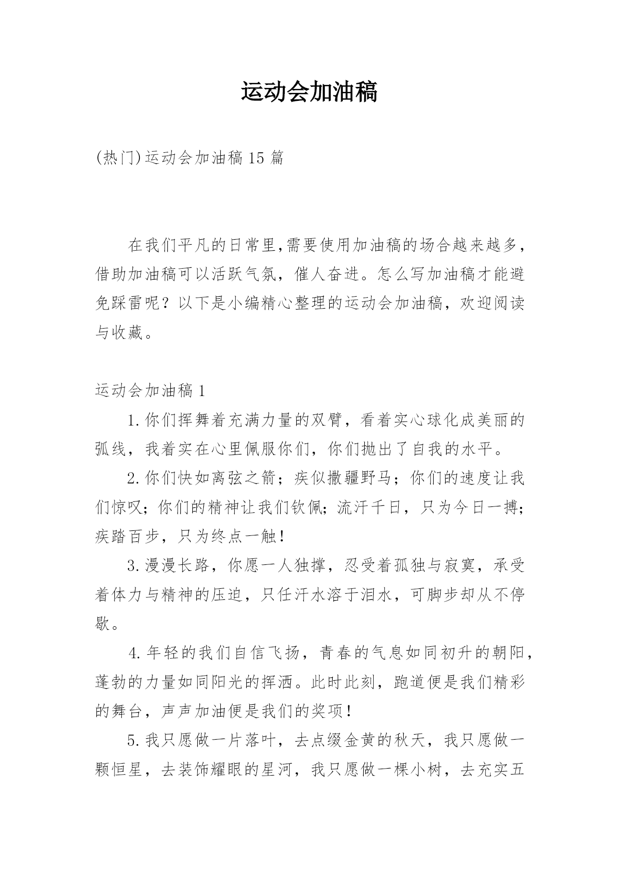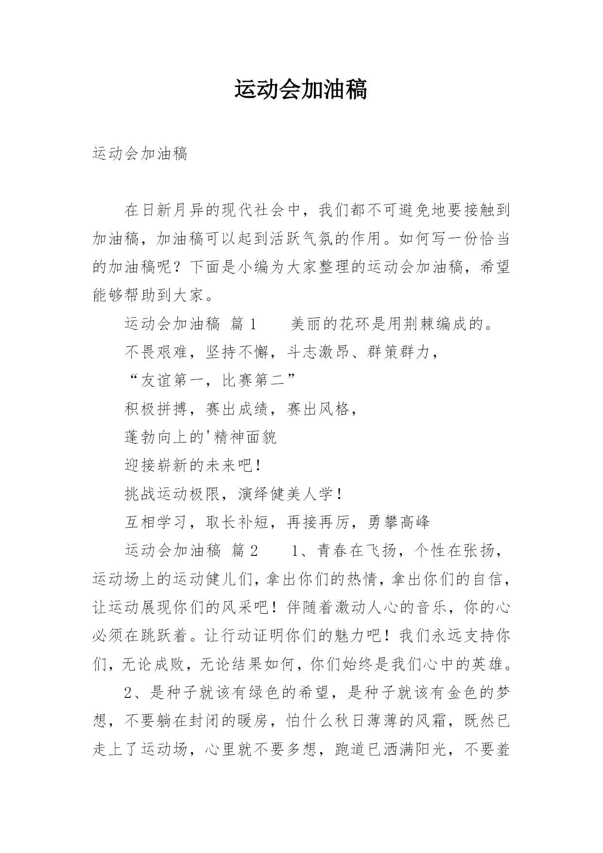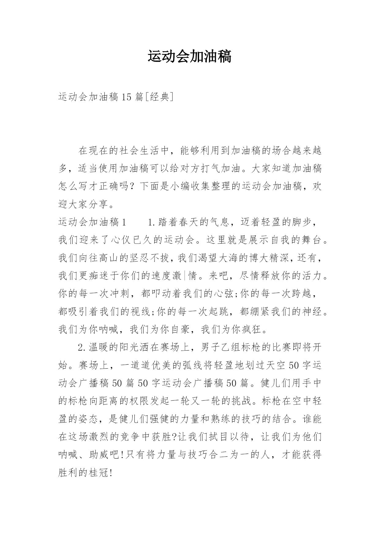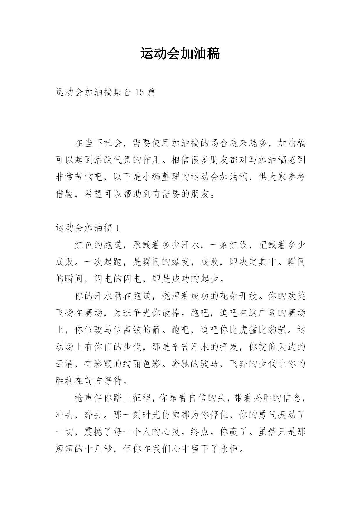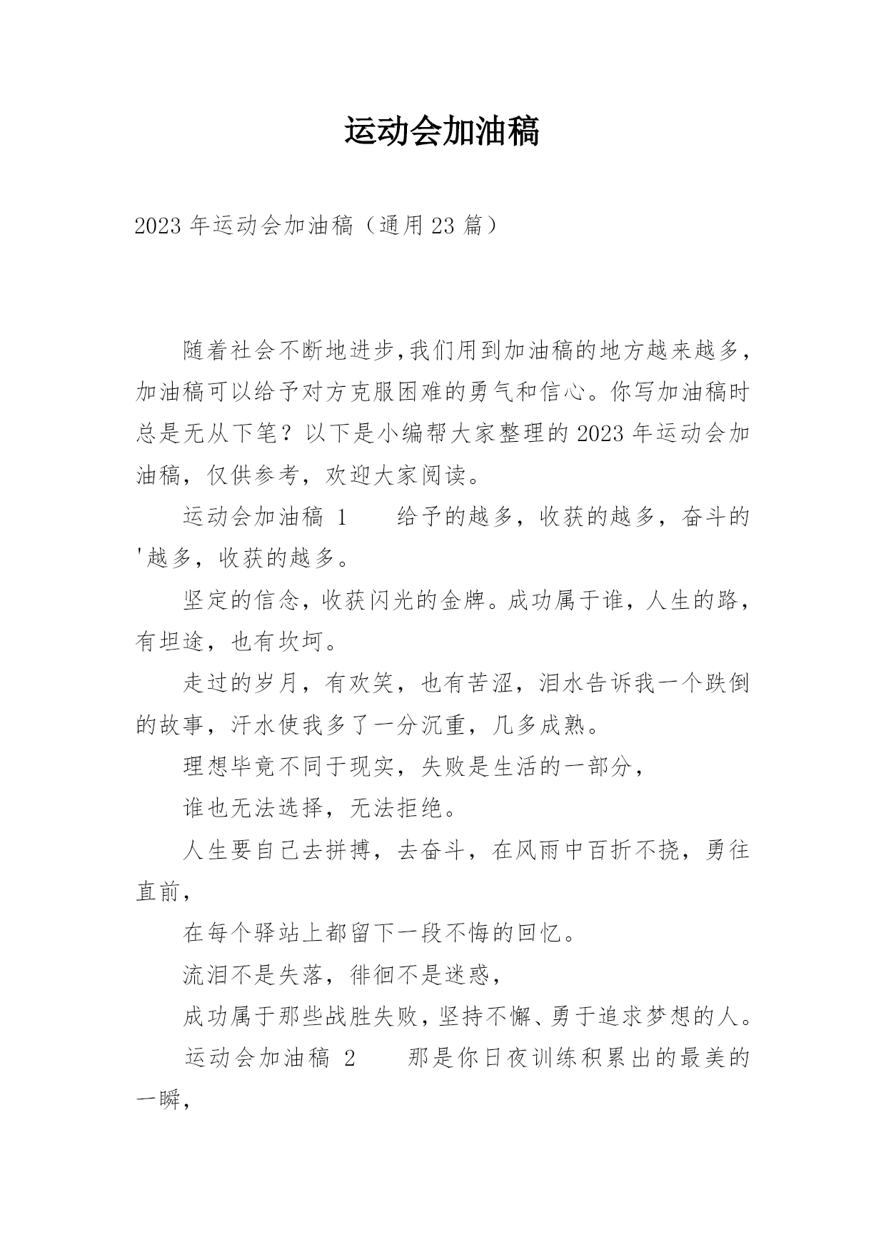 运动会加油稿运动会加油稿通用15篇在不断进步的社会中,各种加油稿频频出现,加油稿是鼓励激励对方的文稿。那么加油稿一般是怎么写的呢?下面是小编整理的运动会加油稿,欢迎阅读与收藏。运动会加油稿1不为掌声的.注释,不为刻意的征服,不为失败的痛苦,仅有辛勤的汗水,化作成功的脚步!在竞技场上,你付出汗水,释放光芒;辛勤耕耘,收获成果;为别人喝彩,以努力拼搏激励自我,感动他人。时间在流逝,赛道在延伸,成功在你面前展现,心脏在跳动,热血在沸腾,辉煌在你脚下铸就。加油吧,健儿们!运动会加油稿21、温暖的阳光洒在赛场上,男