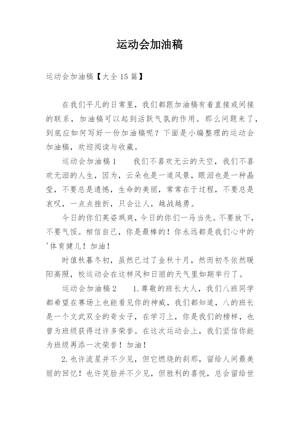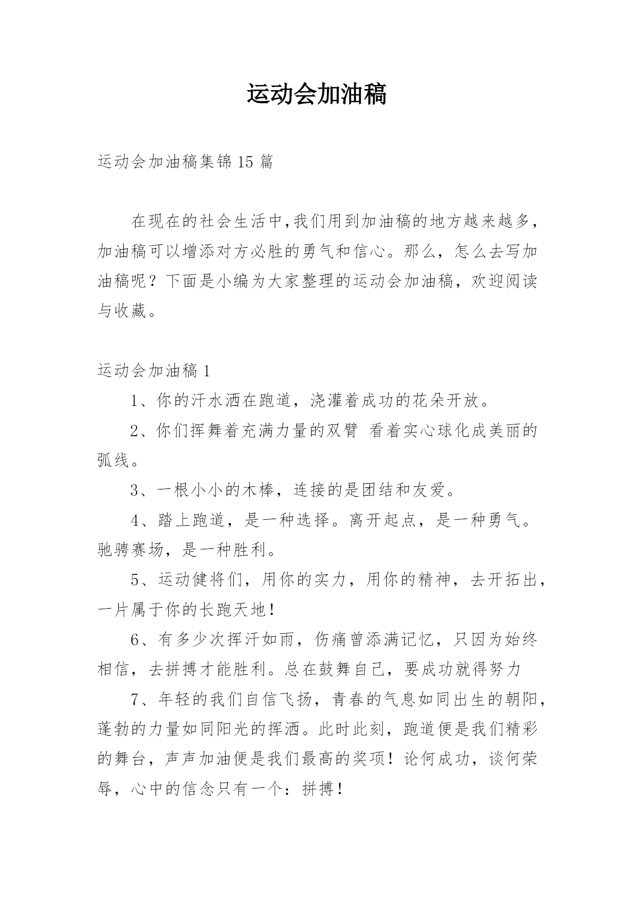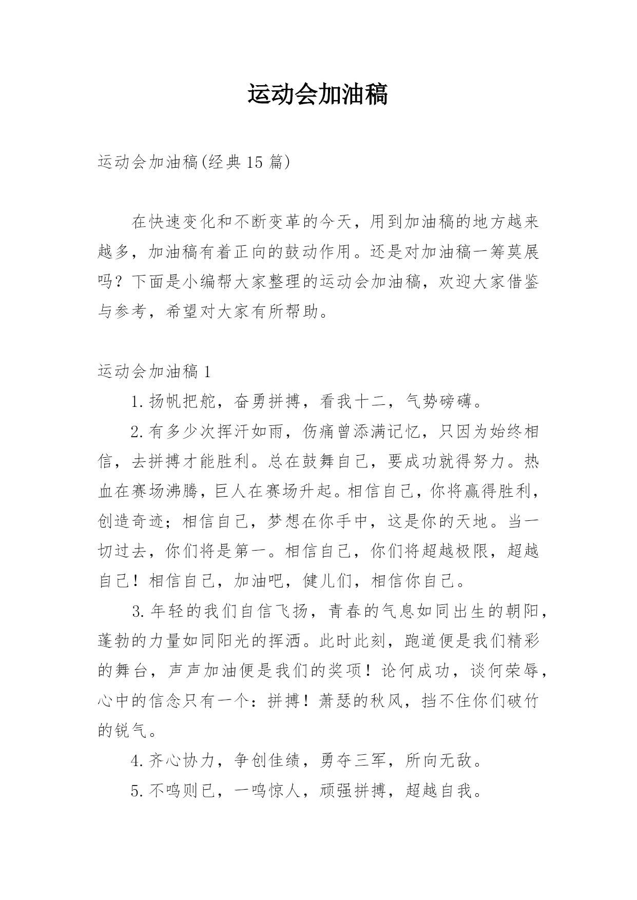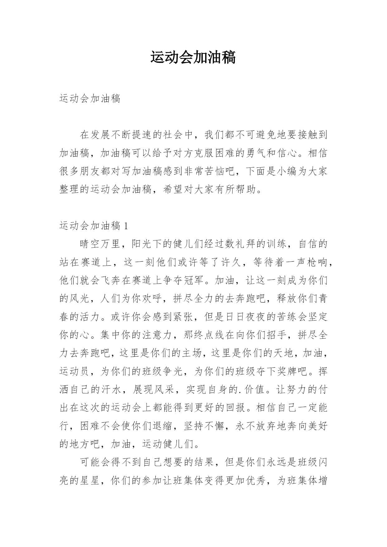 运动会加油稿运动会加油稿【大全15篇】在我们平凡的日常里,我们都跟加油稿有着直接或间接的联系,加油稿可以起到活跃气氛的作用。那么问题来了,到底应如何写好一份加油稿呢?下面是小编整理的运动会加油稿,欢迎阅读与收藏。运动会加油稿1我们不喜欢无云的天空,我们不喜欢无泪的人生,因为,云朵也是一道风景,眼泪也是一种晶莹,不要总是遗憾,生命的美丽,常常在于过程,不要总是哀叹,一点点挫折,只会让人,越战越勇。今日的你们英姿飒爽,今日的你们一马当先。不要放下,不要气馁。相信自己,你是最棒的!你永远都是我们心中的'体育健儿