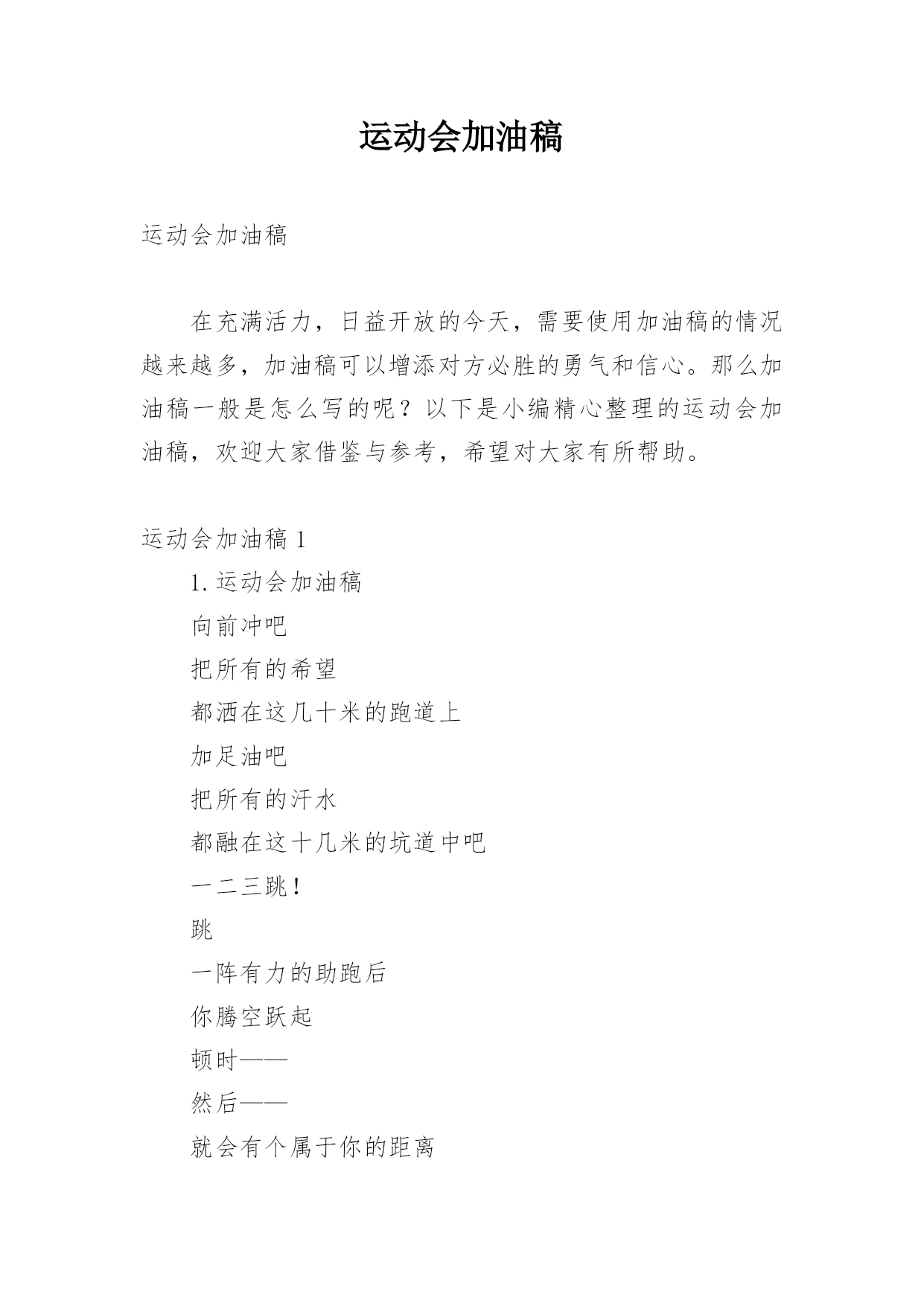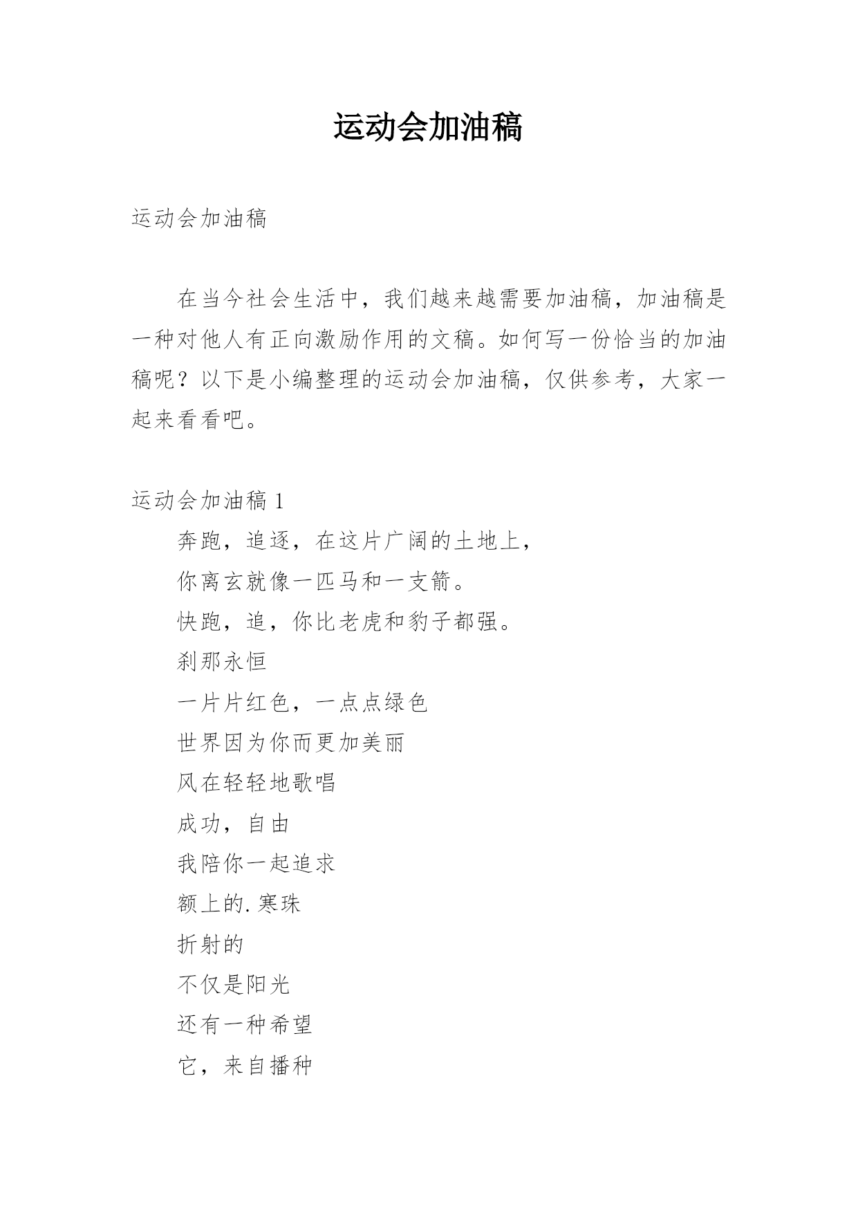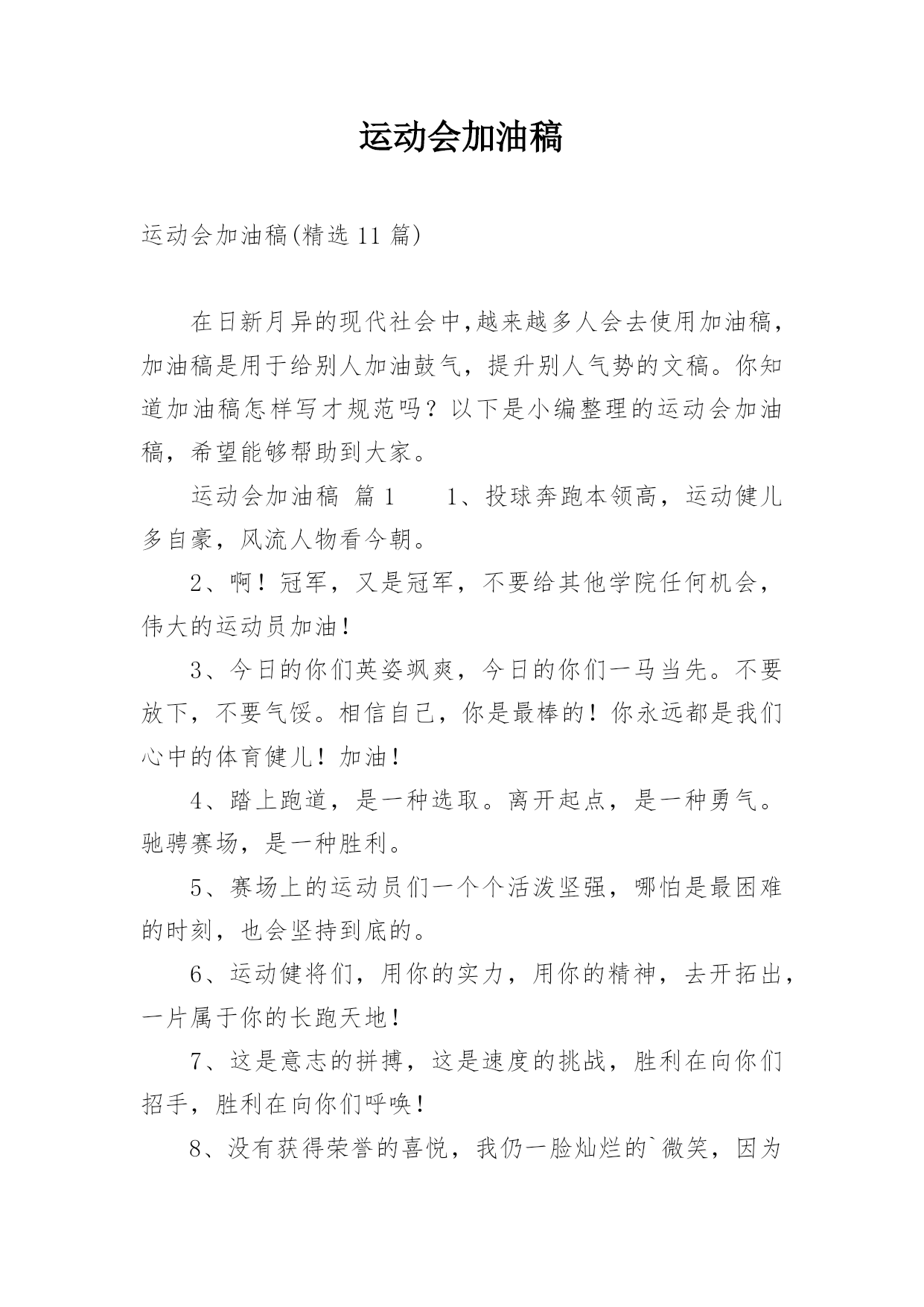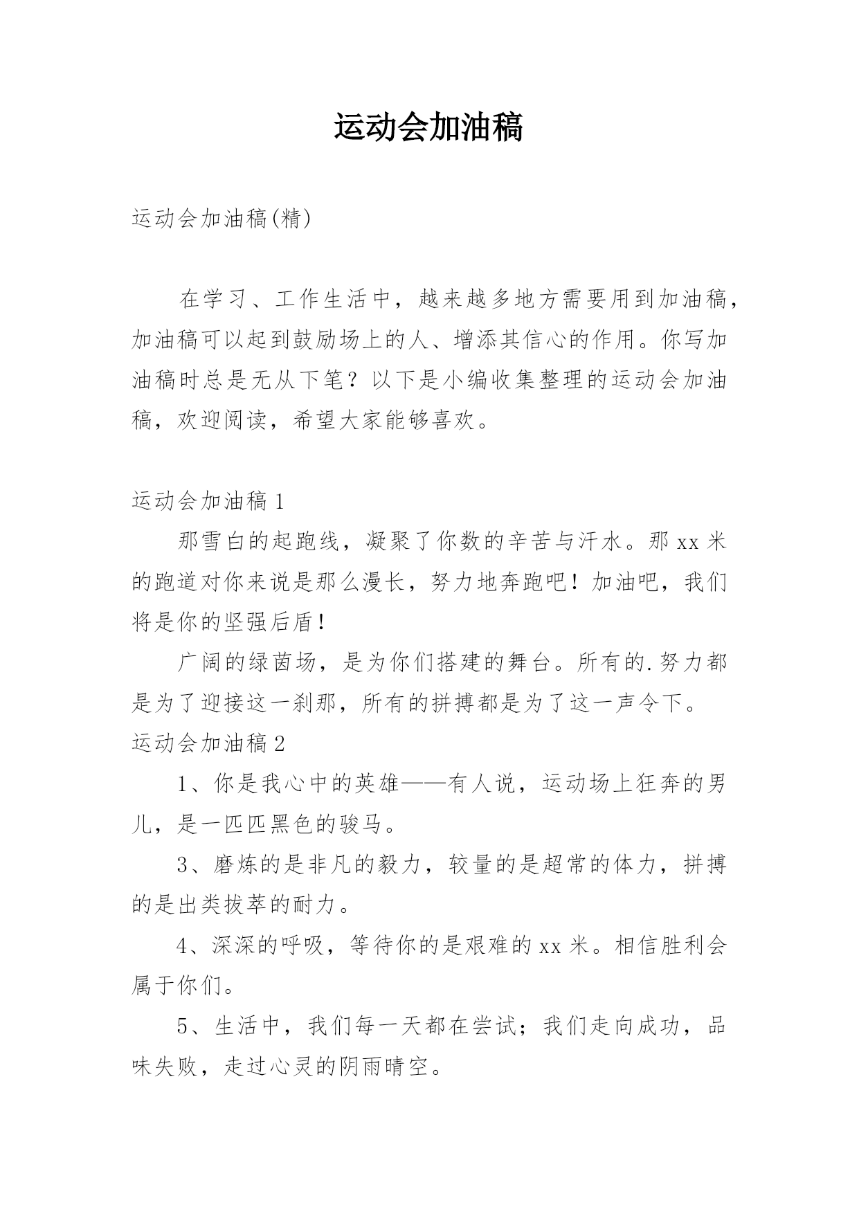 运动会加油稿运动会加油稿【大全15篇】在我们平凡的日常里,我们都跟加油稿有着直接或间接的联系,加油稿可以起到活跃气氛的作用。那么问题来了,到底应如何写好一份加油稿呢?下面是小编整理的运动会加油稿,欢迎阅读与收藏。运动会加油稿1我们不喜欢无云的天空,我们不喜欢无泪的人生,因为,云朵也是一道风景,眼泪也是一种晶莹,不要总是遗憾,生命的美丽,常常在于过程,不要总是哀叹,一点点挫折,只会让人,越战越勇。今日的你们英姿飒爽,今日的你们一马当先。不要放下,不要气馁。相信自己,你是最棒的!你永远都是我们心中的'体育健儿