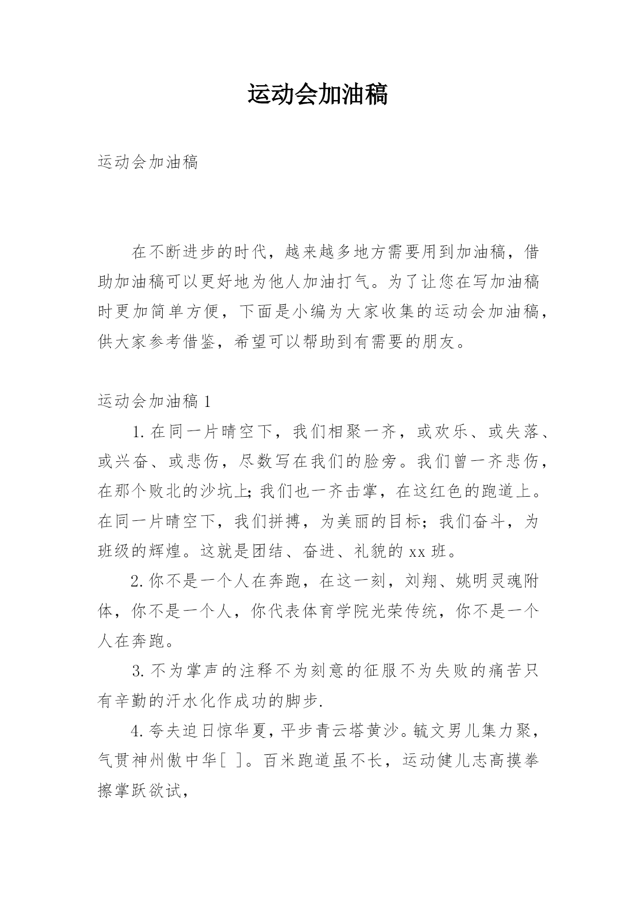 运动会加油稿运动会加油稿(精)在学习、工作生活中,越来越多地方需要用到加油稿,加油稿可以起到鼓励场上的人、增添其信心的作用。你写加油稿时总是无从下笔?以下是小编收集整理的运动会加油稿,欢迎阅读,希望大家能够喜欢。运动会加油稿1那雪白的起跑线,凝聚了你数的辛苦与汗水。那xx米的跑道对你来说是那么漫长,努力地奔跑吧!加油吧,我们将是你的坚强后盾!广阔的绿茵场,是为你们搭建的舞台。所有的.努力都是为了迎接这一刹那,所有的拼搏都是为了这一声令下。运动会加油稿21、你是我心中的英雄——有人说,运动场上狂奔的男儿,是