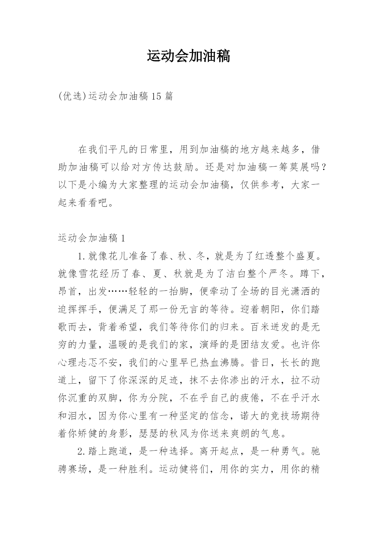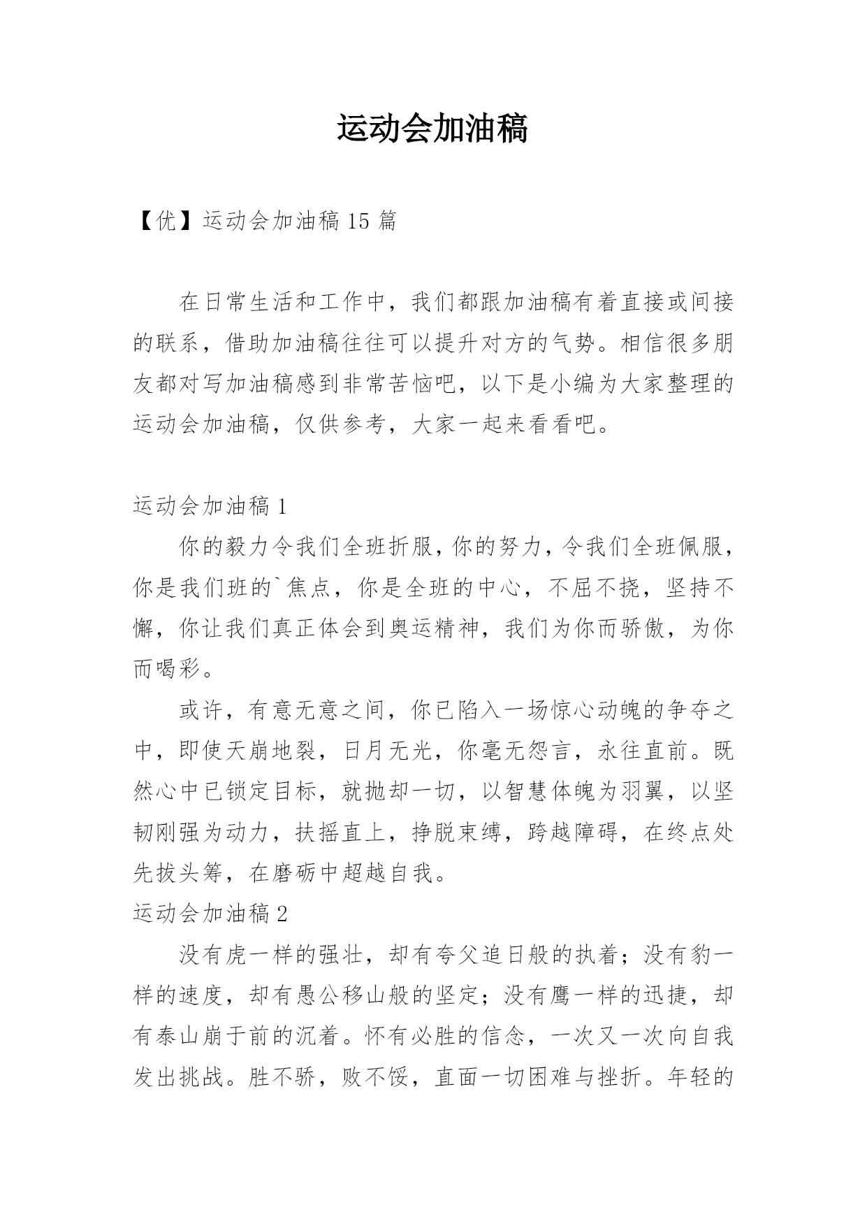 运动会加油稿【优】运动会加油稿15篇在日常生活和工作中,我们都跟加油稿有着直接或间接的联系,借助加油稿往往可以提升对方的气势。相信很多朋友都对写加油稿感到非常苦恼吧,以下是小编为大家整理的运动会加油稿,仅供参考,大家一起来看看吧。运动会加油稿1你的毅力令我们全班折服,你的努力,令我们全班佩服,你是我们班的`焦点,你是全班的中心,不屈不挠,坚持不懈,你让我们真正体会到奥运精神,我们为你而骄傲,为你而喝彩。或许,有意无意之间,你已陷入一场惊心动魄的争夺之中,即使天崩地裂,日月无光,你毫无怨言,永往直前。既然心