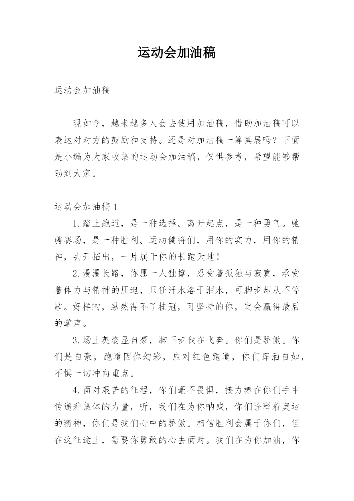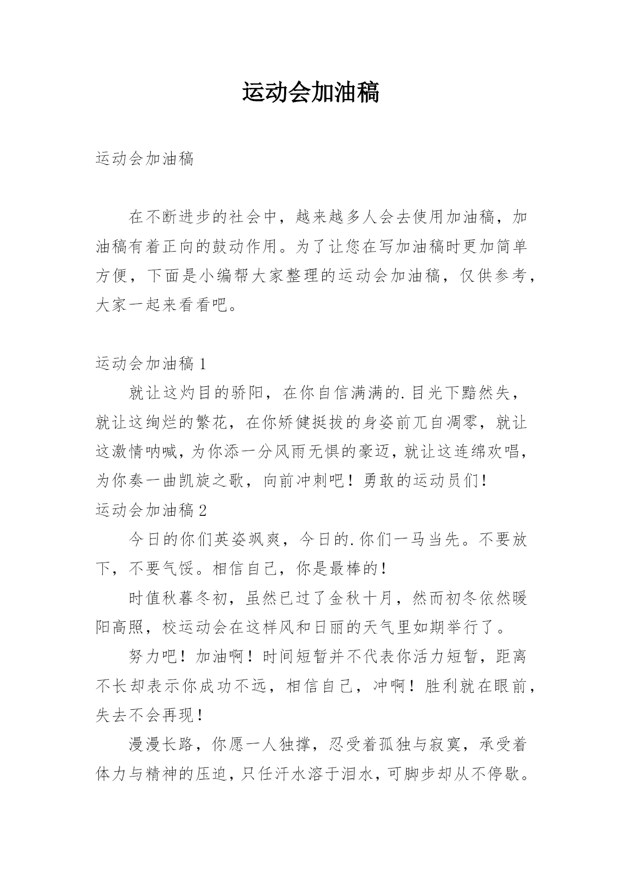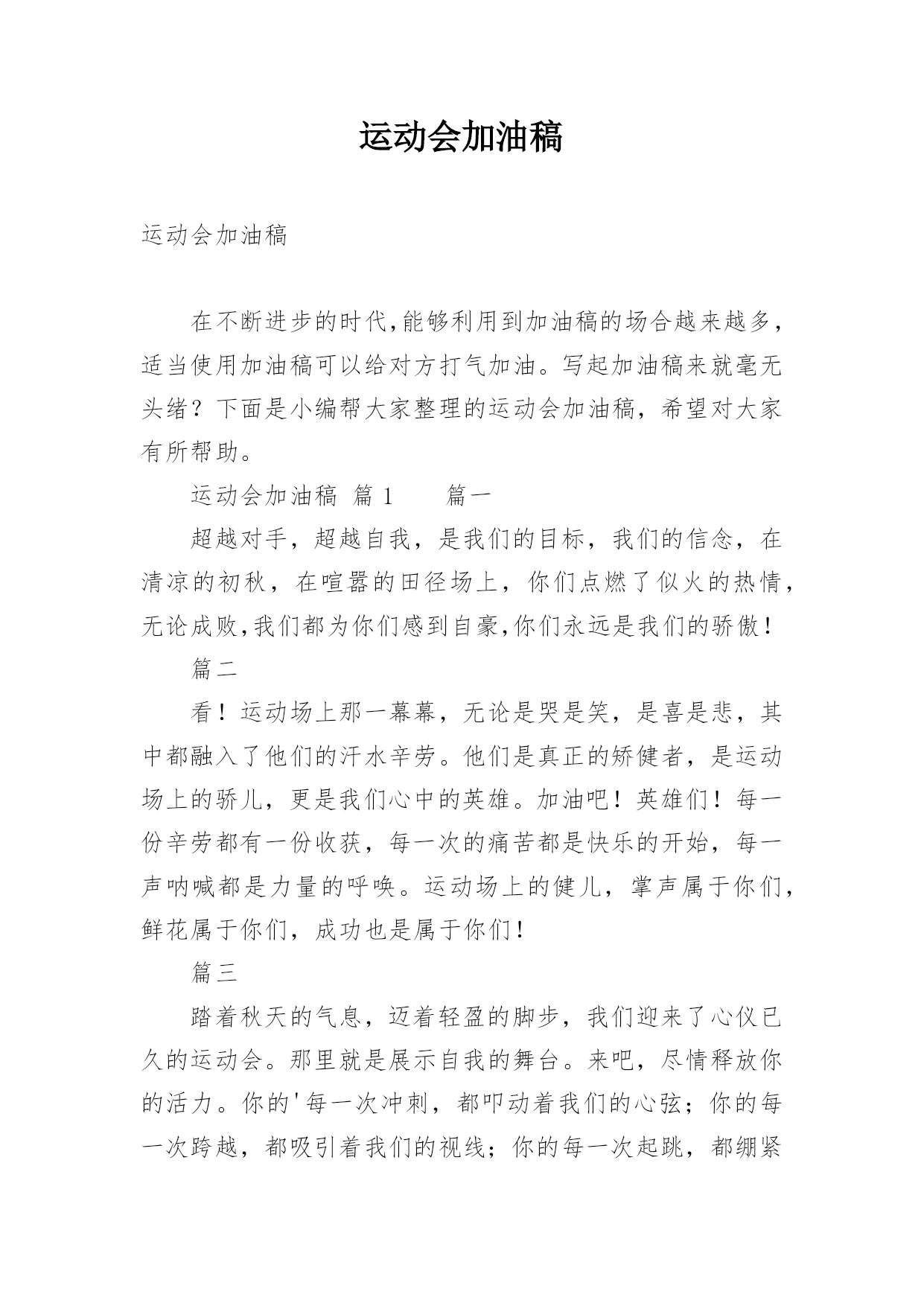 运动会加油稿运动会加油稿在不断进步的社会中,越来越多人会去使用加油稿,加油稿有着正向的鼓动作用。为了让您在写加油稿时更加简单方便,下面是小编帮大家整理的运动会加油稿,仅供参考,大家一起来看看吧。运动会加油稿1就让这灼目的骄阳,在你自信满满的.目光下黯然失,就让这绚烂的繁花,在你矫健挺拔的身姿前兀自凋零,就让这激情呐喊,为你添一分风雨无惧的豪迈,就让这连绵欢唱,为你奏一曲凯旋之歌,向前冲刺吧!勇敢的运动员们!运动会加油稿2今日的你们英姿飒爽,今日的.你们一马当先。不要放下,不要气馁。相信自己,你是最棒的!时