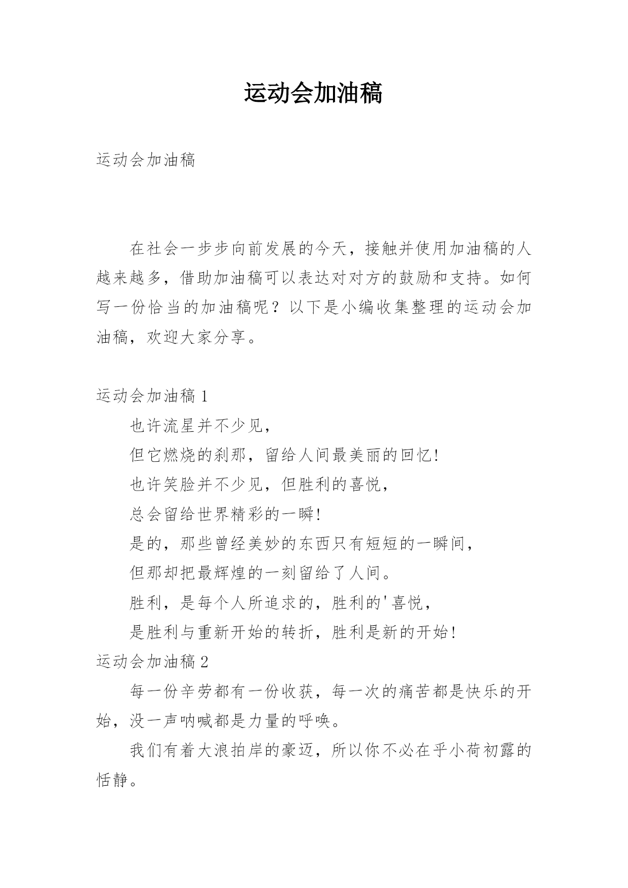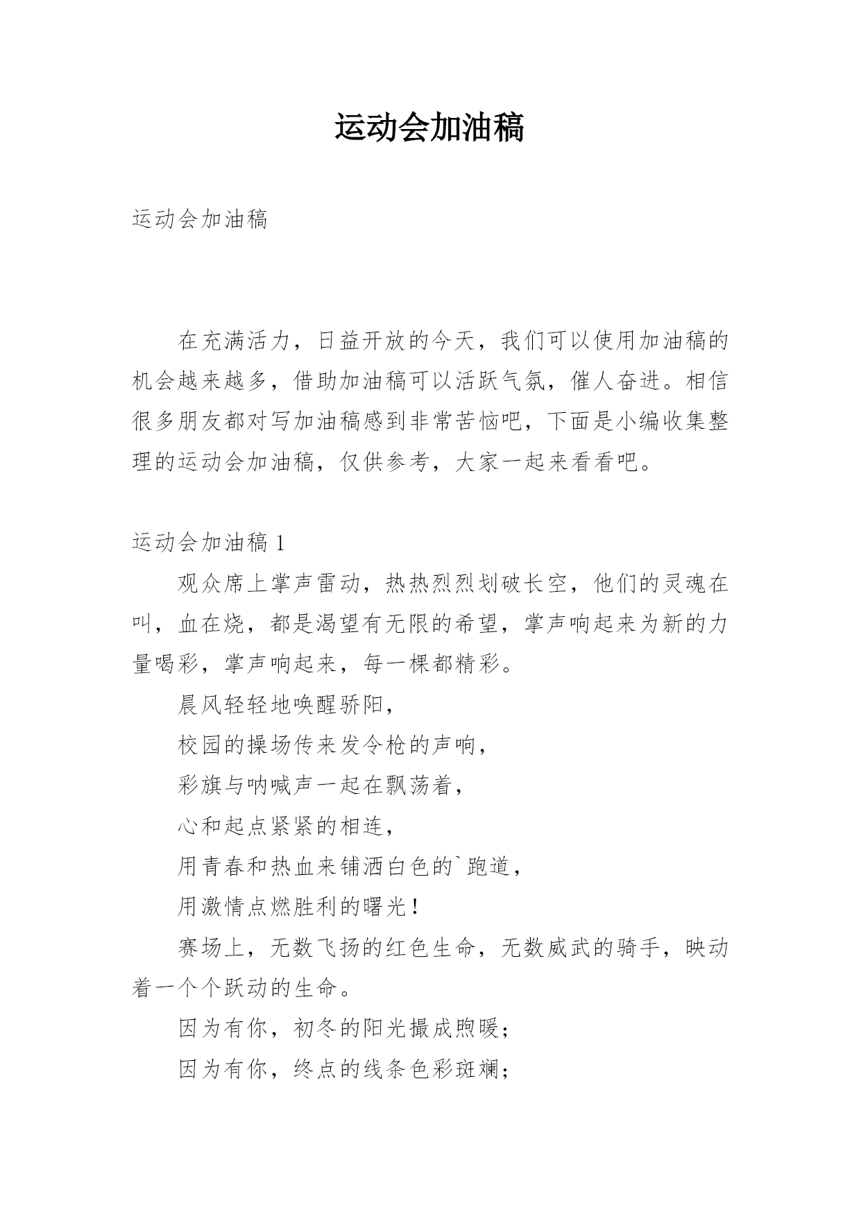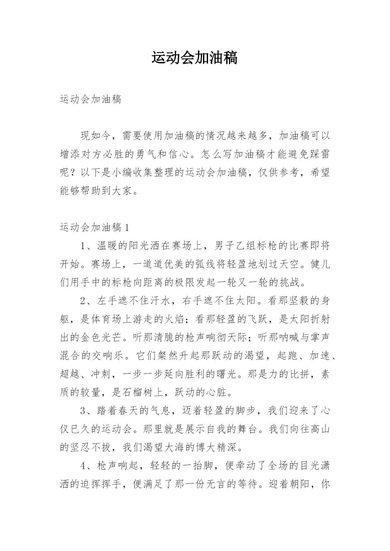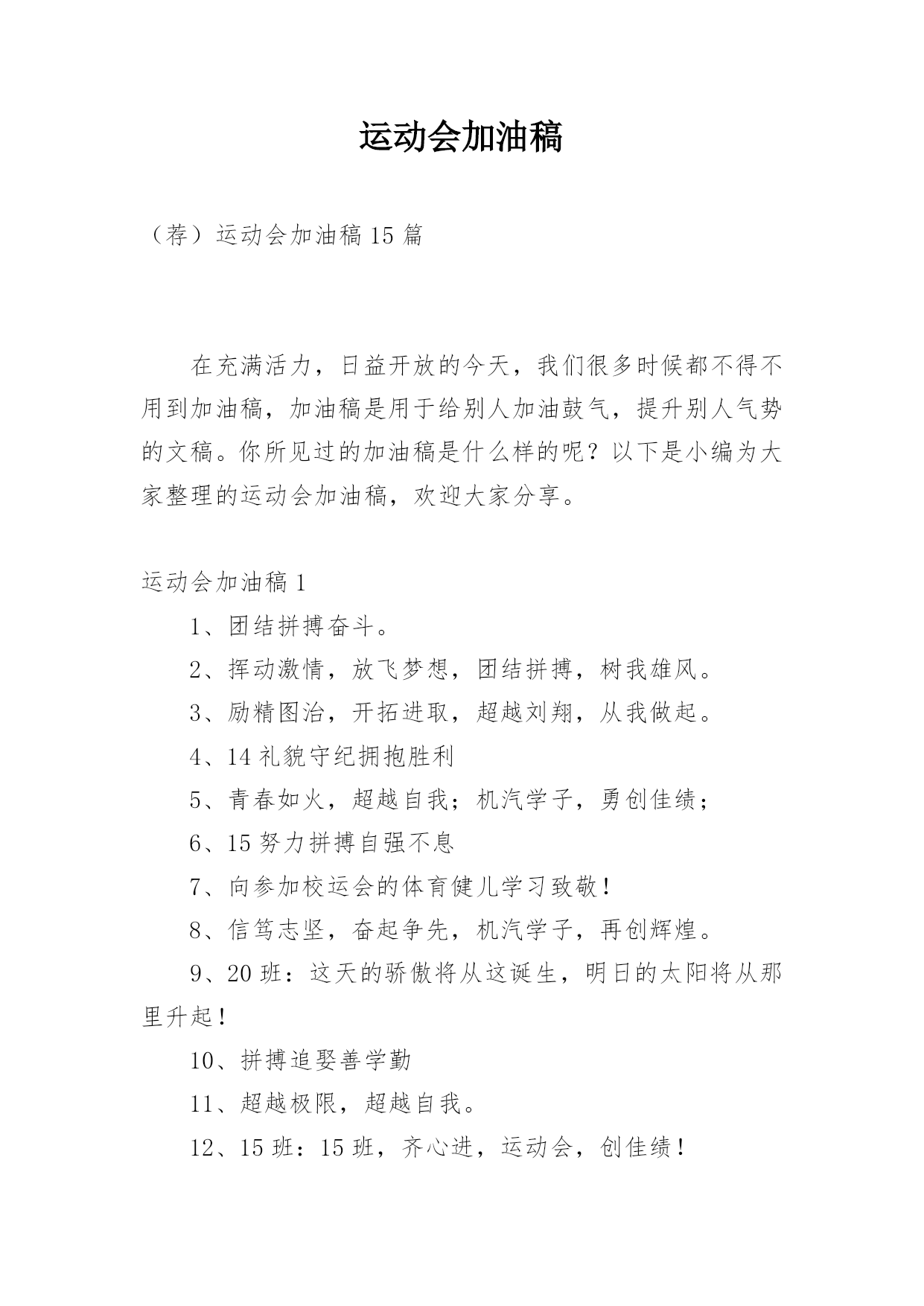 运动会加油稿运动会加油稿在不断进步的社会中,越来越多人会去使用加油稿,加油稿有着正向的鼓动作用。为了让您在写加油稿时更加简单方便,下面是小编帮大家整理的运动会加油稿,仅供参考,大家一起来看看吧。运动会加油稿1就让这灼目的骄阳,在你自信满满的.目光下黯然失,就让这绚烂的繁花,在你矫健挺拔的身姿前兀自凋零,就让这激情呐喊,为你添一分风雨无惧的豪迈,就让这连绵欢唱,为你奏一曲凯旋之歌,向前冲刺吧!勇敢的运动员们!运动会加油稿2今日的你们英姿飒爽,今日的.你们一马当先。不要放下,不要气馁。相信自己,你是最棒的!时