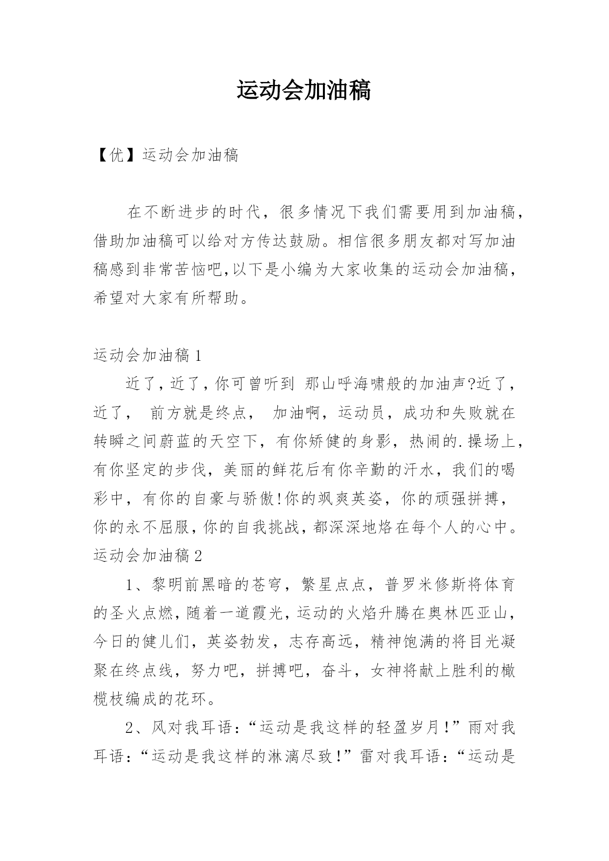 运动会加油稿【优】运动会加油稿在不断进步的时代,很多情况下我们需要用到加油稿,借助加油稿可以给对方传达鼓励。相信很多朋友都对写加油稿感到非常苦恼吧,以下是小编为大家收集的运动会加油稿,希望对大家有所帮助。运动会加油稿1近了,近了,你可曾听到那山呼海啸般的加油声?近了,近了,前方就是终点,加油啊,运动员,成功和失败就在转瞬之间蔚蓝的天空下,有你矫健的身影,热闹的.操场上,有你坚定的步伐,美丽的鲜花后有你辛勤的汗水,我们的喝彩中,有你的自豪与骄傲!你的飒爽英姿,你的顽强拼搏,你的永不屈服,你的自我挑战,都深深