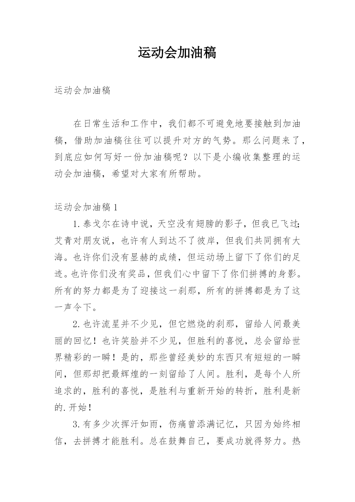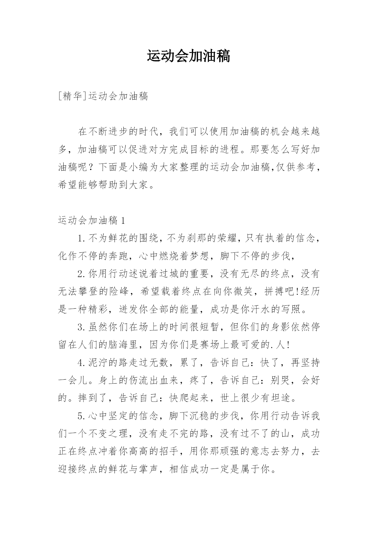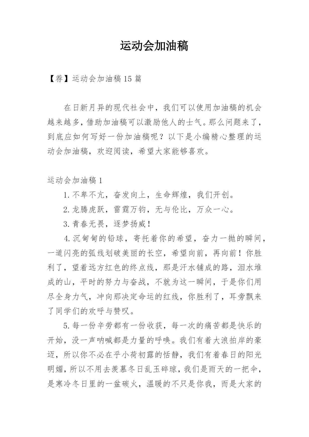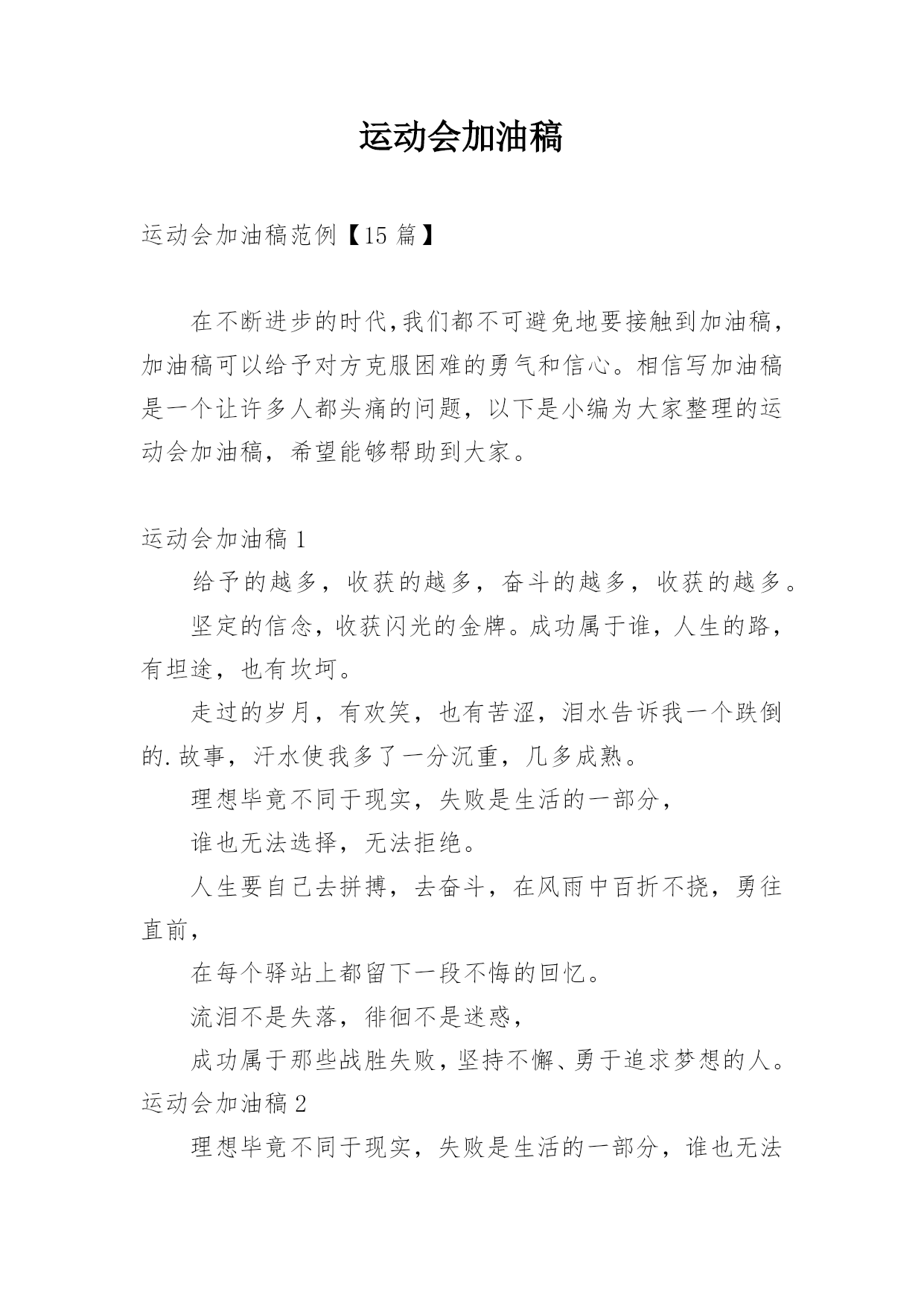 运动会加油稿运动会加油稿范例【15篇】在不断进步的时代,我们都不可避免地要接触到加油稿,加油稿可以给予对方克服困难的勇气和信心。相信写加油稿是一个让许多人都头痛的问题,以下是小编为大家整理的运动会加油稿,希望能够帮助到大家。运动会加油稿1给予的越多,收获的越多,奋斗的越多,收获的越多。坚定的信念,收获闪光的金牌。成功属于谁,人生的路,有坦途,也有坎坷。走过的岁月,有欢笑,也有苦涩,泪水告诉我一个跌倒的.故事,汗水使我多了一分沉重,几多成熟。理想毕竟不同于现实,失败是生活的一部分,谁也无法选择,无法拒绝。人