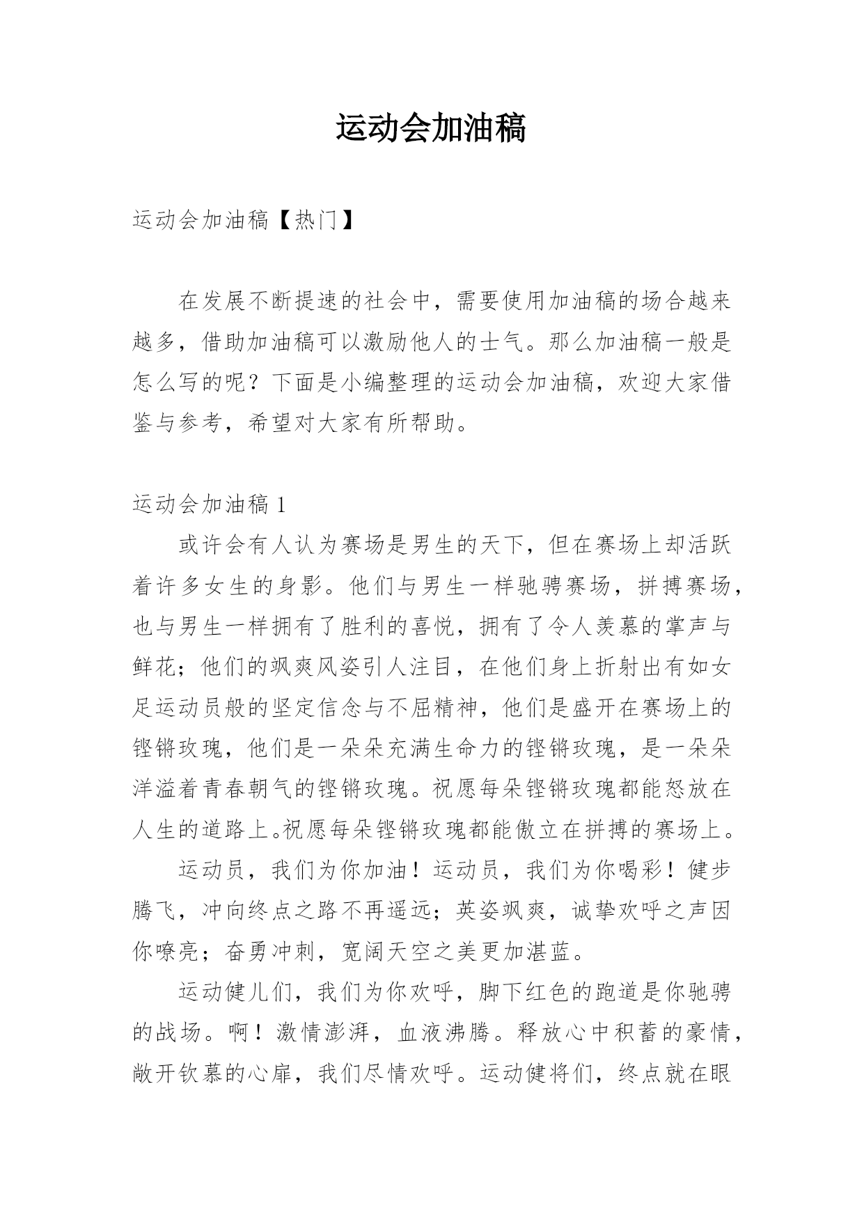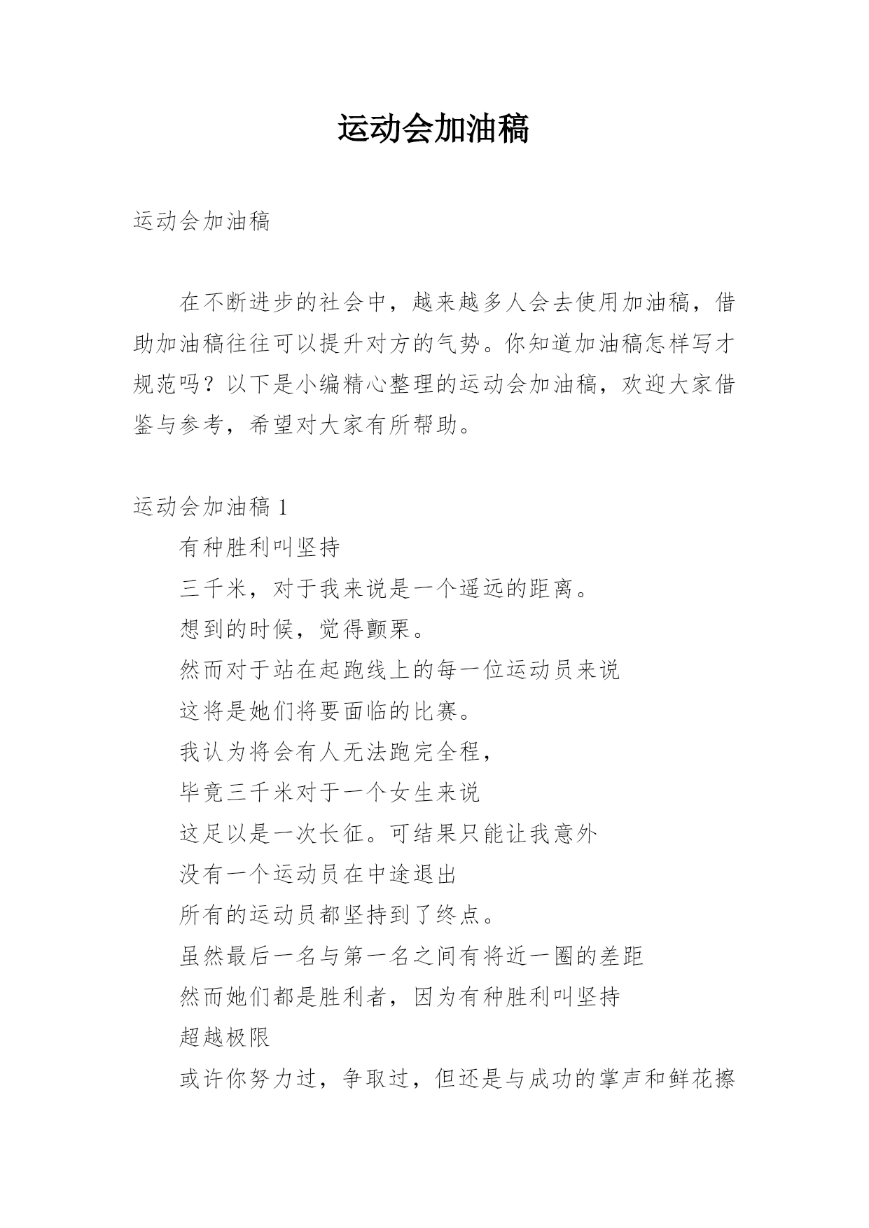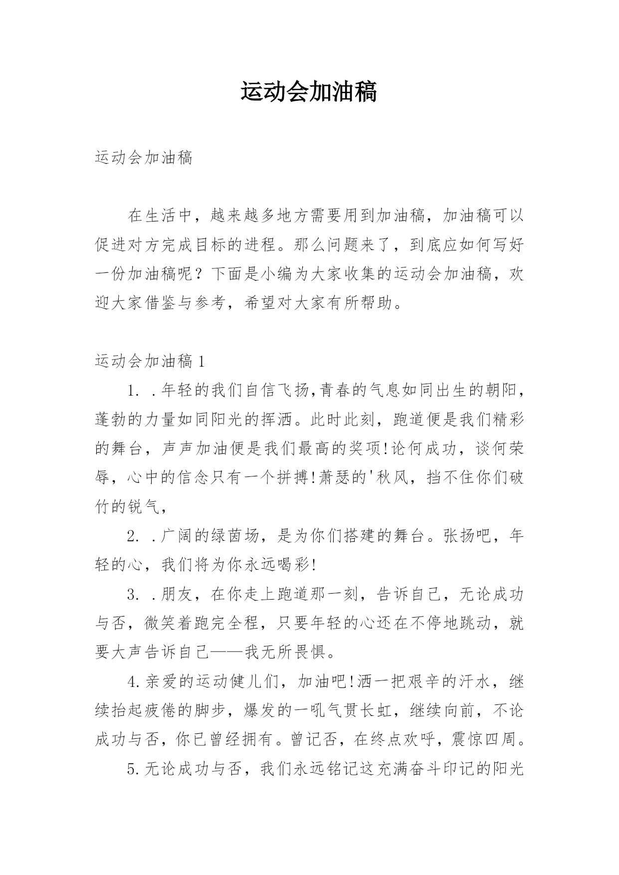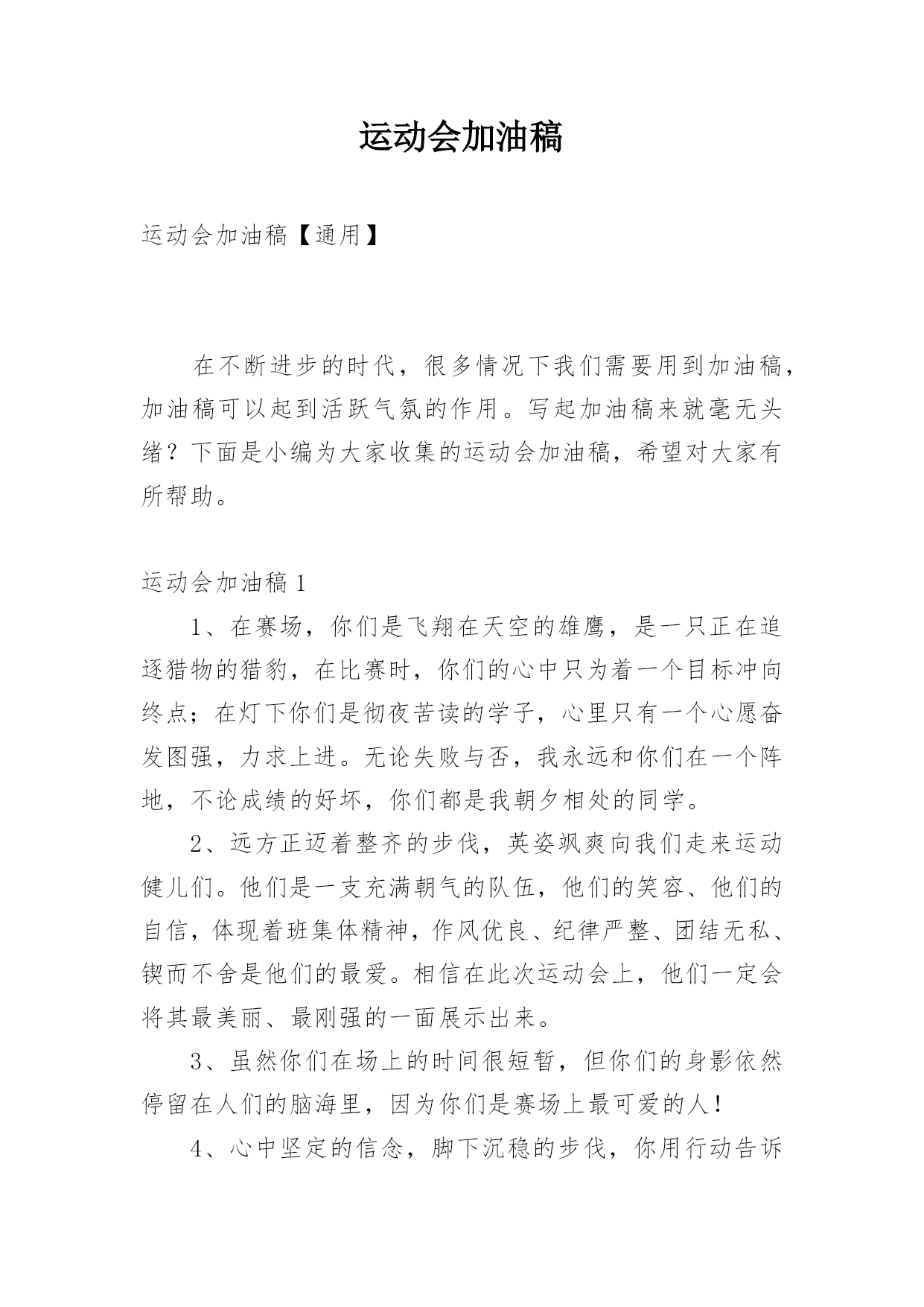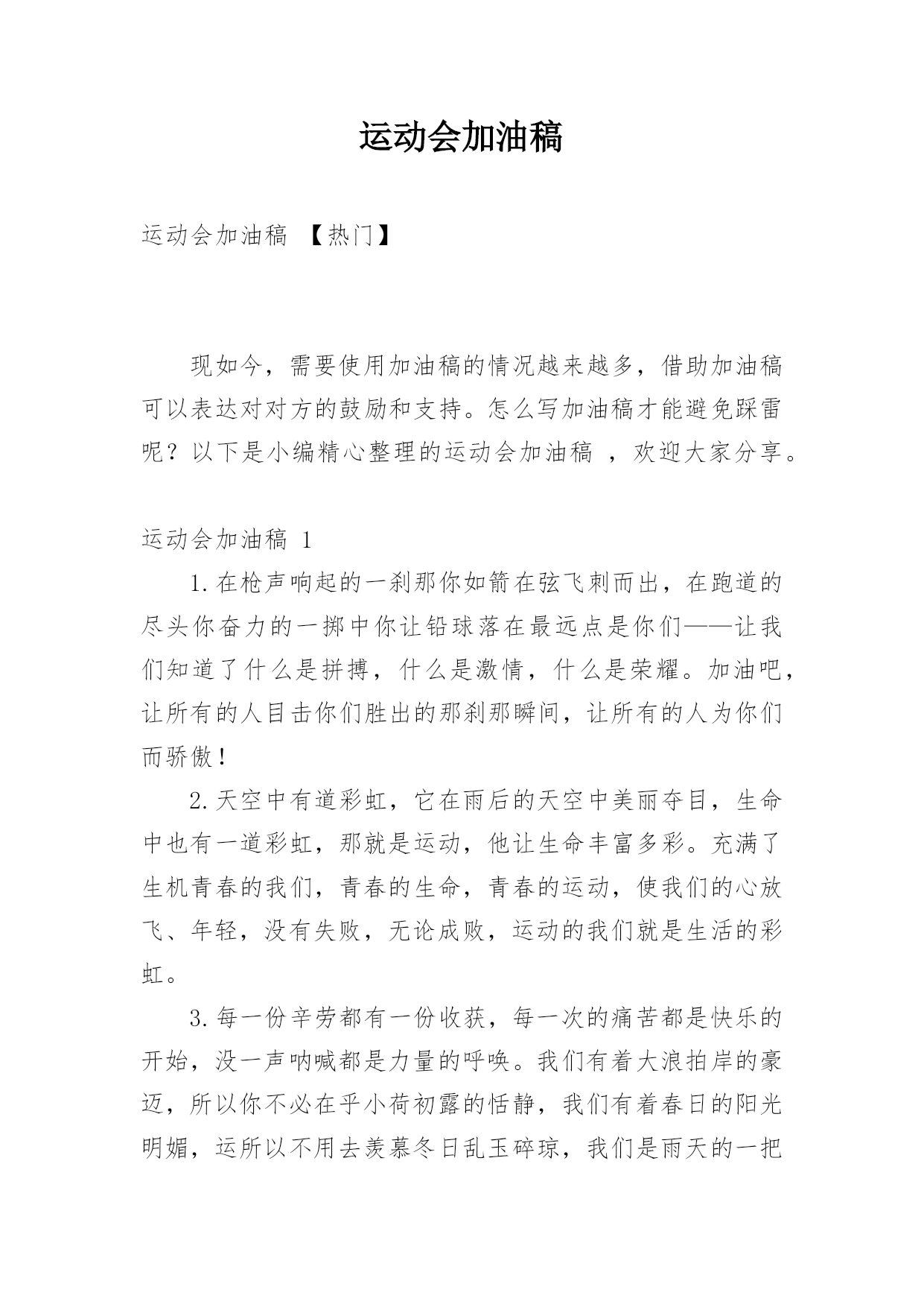 运动会加油稿运动会加油稿范例【15篇】在不断进步的时代,我们都不可避免地要接触到加油稿,加油稿可以给予对方克服困难的勇气和信心。相信写加油稿是一个让许多人都头痛的问题,以下是小编为大家整理的运动会加油稿,希望能够帮助到大家。运动会加油稿1给予的越多,收获的越多,奋斗的越多,收获的越多。坚定的信念,收获闪光的金牌。成功属于谁,人生的路,有坦途,也有坎坷。走过的岁月,有欢笑,也有苦涩,泪水告诉我一个跌倒的.故事,汗水使我多了一分沉重,几多成熟。理想毕竟不同于现实,失败是生活的一部分,谁也无法选择,无法拒绝。人