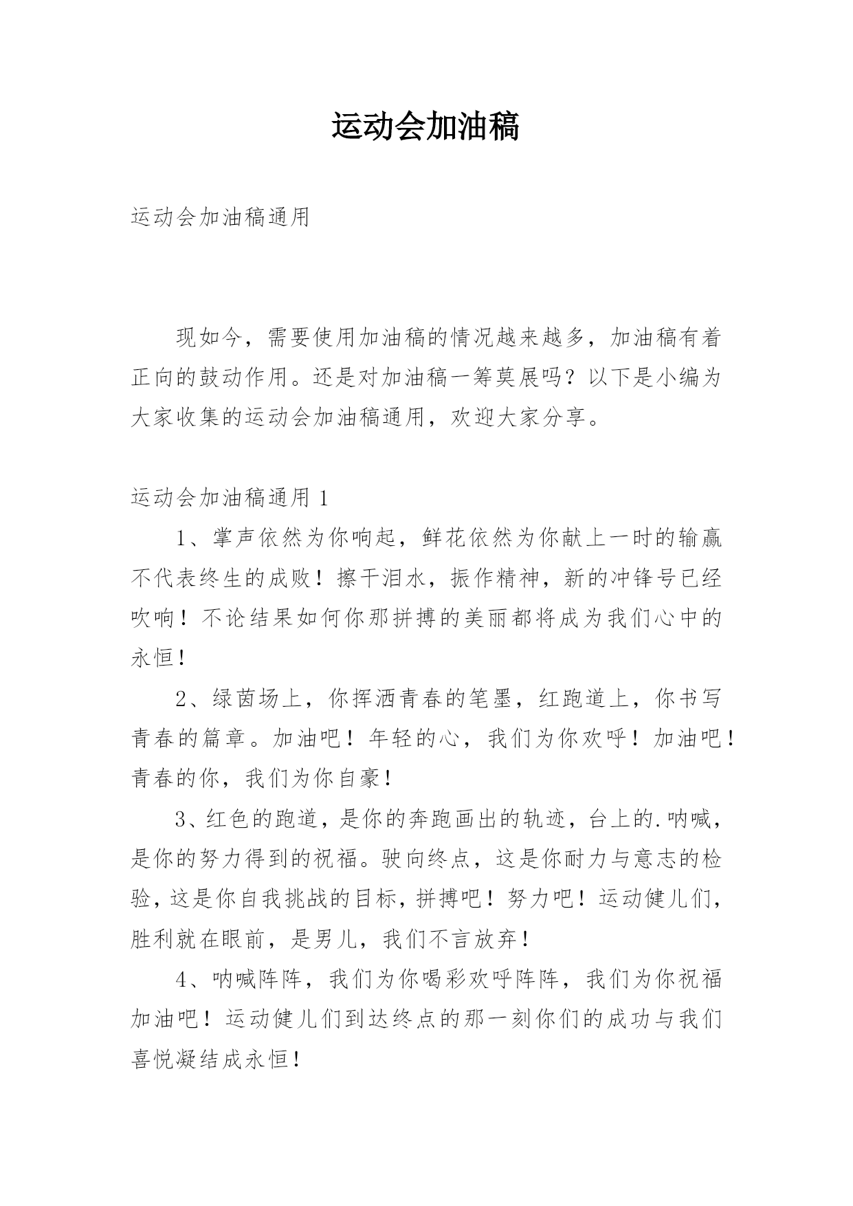 运动会加油稿运动会加油稿通用现如今,需要使用加油稿的情况越来越多,加油稿有着正向的鼓动作用。还是对加油稿一筹莫展吗?以下是小编为大家收集的运动会加油稿通用,欢迎大家分享。运动会加油稿通用11、掌声依然为你响起,鲜花依然为你献上一时的输赢不代表终生的成败!擦干泪水,振作精神,新的冲锋号已经吹响!不论结果如何你那拼搏的美丽都将成为我们心中的永恒!2、绿茵场上,你挥洒青春的笔墨,红跑道上,你书写青春的篇章。加油吧!年轻的心,我们为你欢呼!加油吧!青春的你,我们为你自豪!3、红色的跑道,是你的奔跑画出的轨迹,台上