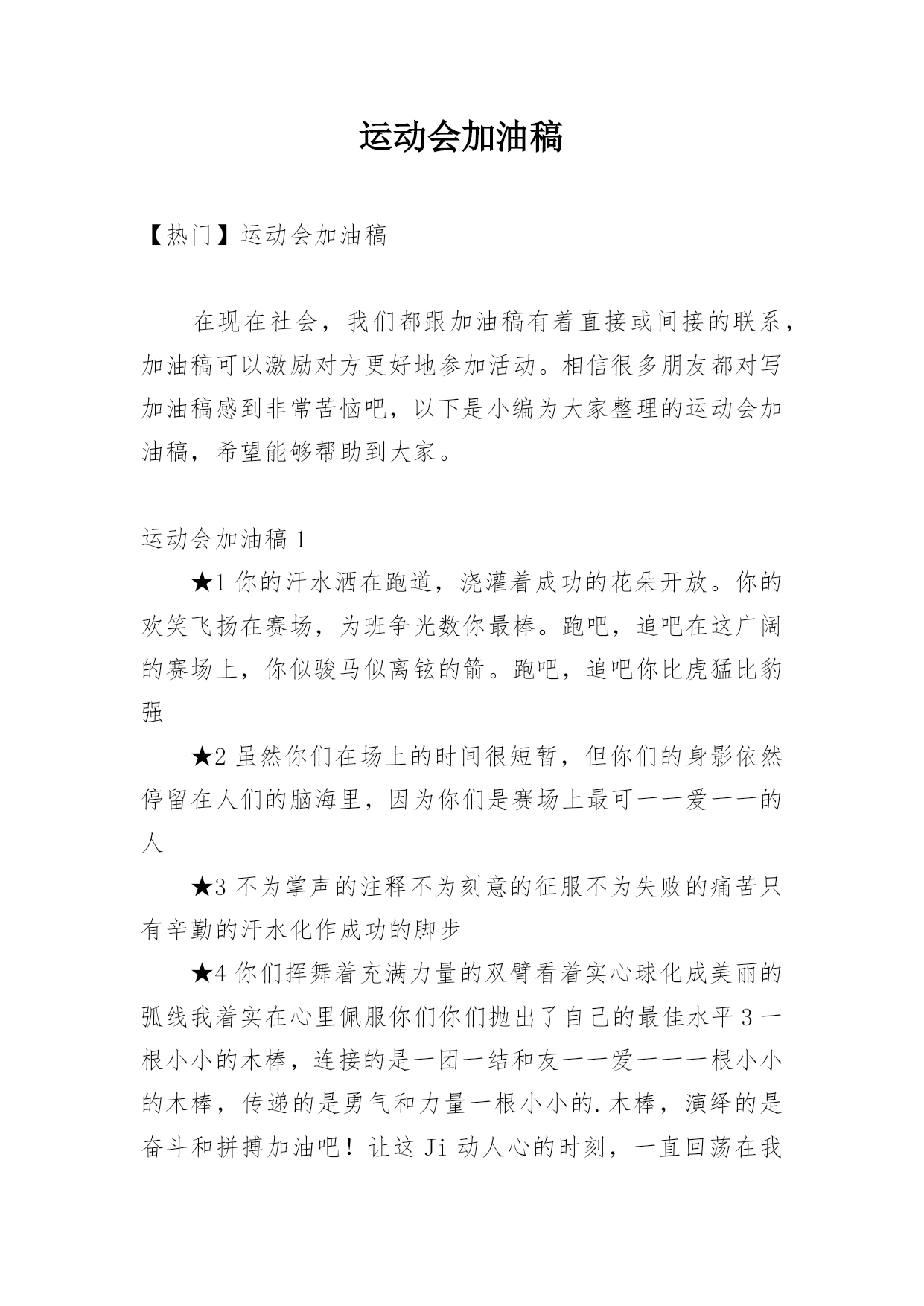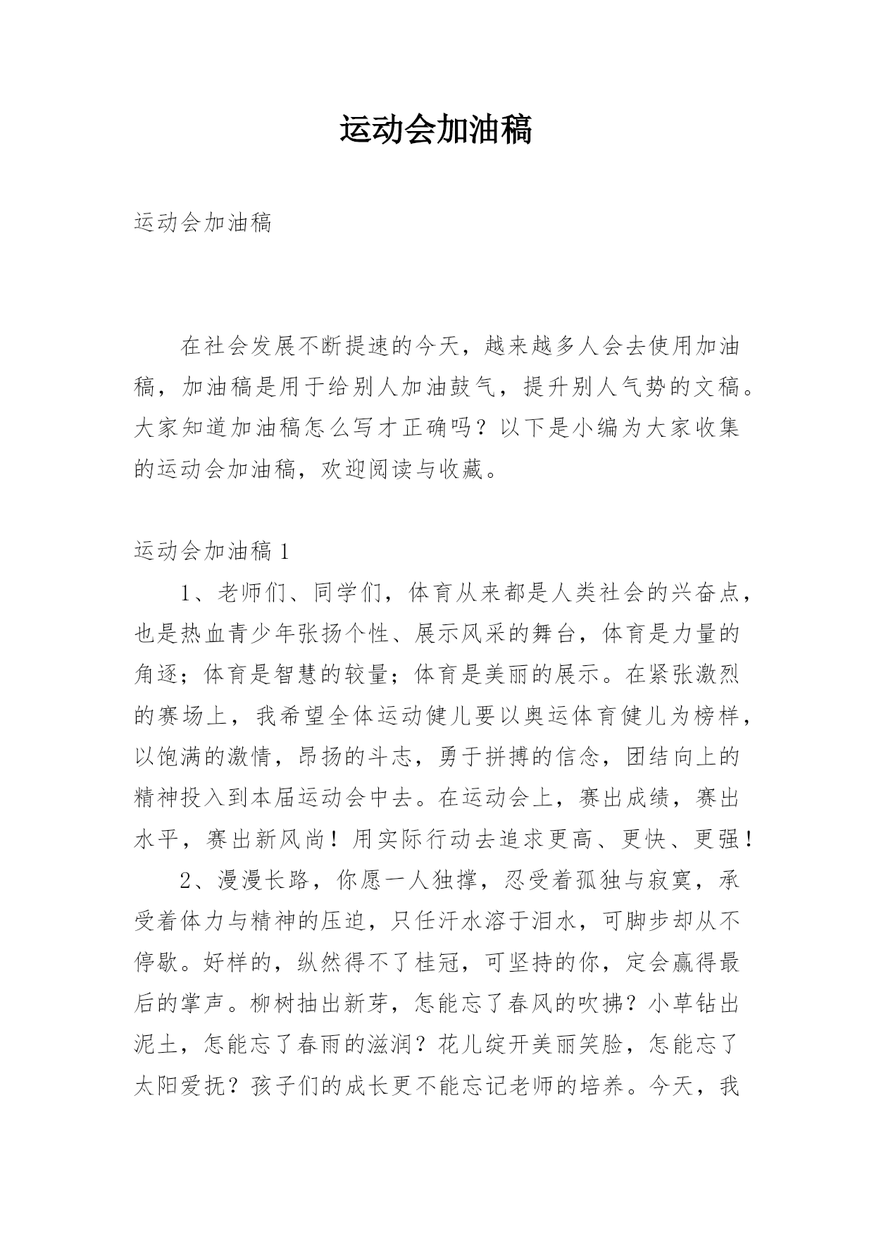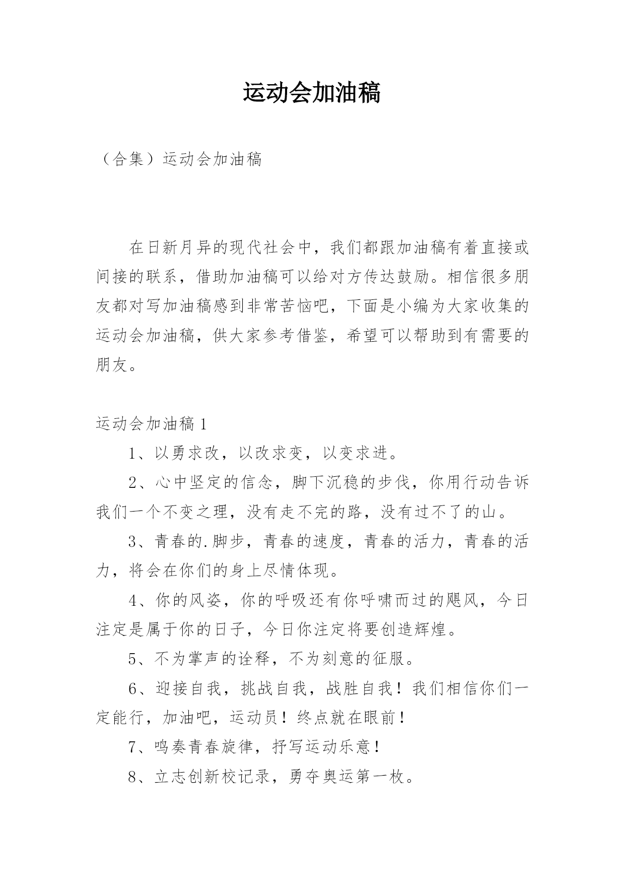 运动会加油稿(合集)运动会加油稿在日新月异的现代社会中,我们都跟加油稿有着直接或间接的联系,借助加油稿可以给对方传达鼓励。相信很多朋友都对写加油稿感到非常苦恼吧,下面是小编为大家收集的运动会加油稿,供大家参考借鉴,希望可以帮助到有需要的朋友。运动会加油稿11、以勇求改,以改求变,以变求进。2、心中坚定的信念,脚下沉稳的步伐,你用行动告诉我们一个不变之理,没有走不完的路,没有过不了的山。3、青春的.脚步,青春的速度,青春的活力,青春的活力,将会在你们的身上尽情体现。4、你的风姿,你的呼吸还有你呼啸而过的飓风