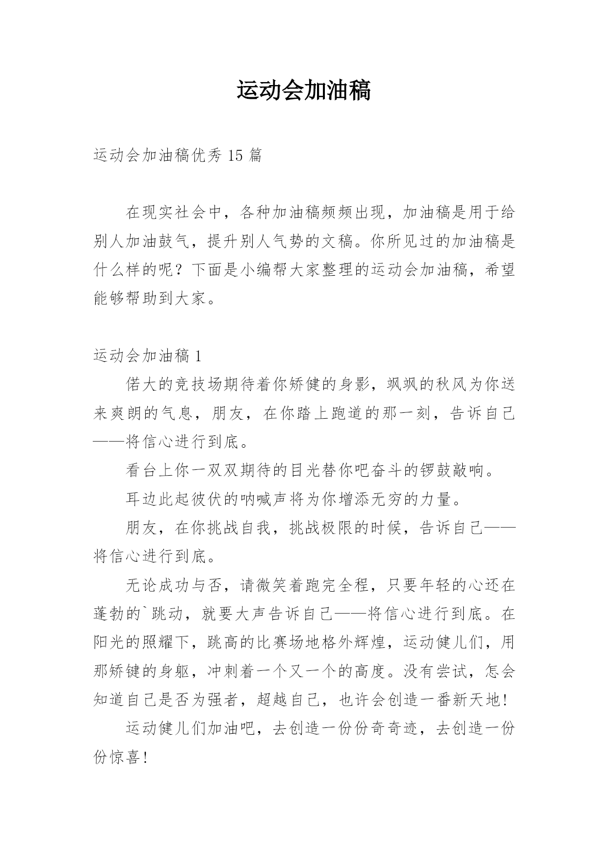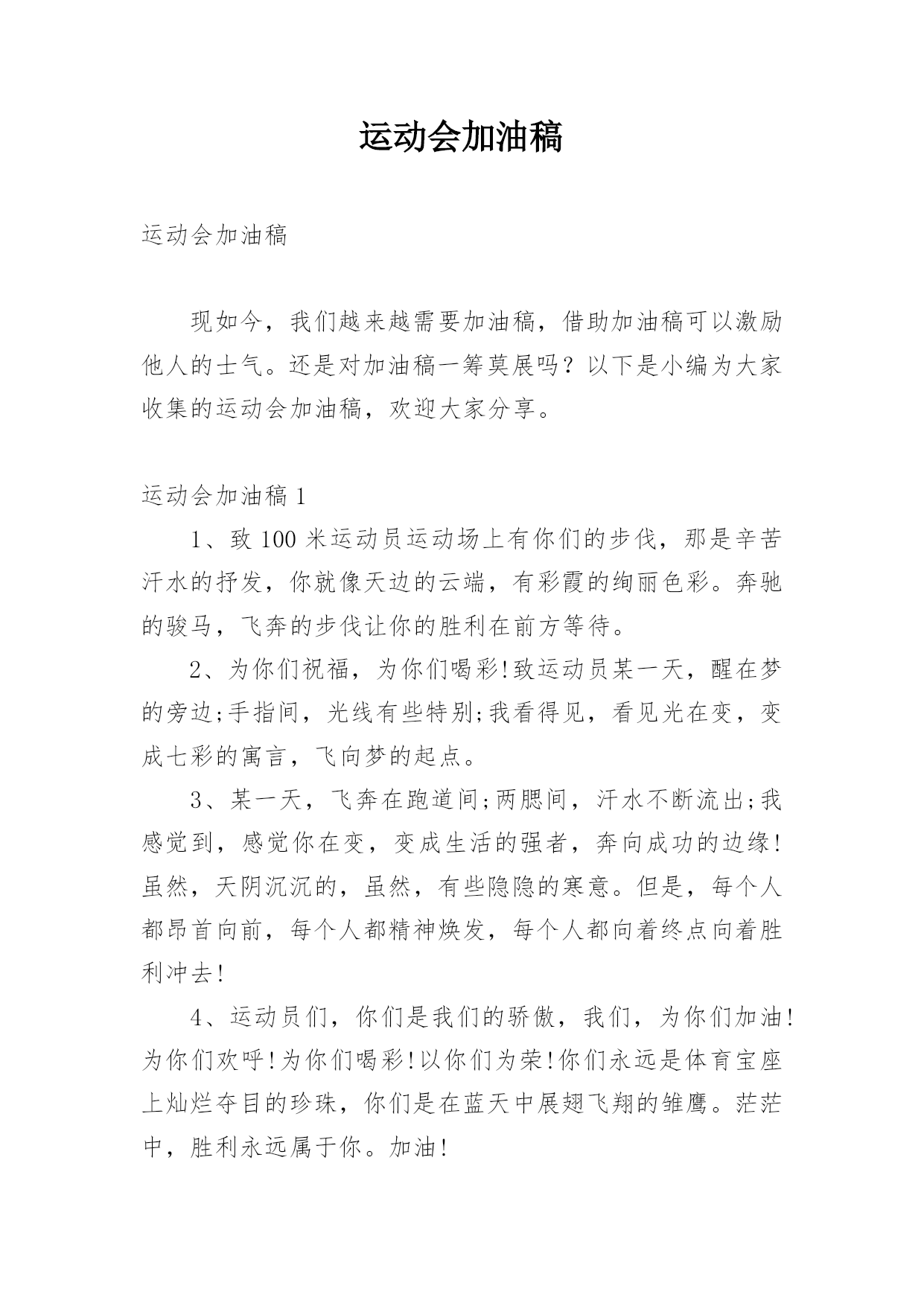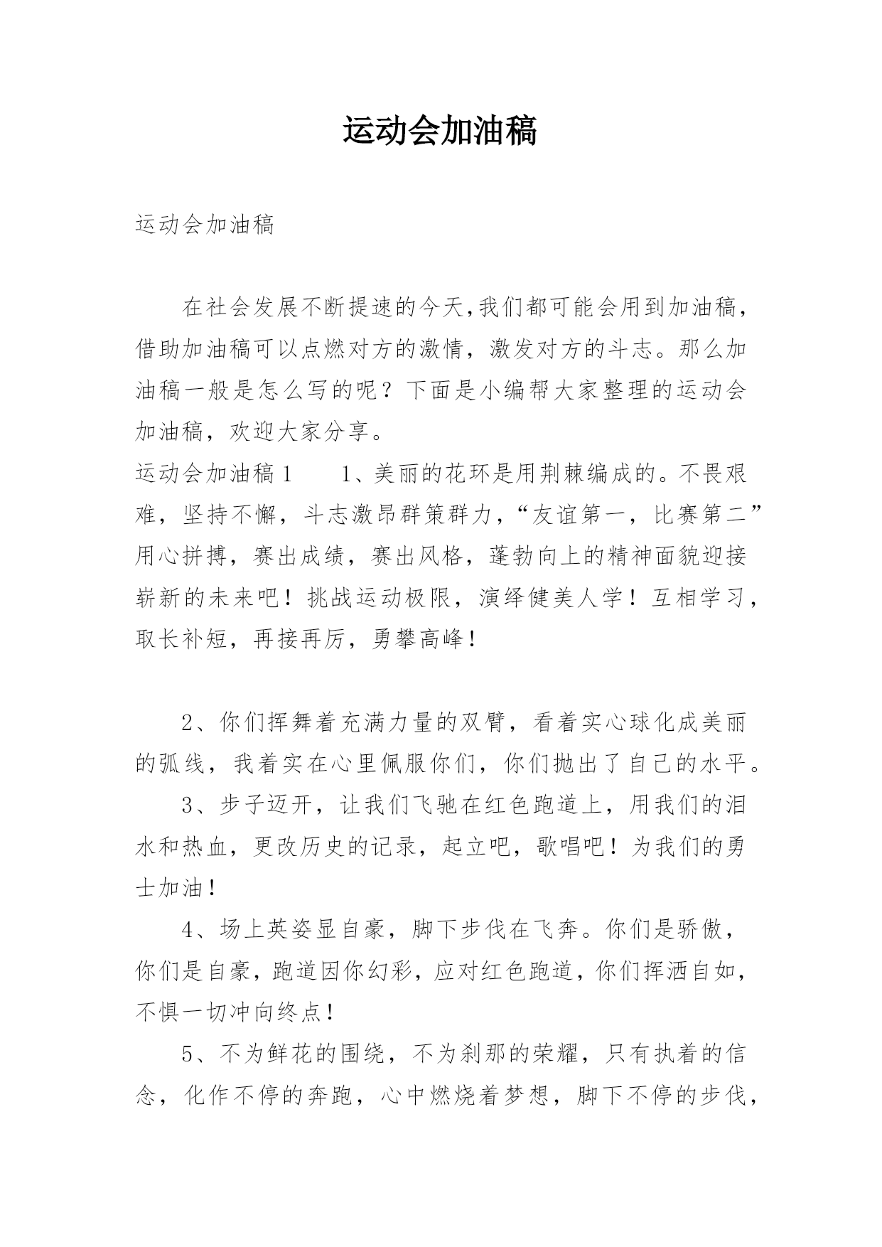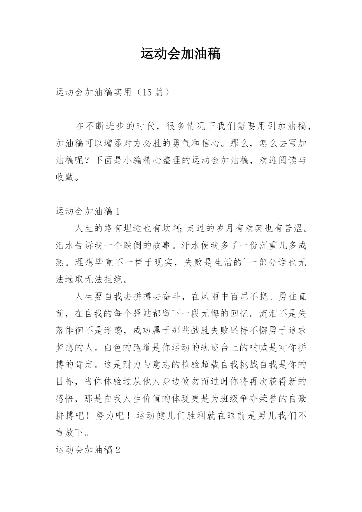 运动会加油稿(合集)运动会加油稿在日新月异的现代社会中,我们都跟加油稿有着直接或间接的联系,借助加油稿可以给对方传达鼓励。相信很多朋友都对写加油稿感到非常苦恼吧,下面是小编为大家收集的运动会加油稿,供大家参考借鉴,希望可以帮助到有需要的朋友。运动会加油稿11、以勇求改,以改求变,以变求进。2、心中坚定的信念,脚下沉稳的步伐,你用行动告诉我们一个不变之理,没有走不完的路,没有过不了的山。3、青春的.脚步,青春的速度,青春的活力,青春的活力,将会在你们的身上尽情体现。4、你的风姿,你的呼吸还有你呼啸而过的飓风