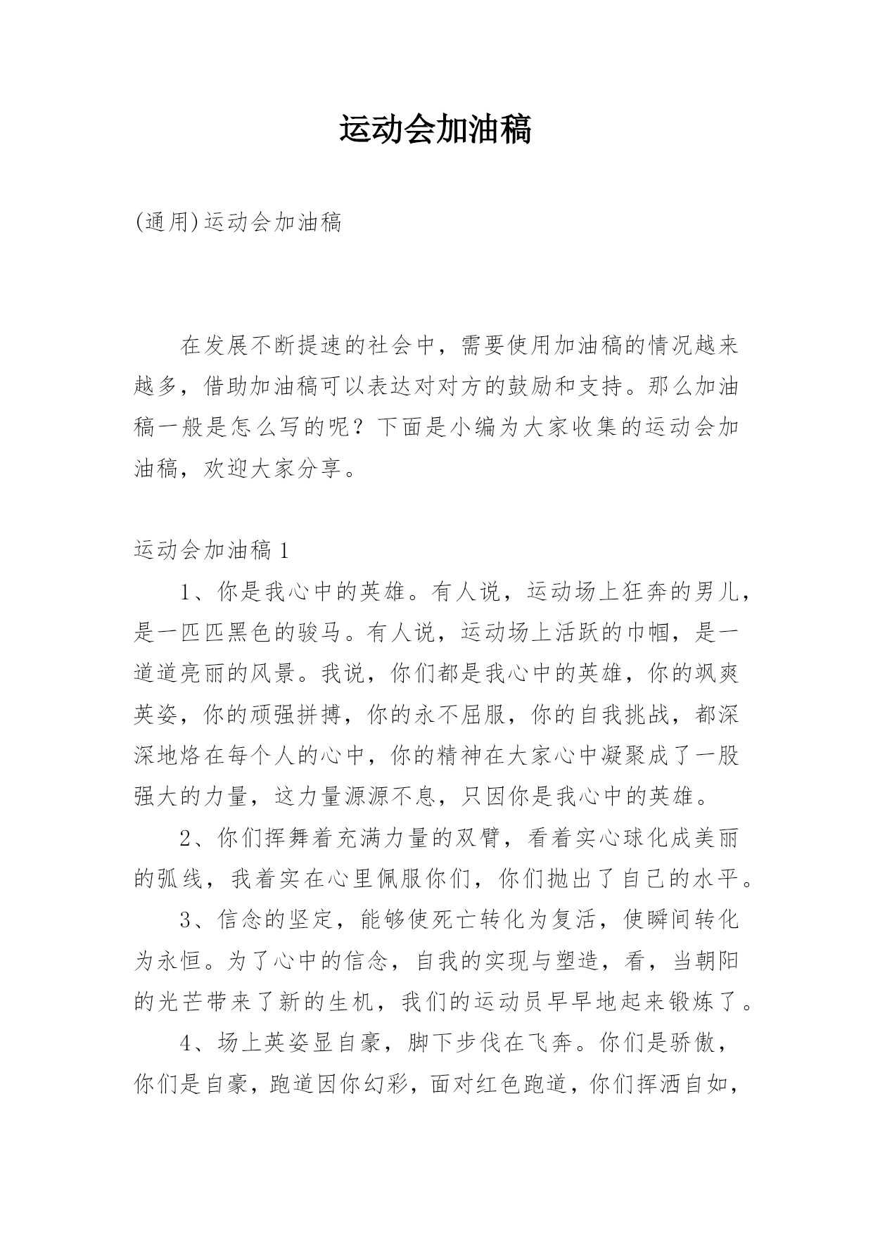 运动会加油稿(通用)运动会加油稿在发展不断提速的社会中,需要使用加油稿的情况越来越多,借助加油稿可以表达对对方的鼓励和支持。那么加油稿一般是怎么写的呢?下面是小编为大家收集的运动会加油稿,欢迎大家分享。运动会加油稿11、你是我心中的英雄。有人说,运动场上狂奔的男儿,是一匹匹黑色的骏马。有人说,运动场上活跃的巾帼,是一道道亮丽的风景。我说,你们都是我心中的英雄,你的飒爽英姿,你的顽强拼搏,你的永不屈服,你的自我挑战,都深深地烙在每个人的心中,你的精神在大家心中凝聚成了一股强大的力量,这力量源源不息,只因你是