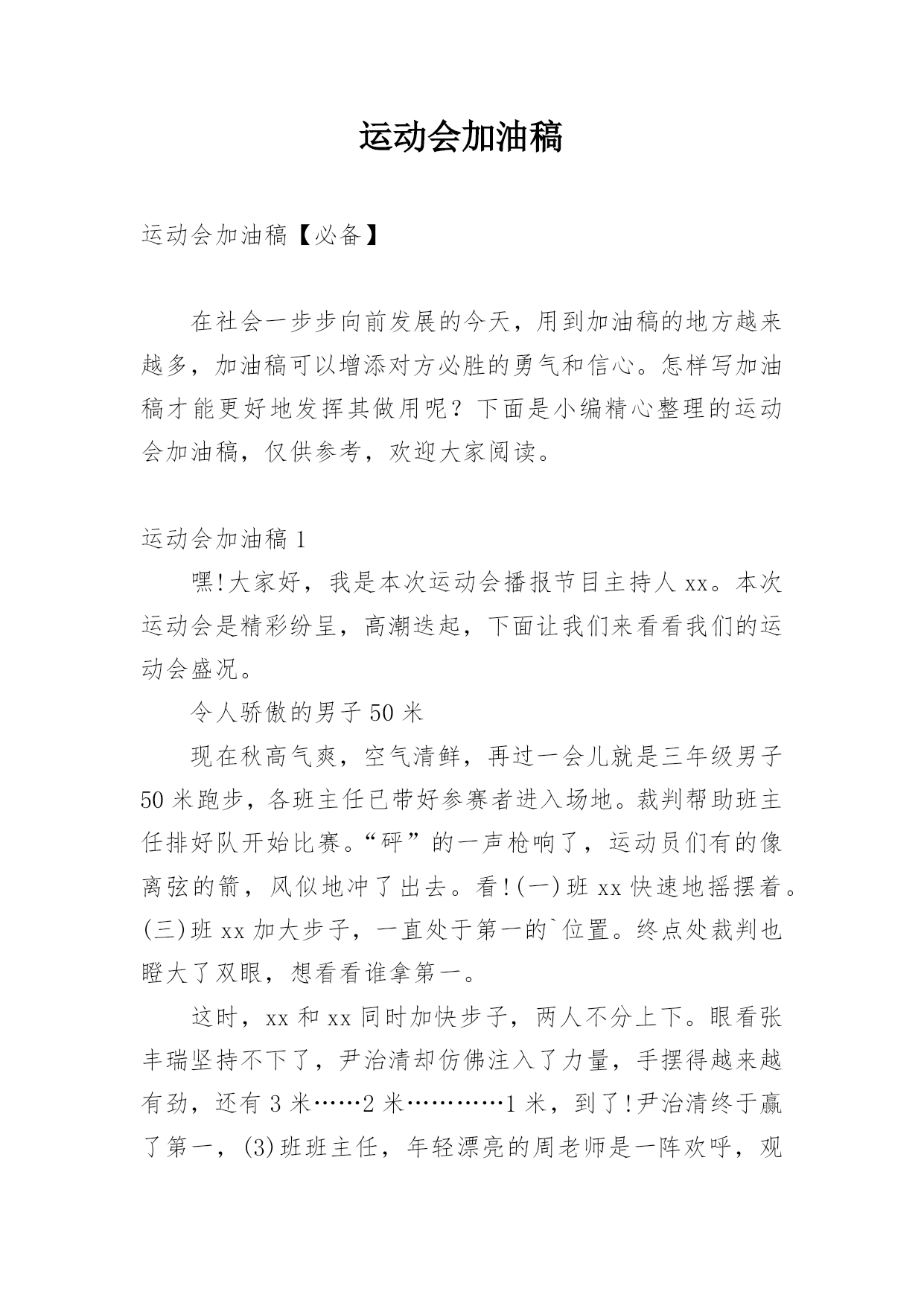 运动会加油稿运动会加油稿【必备】在社会一步步向前发展的今天,用到加油稿的地方越来越多,加油稿可以增添对方必胜的勇气和信心。怎样写加油稿才能更好地发挥其做用呢?下面是小编精心整理的运动会加油稿,仅供参考,欢迎大家阅读。运动会加油稿1嘿!大家好,我是本次运动会播报节目主持人xx。本次运动会是精彩纷呈,高潮迭起,下面让我们来看看我们的运动会盛况。令人骄傲的男子50米现在秋高气爽,空气清鲜,再过一会儿就是三年级男子50米跑步,各班主任已带好参赛者进入场地。裁判帮助班主任排好队开始比赛。“砰”的一声枪响了,运动员们