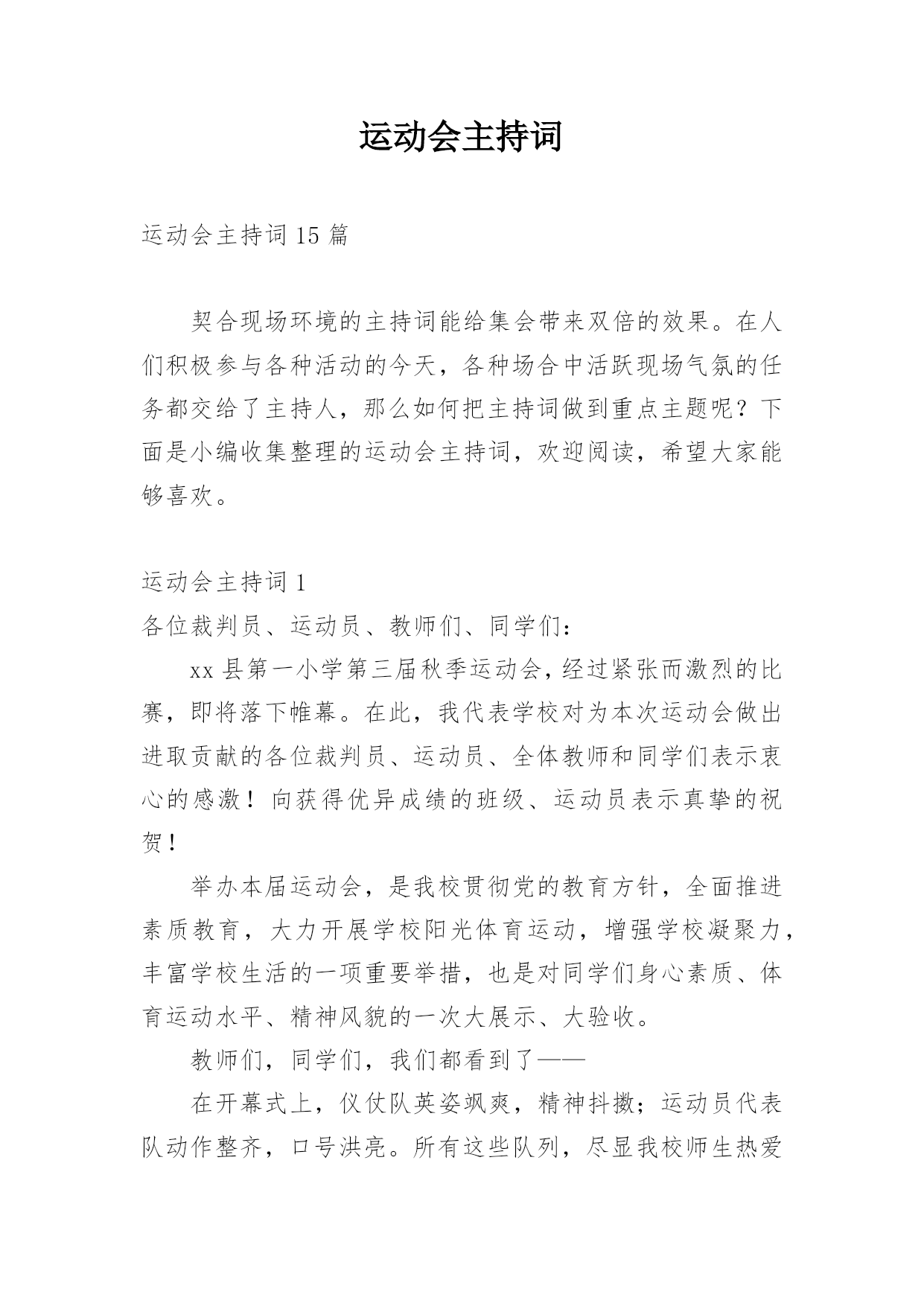 运动会主持词运动会主持词15篇契合现场环境的主持词能给集会带来双倍的效果。在人们积极参与各种活动的今天,各种场合中活跃现场气氛的任务都交给了主持人,那么如何把主持词做到重点主题呢?下面是小编收集整理的运动会主持词,欢迎阅读,希望大家能够喜欢。运动会主持词1各位裁判员、运动员、教师们、同学们:xx县第一小学第三届秋季运动会,经过紧张而激烈的比赛,即将落下帷幕。在此,我代表学校对为本次运动会做出进取贡献的各位裁判员、运动员、全体教师和同学们表示衷心的感激!向获得优异成绩的班级、运动员表示真挚的祝贺!举办本届运