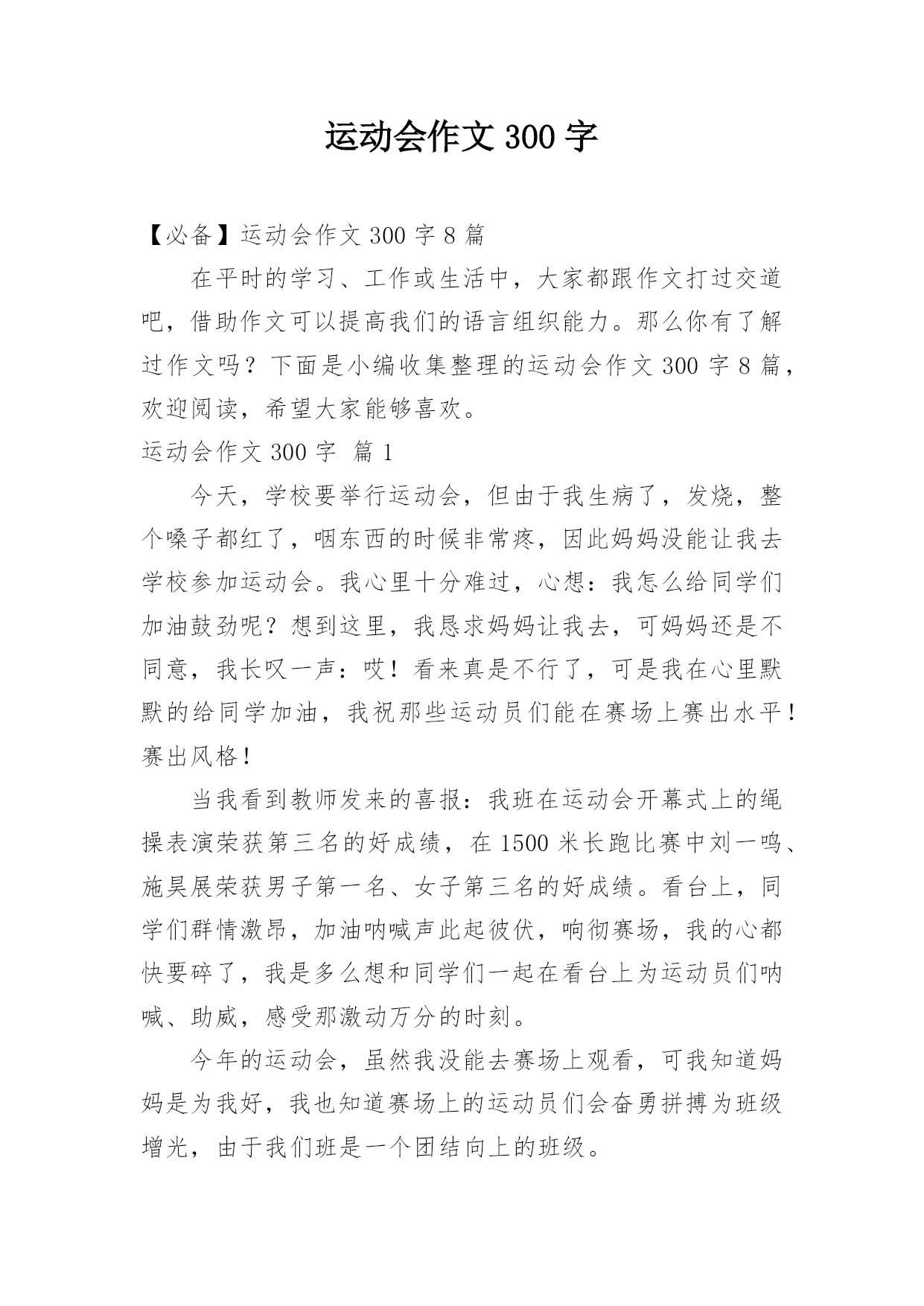 运动会作文300字【必备】运动会作文300字8篇在平时的学习、工作或生活中,大家都跟作文打过交道吧,借助作文可以提高我们的语言组织能力。那么你有了解过作文吗?下面是小编收集整理的运动会作文300字8篇,欢迎阅读,希望大家能够喜欢。运动会作文300字篇1今天,学校要举行运动会,但由于我生病了,发烧,整个嗓子都红了,咽东西的时候非常疼,因此妈妈没能让我去学校参加运动会。我心里十分难过,心想:我怎么给同学们加油鼓劲呢?想到这里,我恳求妈妈让我去,可妈妈还是不同意,我长叹一声:哎!看来真是不行了,可是我在心里默默