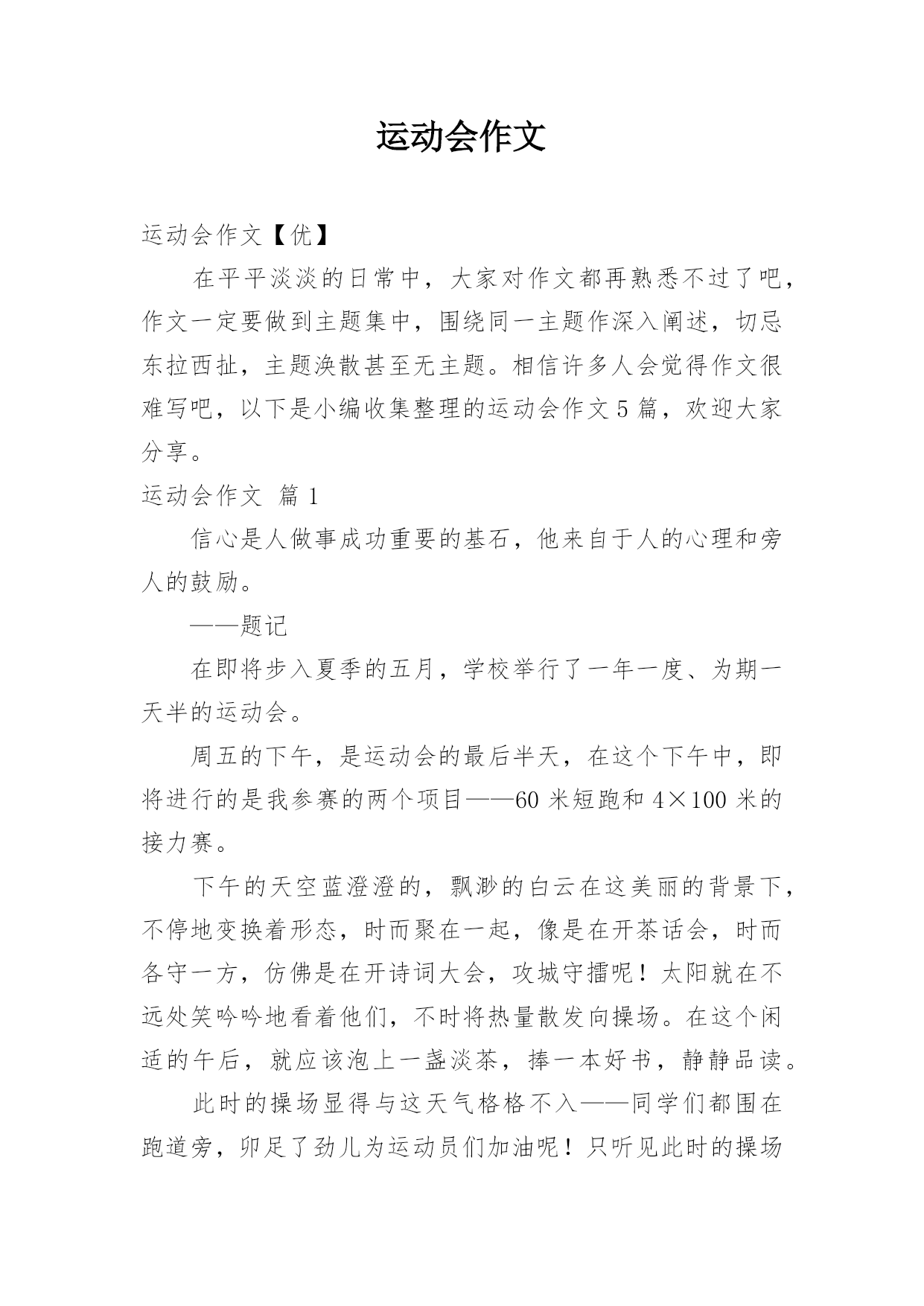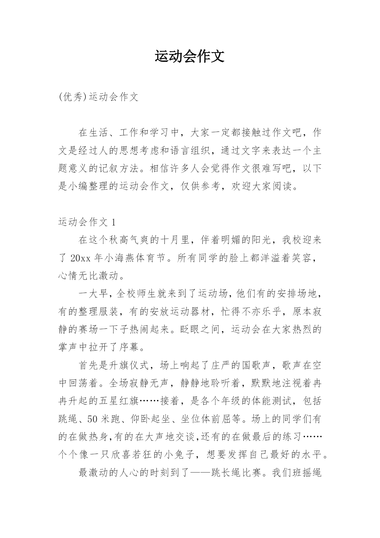 运动会作文(优秀)运动会作文在生活、工作和学习中,大家一定都接触过作文吧,作文是经过人的思想考虑和语言组织,通过文字来表达一个主题意义的记叙方法。相信许多人会觉得作文很难写吧,以下是小编整理的运动会作文,仅供参考,欢迎大家阅读。运动会作文1在这个秋高气爽的十月里,伴着明媚的阳光,我校迎来了20xx年小海燕体育节。所有同学的脸上都洋溢着笑容,心情无比激动。一大早,全校师生就来到了运动场,他们有的安排场地,有的整理服装,有的安放运动器材,忙得不亦乐乎,原本寂静的赛场一下子热闹起来。眨眼之间,运动会在大家热烈的