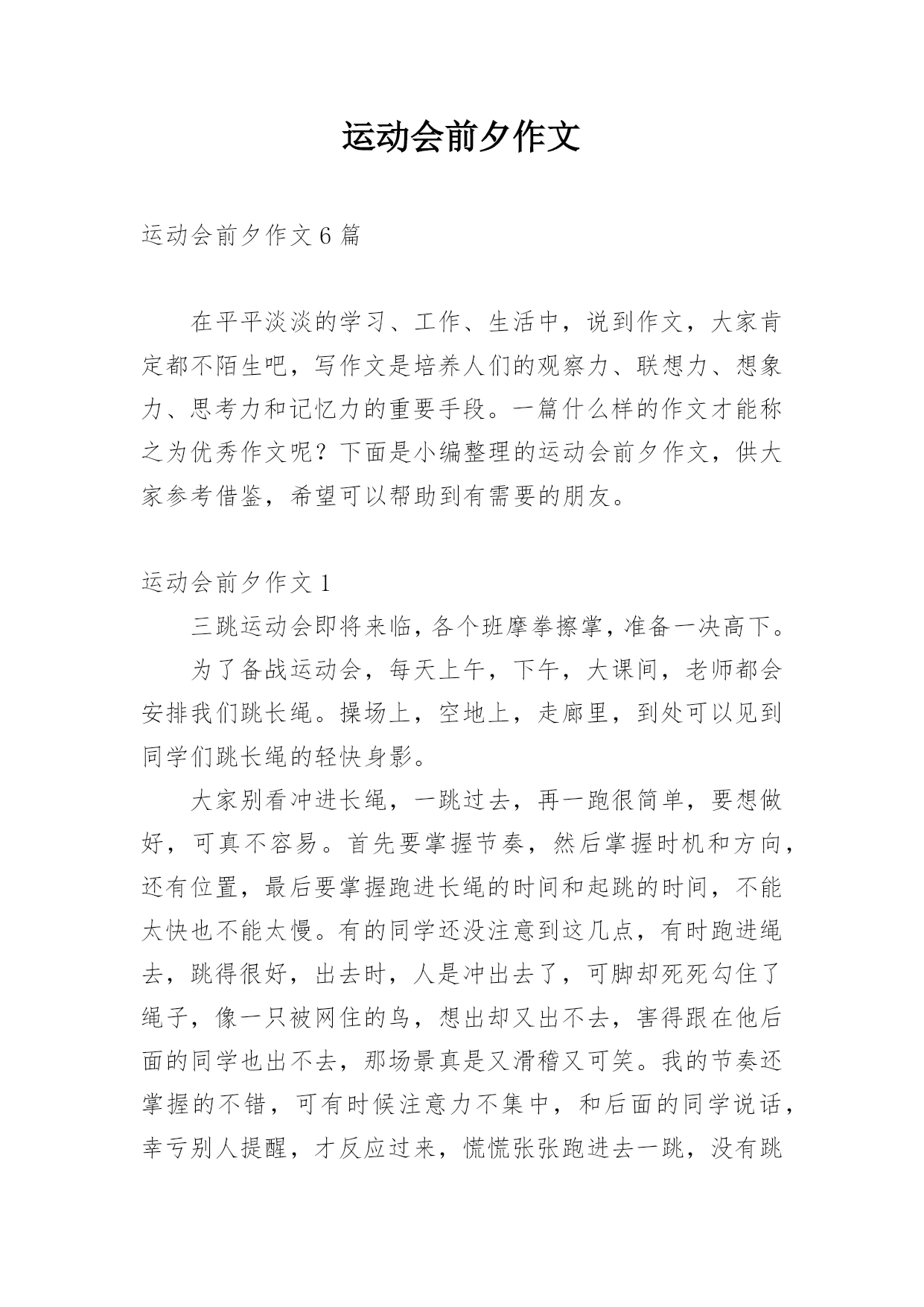 运动会前夕作文运动会前夕作文6篇在平平淡淡的学习、工作、生活中,说到作文,大家肯定都不陌生吧,写作文是培养人们的观察力、联想力、想象力、思考力和记忆力的重要手段。一篇什么样的作文才能称之为优秀作文呢?下面是小编整理的运动会前夕作文,供大家参考借鉴,希望可以帮助到有需要的朋友。运动会前夕作文1三跳运动会即将来临,各个班摩拳擦掌,准备一决高下。为了备战运动会,每天上午,下午,大课间,老师都会安排我们跳长绳。操场上,空地上,走廊里,到处可以见到同学们跳长绳的轻快身影。大家别看冲进长绳,一跳过去,再一跑很简单,要