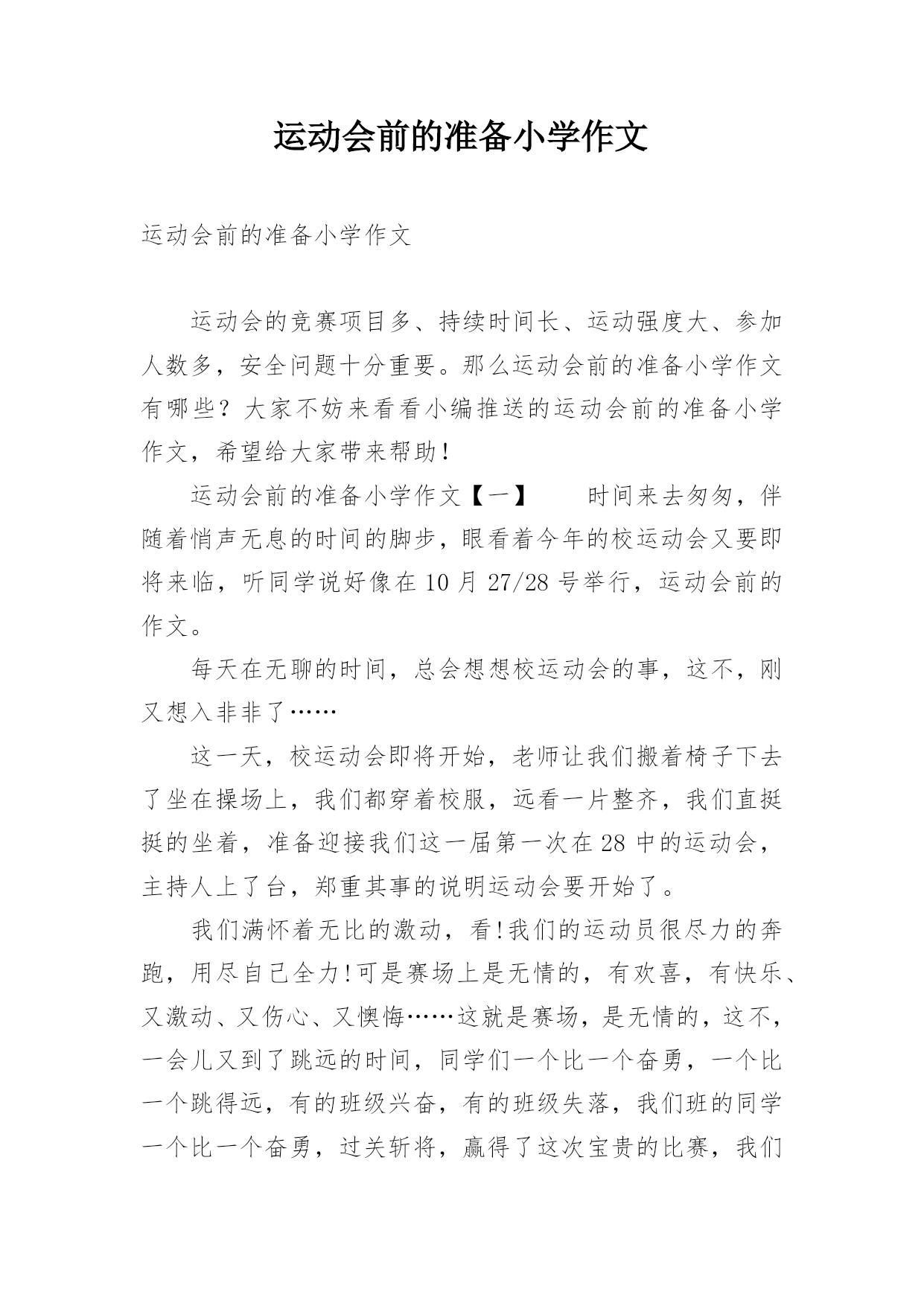 运动会前的准备小学作文运动会前的准备小学作文运动会的竞赛项目多、持续时间长、运动强度大、参加人数多,安全问题十分重要。那么运动会前的准备小学作文有哪些?大家不妨来看看小编推送的运动会前的准备小学作文,希望给大家带来帮助!运动会前的准备小学作文【一】时间来去匆匆,伴随着悄声无息的时间的脚步,眼看着今年的校运动会又要即将来临,听同学说好像在10月27/28号举行,运动会前的作文。每天在无聊的时间,总会想想校运动会的事,这不,刚又想入非非了……这一天,校运动会即将开始,老师让我们搬着椅子下去了坐在操场上,我们都