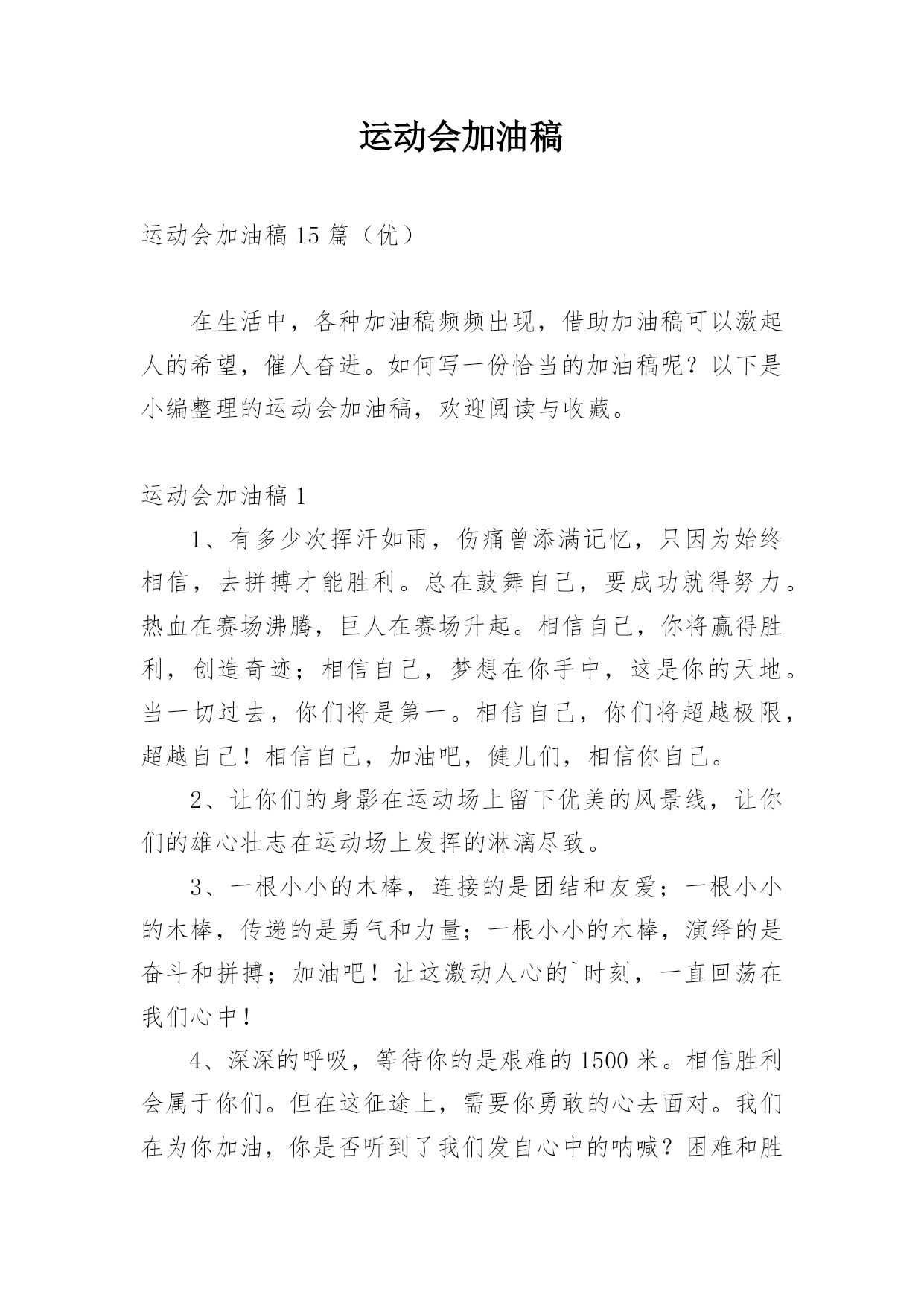 运动会加油稿运动会加油稿15篇(优)在生活中,各种加油稿频频出现,借助加油稿可以激起人的希望,催人奋进。如何写一份恰当的加油稿呢?以下是小编整理的运动会加油稿,欢迎阅读与收藏。运动会加油稿11、有多少次挥汗如雨,伤痛曾添满记忆,只因为始终相信,去拼搏才能胜利。总在鼓舞自己,要成功就得努力。热血在赛场沸腾,巨人在赛场升起。相信自己,你将赢得胜利,创造奇迹;相信自己,梦想在你手中,这是你的天地。当一切过去,你们将是第一。相信自己,你们将超越极限,超越自己!相信自己,加油吧,健儿们,相信你自己。2、让你们的身影