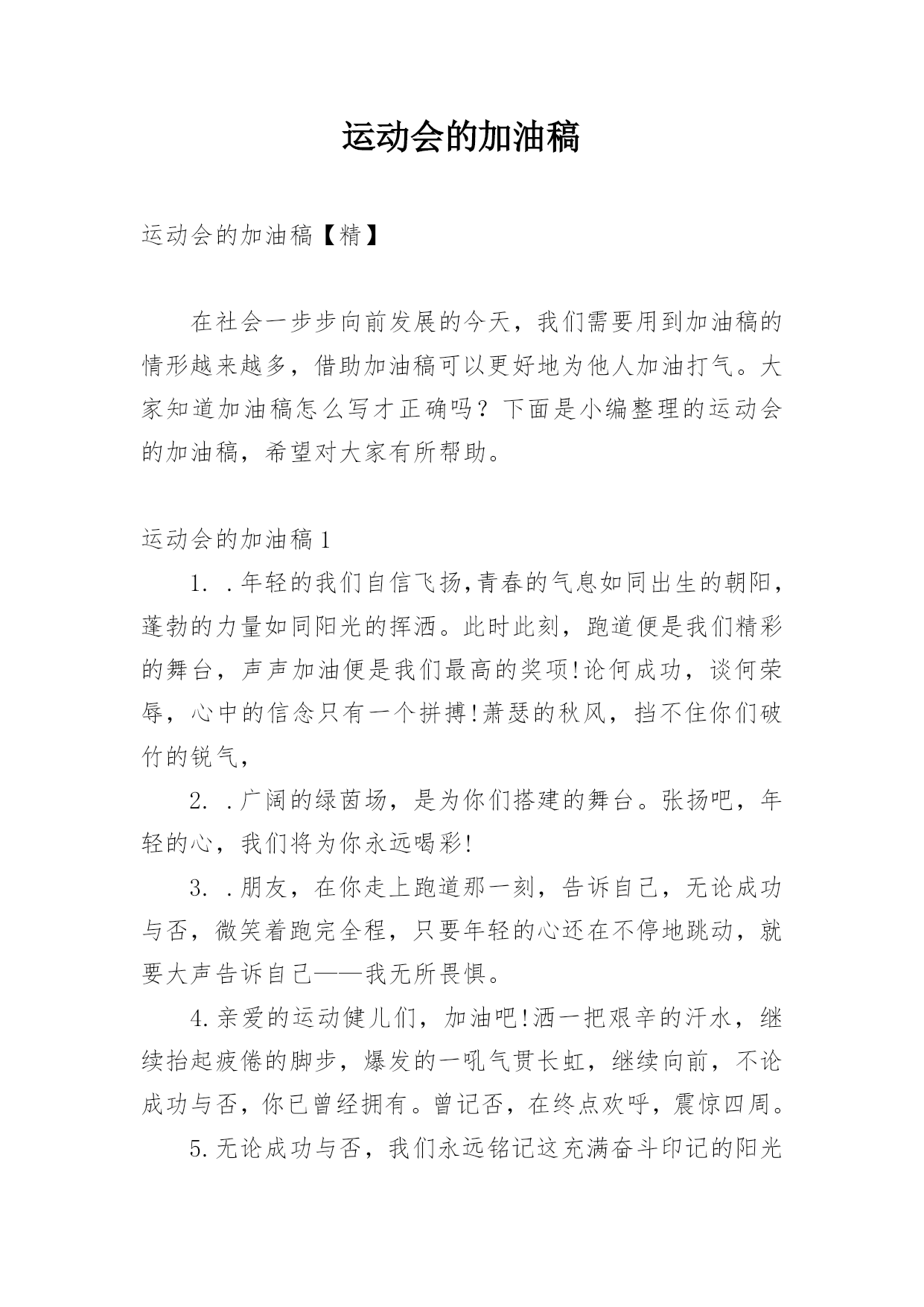 运动会的加油稿(荐)运动会的加油稿在我们平凡的日常里,我们越来越需要加油稿,加油稿可以起到鼓励场上的人、增添其信心的作用。为了让您在写加油稿时更加简单方便,下面是小编帮大家整理的运动会的加油稿,希望能够帮助到大家。1、你的汗水洒在跑道,浇灌着成功的花朵开放。2、你们挥舞着充满力量的双臂看着实心球化成美丽的弧线3、一根小小的木棒,连接的是团结和友爱4、踏上跑道,是一种选择。离开起点,是一种勇气。驰骋赛场,是一种胜利。5、运动健将们,用你的实力,用你的精神,去开拓出,一片属于你的长跑天地!6、有多少次挥汗如雨