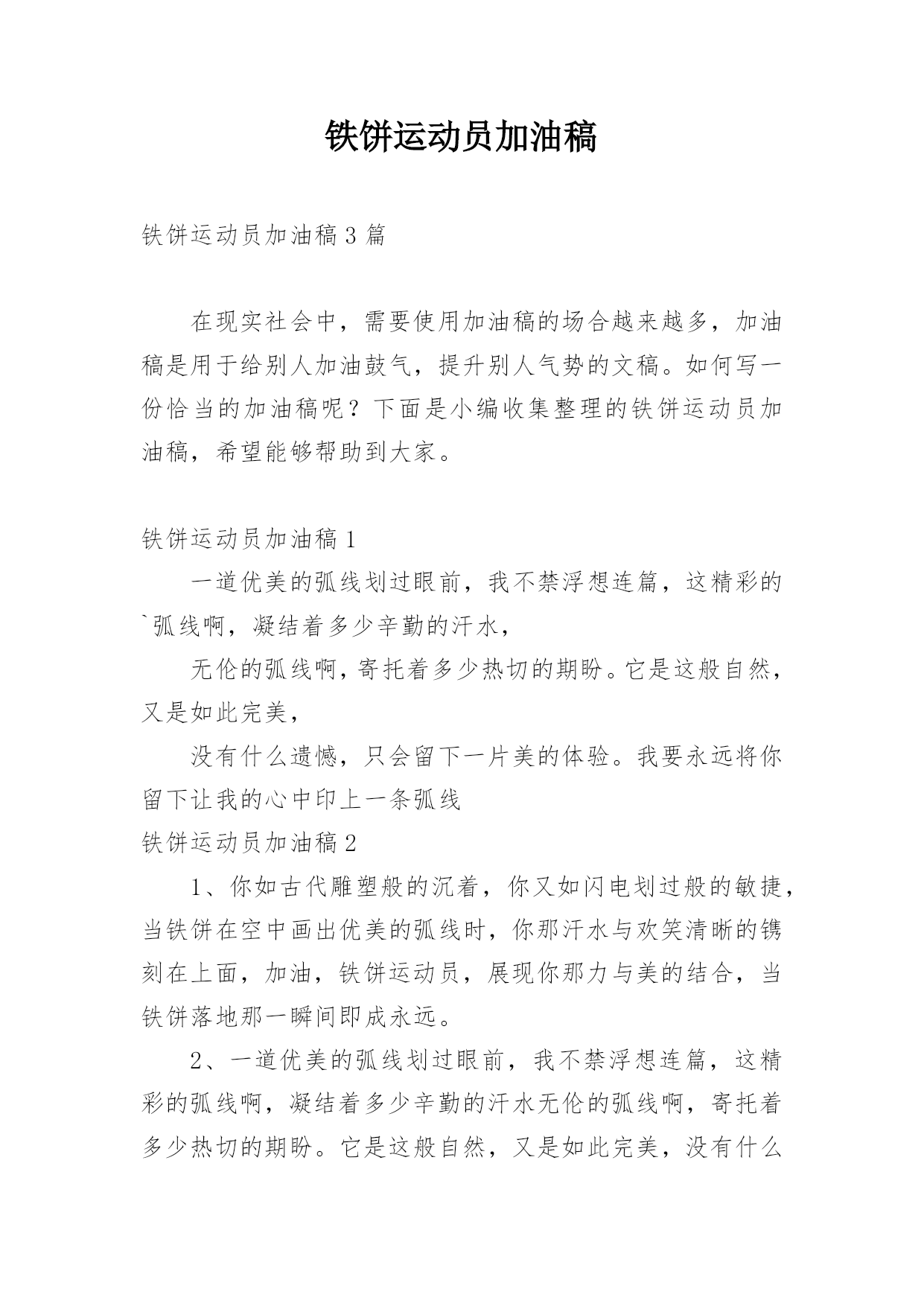 铁饼运动员加油稿铁饼运动员加油稿3篇在现实社会中,需要使用加油稿的场合越来越多,加油稿是用于给别人加油鼓气,提升别人气势的文稿。如何写一份恰当的加油稿呢?下面是小编收集整理的铁饼运动员加油稿,希望能够帮助到大家。铁饼运动员加油稿1一道优美的弧线划过眼前,我不禁浮想连篇,这精彩的`弧线啊,凝结着多少辛勤的汗水,无伦的弧线啊,寄托着多少热切的期盼。它是这般自然,又是如此完美,没有什么遗憾,只会留下一片美的体验。我要永远将你留下让我的心中印上一条弧线铁饼运动员加油稿21、你如古代雕塑般的沉着,你又如闪电划过般的