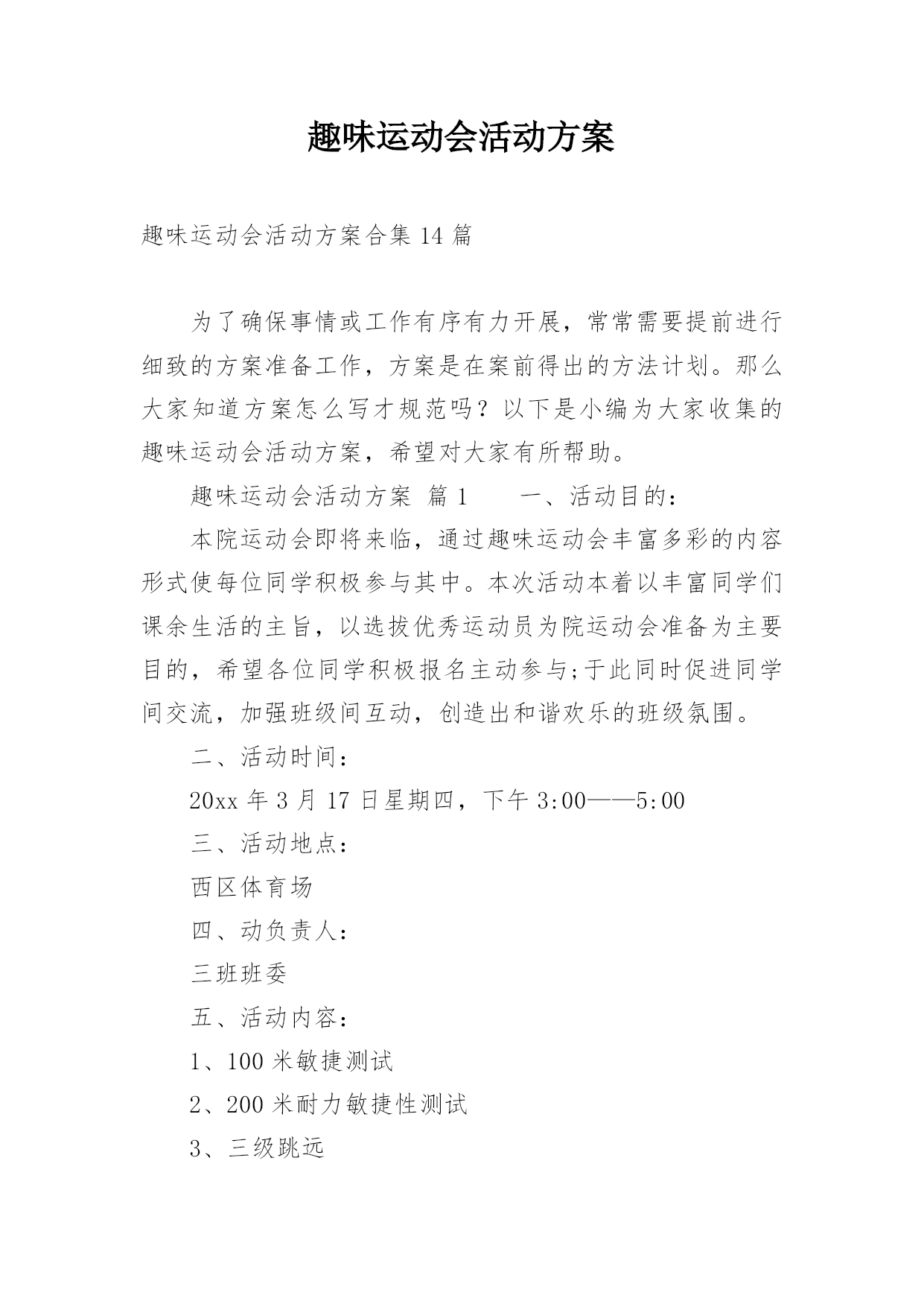 趣味运动会活动方案趣味运动会活动方案合集14篇为了确保事情或工作有序有力开展,常常需要提前进行细致的方案准备工作,方案是在案前得出的方法计划。那么大家知道方案怎么写才规范吗?以下是小编为大家收集的趣味运动会活动方案,希望对大家有所帮助。趣味运动会活动方案篇1一、活动目的:本院运动会即将来临,通过趣味运动会丰富多彩的内容形式使每位同学积极参与其中。本次活动本着以丰富同学们课余生活的主旨,以选拔优秀运动员为院运动会准备为主要目的,希望各位同学积极报名主动参与;于此同时促进同学间交流,加强班级间互动,创造出和谐