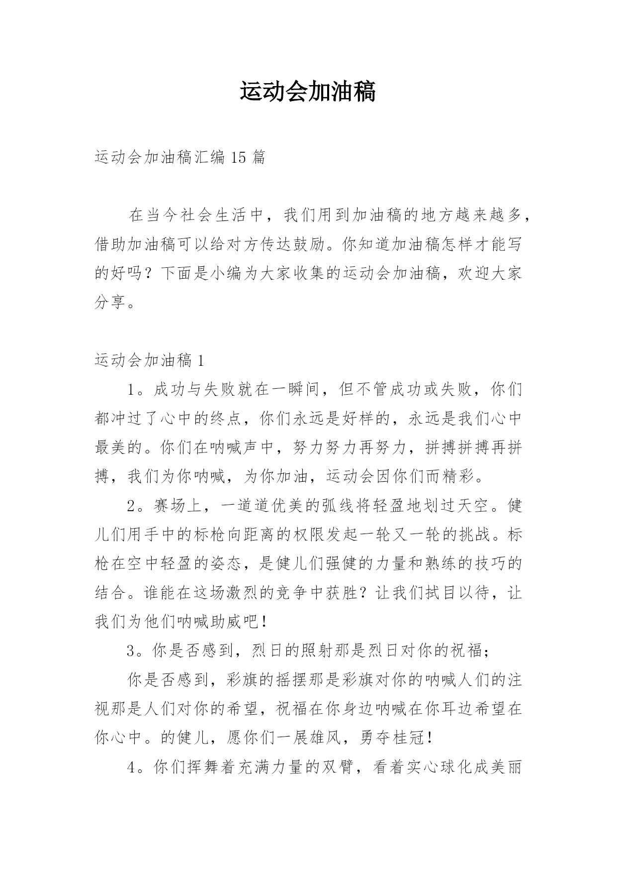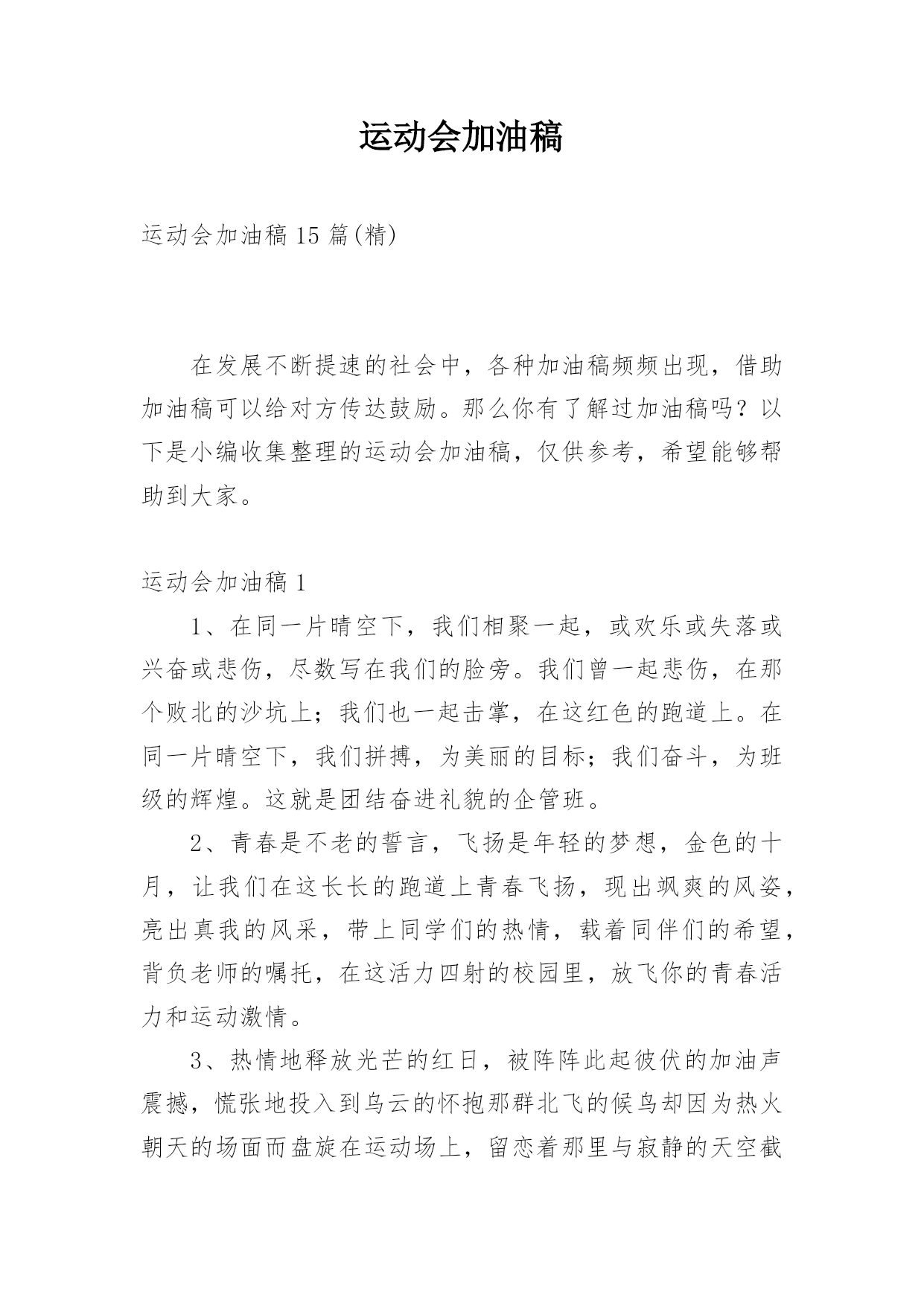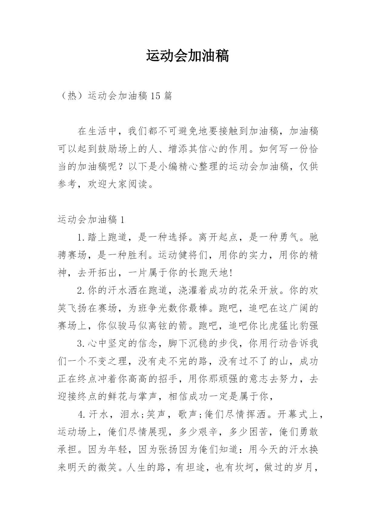 运动会加油稿(热)运动会加油稿15篇在生活中,我们都不可避免地要接触到加油稿,加油稿可以起到鼓励场上的人、增添其信心的作用。如何写一份恰当的加油稿呢?以下是小编精心整理的运动会加油稿,仅供参考,欢迎大家阅读。运动会加油稿11.踏上跑道,是一种选择。离开起点,是一种勇气。驰骋赛场,是一种胜利。运动健将们,用你的实力,用你的精神,去开拓出,一片属于你的长跑天地!2.你的汗水洒在跑道,浇灌着成功的花朵开放。你的欢笑飞扬在赛场,为班争光数你最棒。跑吧,追吧在这广阔的赛场上,你似骏马似离铉的箭。跑吧,追吧你比虎猛比