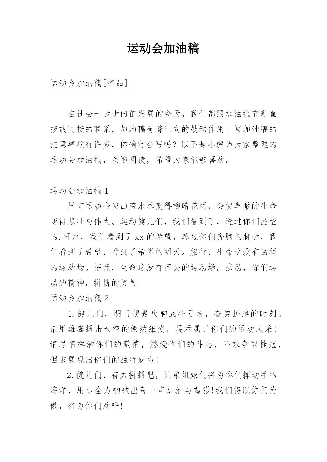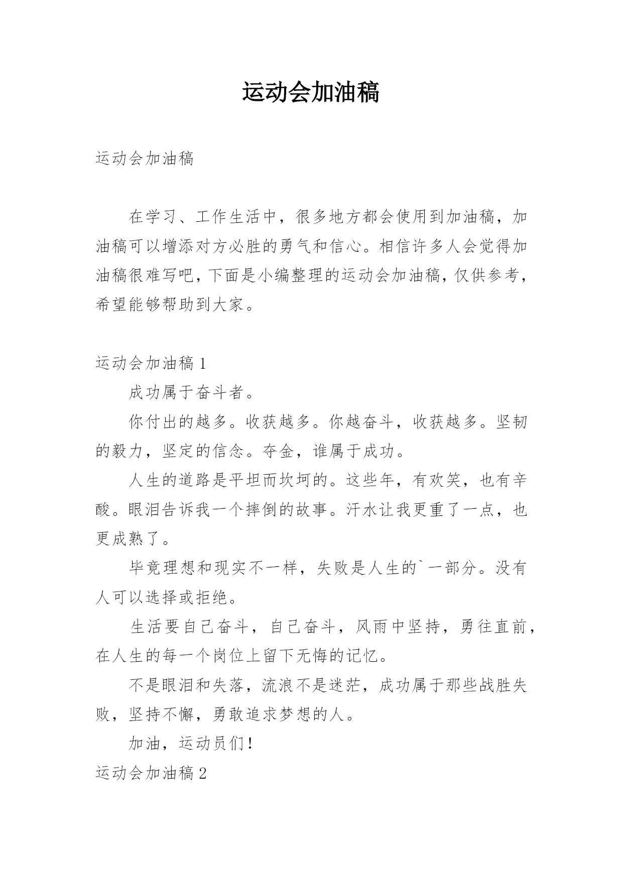 运动会加油稿运动会加油稿在学习、工作生活中,很多地方都会使用到加油稿,加油稿可以增添对方必胜的勇气和信心。相信许多人会觉得加油稿很难写吧,下面是小编整理的运动会加油稿,仅供参考,希望能够帮助到大家。运动会加油稿1成功属于奋斗者。你付出的越多。收获越多。你越奋斗,收获越多。坚韧的毅力,坚定的信念。夺金,谁属于成功。人生的道路是平坦而坎坷的。这些年,有欢笑,也有辛酸。眼泪告诉我一个摔倒的故事。汗水让我更重了一点,也更成熟了。毕竟理想和现实不一样,失败是人生的`一部分。没有人可以选择或拒绝。生活要自己奋斗,自己