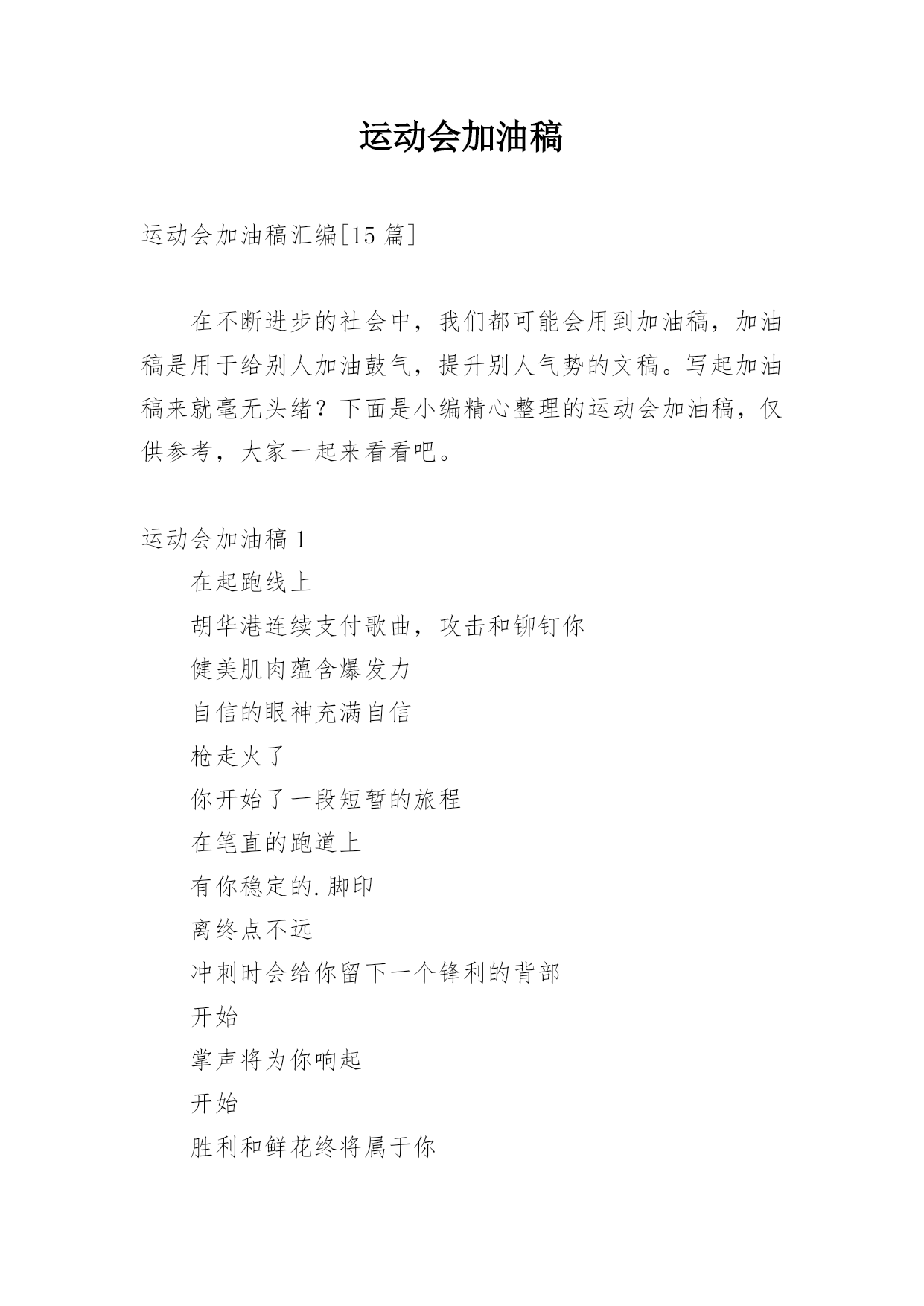 运动会加油稿运动会加油稿汇编[15篇]在不断进步的社会中,我们都可能会用到加油稿,加油稿是用于给别人加油鼓气,提升别人气势的文稿。写起加油稿来就毫无头绪?下面是小编精心整理的运动会加油稿,仅供参考,大家一起来看看吧。运动会加油稿1在起跑线上胡华港连续支付歌曲,攻击和铆钉你健美肌肉蕴含爆发力自信的眼神充满自信枪走火了你开始了一段短暂的旅程在笔直的跑道上有你稳定的.脚印离终点不远冲刺时会给你留下一个锋利的背部开始掌声将为你响起开始胜利和鲜花终将属于你运动会加油稿21、你们挥舞着充满力量的双臂,看着实心球化成美