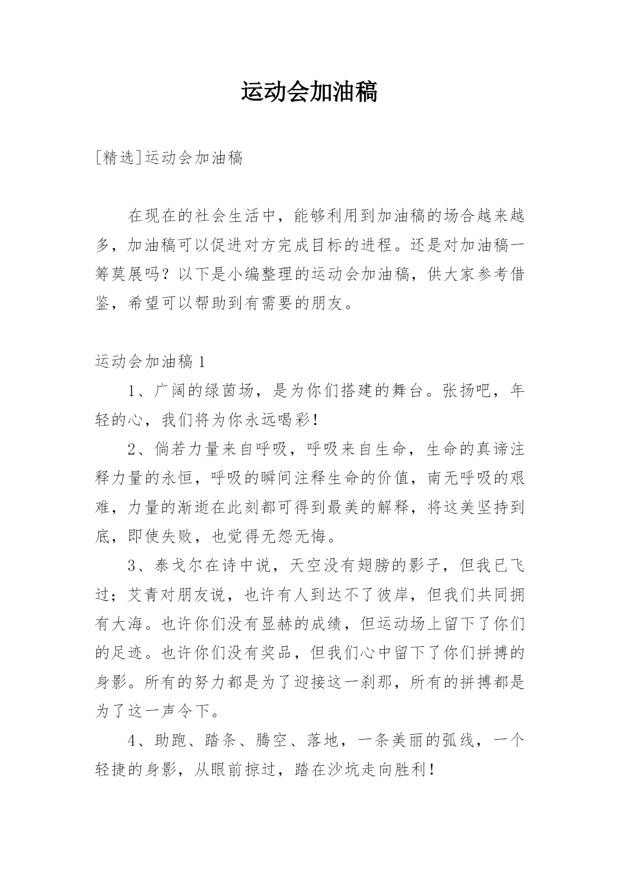 运动会加油稿[精选]运动会加油稿在现在的社会生活中,能够利用到加油稿的场合越来越多,加油稿可以促进对方完成目标的进程。还是对加油稿一筹莫展吗?以下是小编整理的运动会加油稿,供大家参考借鉴,希望可以帮助到有需要的朋友。运动会加油稿11、广阔的绿茵场,是为你们搭建的舞台。张扬吧,年轻的心,我们将为你永远喝彩!2、倘若力量来自呼吸,呼吸来自生命,生命的真谛注释力量的永恒,呼吸的瞬间注释生命的价值,南无呼吸的艰难,力量的渐逝在此刻都可得到最美的解释,将这美坚持到底,即使失败,也觉得无怨无悔。3、泰戈尔在诗中说,天