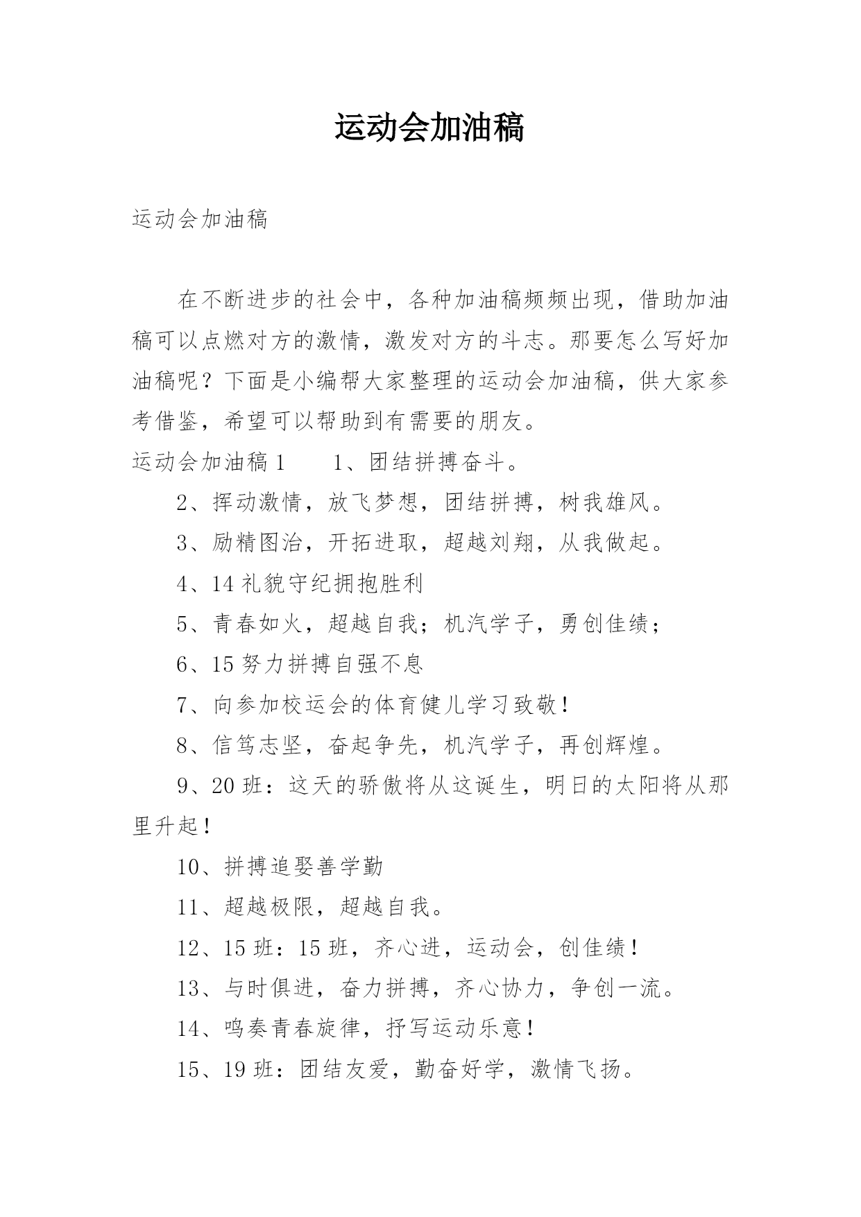 运动会加油稿运动会加油稿在不断进步的社会中,各种加油稿频频出现,借助加油稿可以点燃对方的激情,激发对方的斗志。那要怎么写好加油稿呢?下面是小编帮大家整理的运动会加油稿,供大家参考借鉴,希望可以帮助到有需要的朋友。运动会加油稿11、团结拼搏奋斗。2、挥动激情,放飞梦想,团结拼搏,树我雄风。3、励精图治,开拓进取,超越刘翔,从我做起。4、14礼貌守纪拥抱胜利5、青春如火,超越自我;机汽学子,勇创佳绩;6、15努力拼搏自强不息7、向参加校运会的体育健儿学习致敬!8、信笃志坚,奋起争先,机汽学子,再创辉煌。9、2