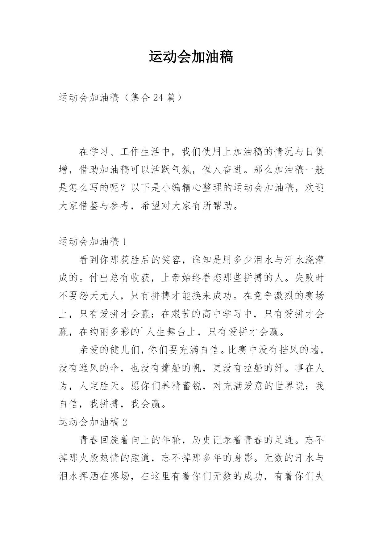 运动会加油稿运动会加油稿(集合24篇)在学习、工作生活中,我们使用上加油稿的情况与日俱增,借助加油稿可以活跃气氛,催人奋进。那么加油稿一般是怎么写的呢?以下是小编精心整理的运动会加油稿,欢迎大家借鉴与参考,希望对大家有所帮助。运动会加油稿1看到你那获胜后的笑容,谁知是用多少泪水与汗水浇灌成的。付出总有收获,上帝始终眷恋那些拼搏的人。失败时不要怨天尤人,只有拼搏才能换来成功。在竞争激烈的赛场上,只有爱拼才会赢;在艰苦的高中学习中,只有爱拼才会赢,在绚丽多彩的`人生舞台上,只有爱拼才会赢。亲爱的健儿们,你们要
