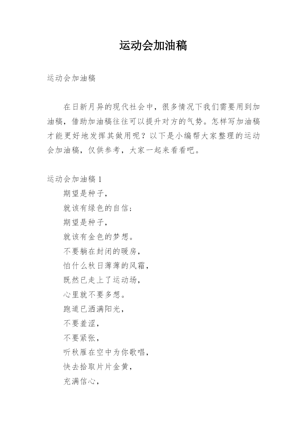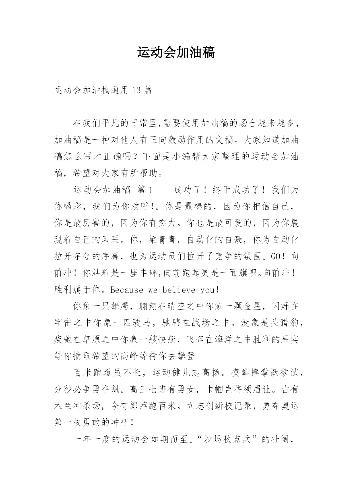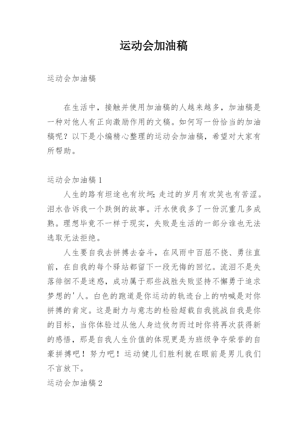 运动会加油稿运动会加油稿【热门】在日新月异的现代社会中,我们都跟加油稿有着直接或间接的联系,加油稿可以增添对方必胜的勇气和信心。相信写加油稿是一个让许多人都头痛的问题,下面是小编为大家收集的运动会加油稿,仅供参考,大家一起来看看吧。运动会加油稿11、漫漫长路,你愿一人独撑,忍受着孤独与寂寞,承受着体力与精神的压迫,只任汗水溶于泪水,可脚步却从不停歇。好样的,纵然得不了桂冠,可坚持的你,定会赢得最终的掌声。2、年轻的我们自信飞扬,青春的气息如同初升的朝阳,蓬勃的力量如同阳光的挥洒。此时此刻,跑道便是我们精彩