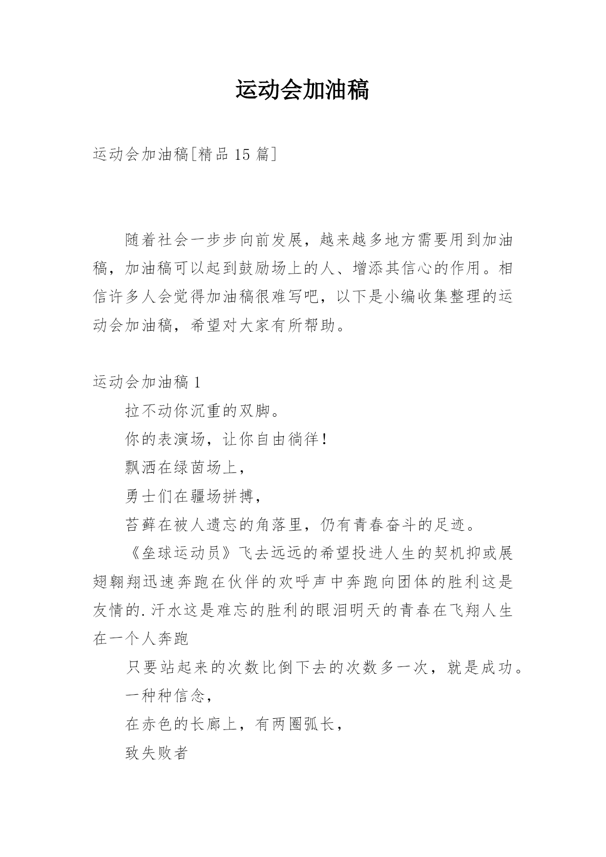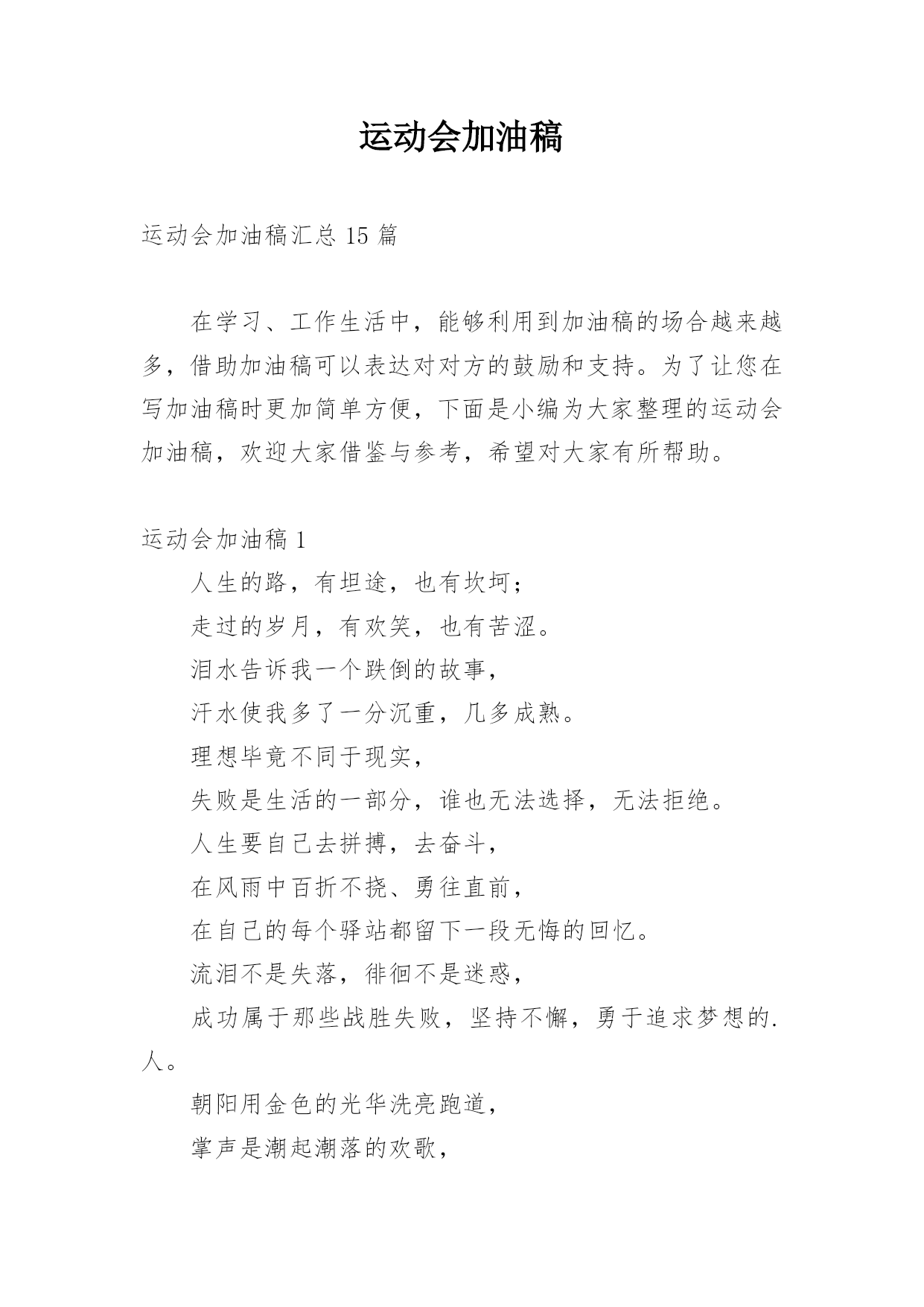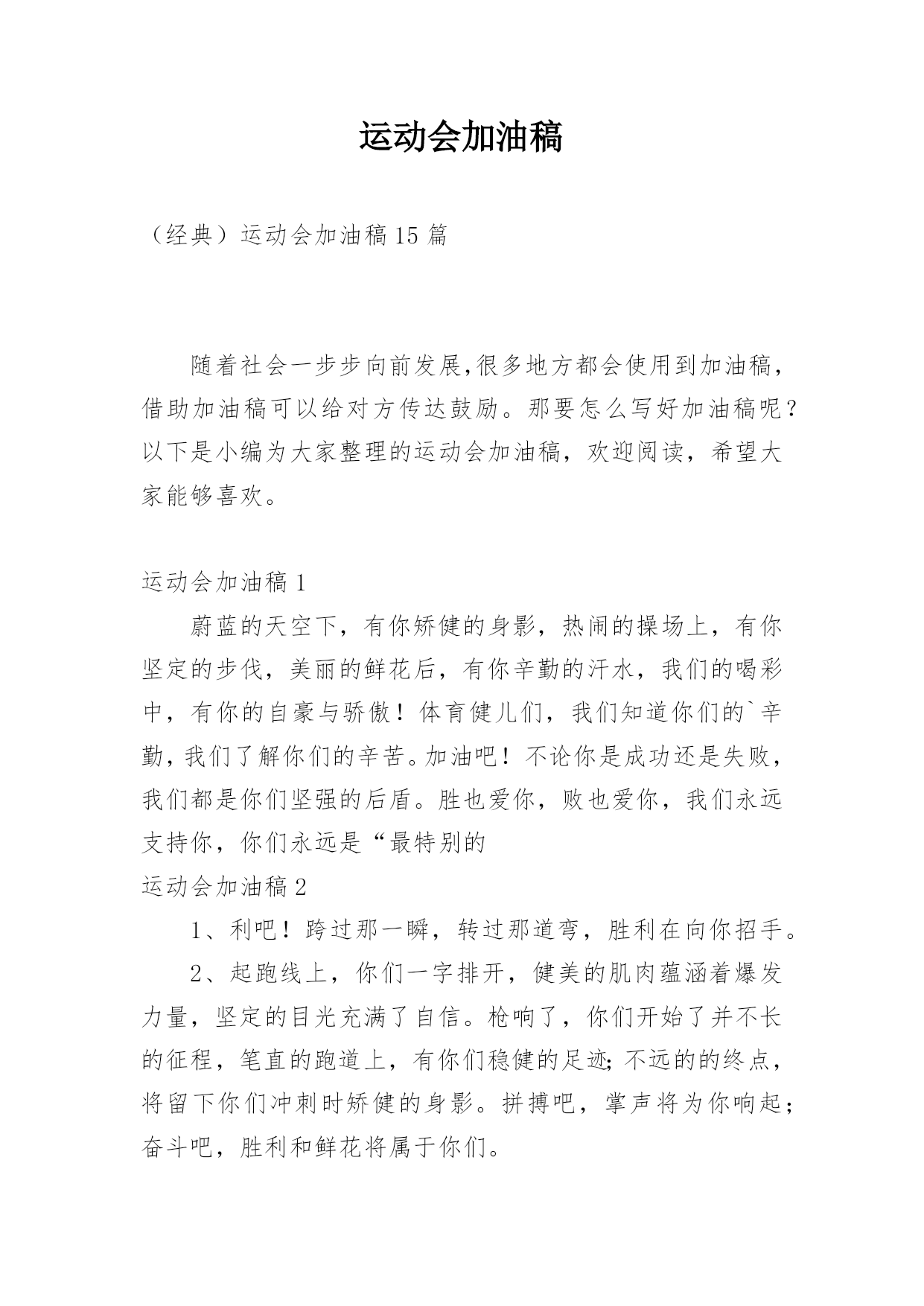 运动会加油稿(经典)运动会加油稿15篇随着社会一步步向前发展,很多地方都会使用到加油稿,借助加油稿可以给对方传达鼓励。那要怎么写好加油稿呢?以下是小编为大家整理的运动会加油稿,欢迎阅读,希望大家能够喜欢。运动会加油稿1蔚蓝的天空下,有你矫健的身影,热闹的操场上,有你坚定的步伐,美丽的鲜花后,有你辛勤的汗水,我们的喝彩中,有你的自豪与骄傲!体育健儿们,我们知道你们的`辛勤,我们了解你们的辛苦。加油吧!不论你是成功还是失败,我们都是你们坚强的后盾。胜也爱你,败也爱你,我们永远支持你,你们永远是“最特别的运动会