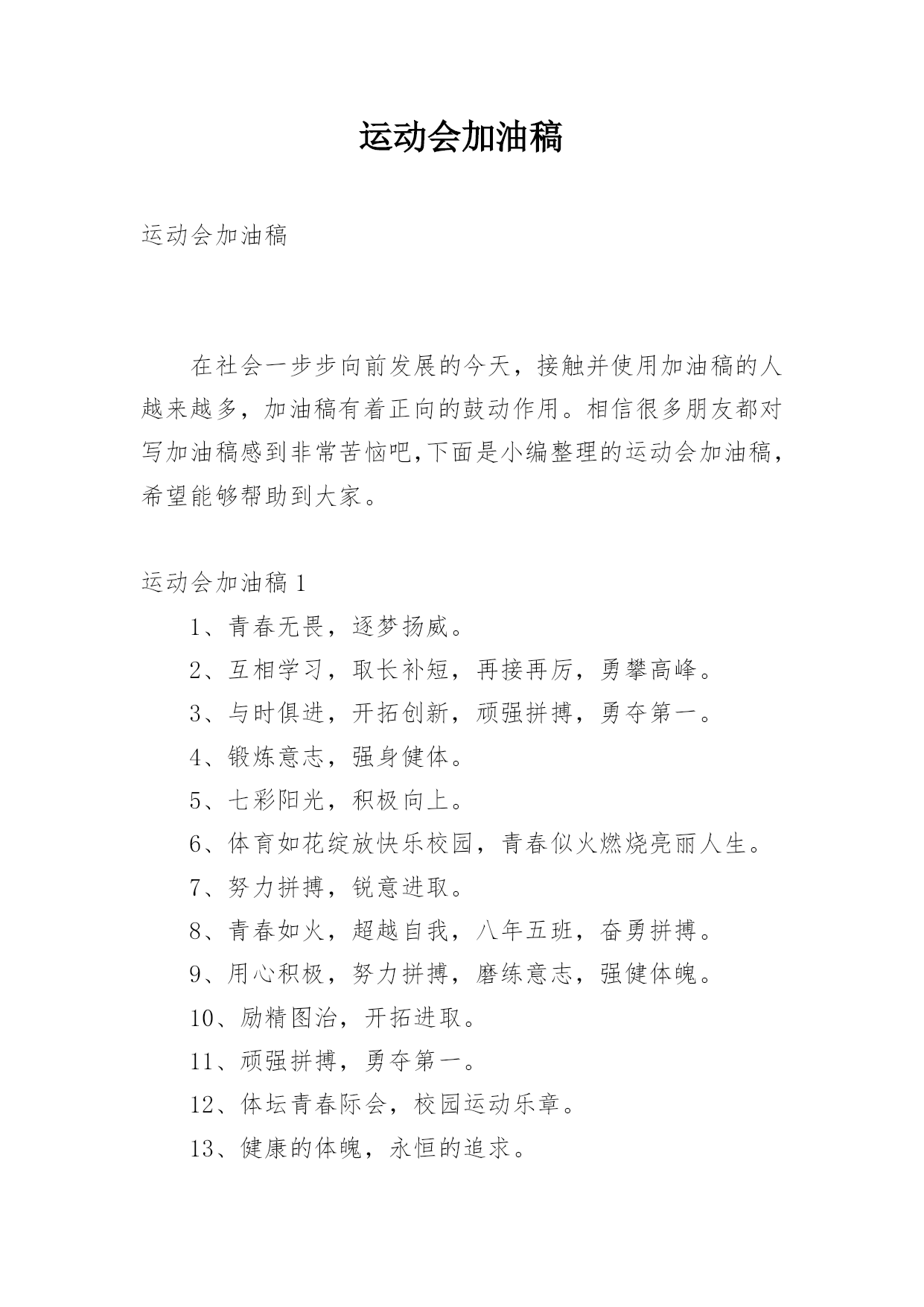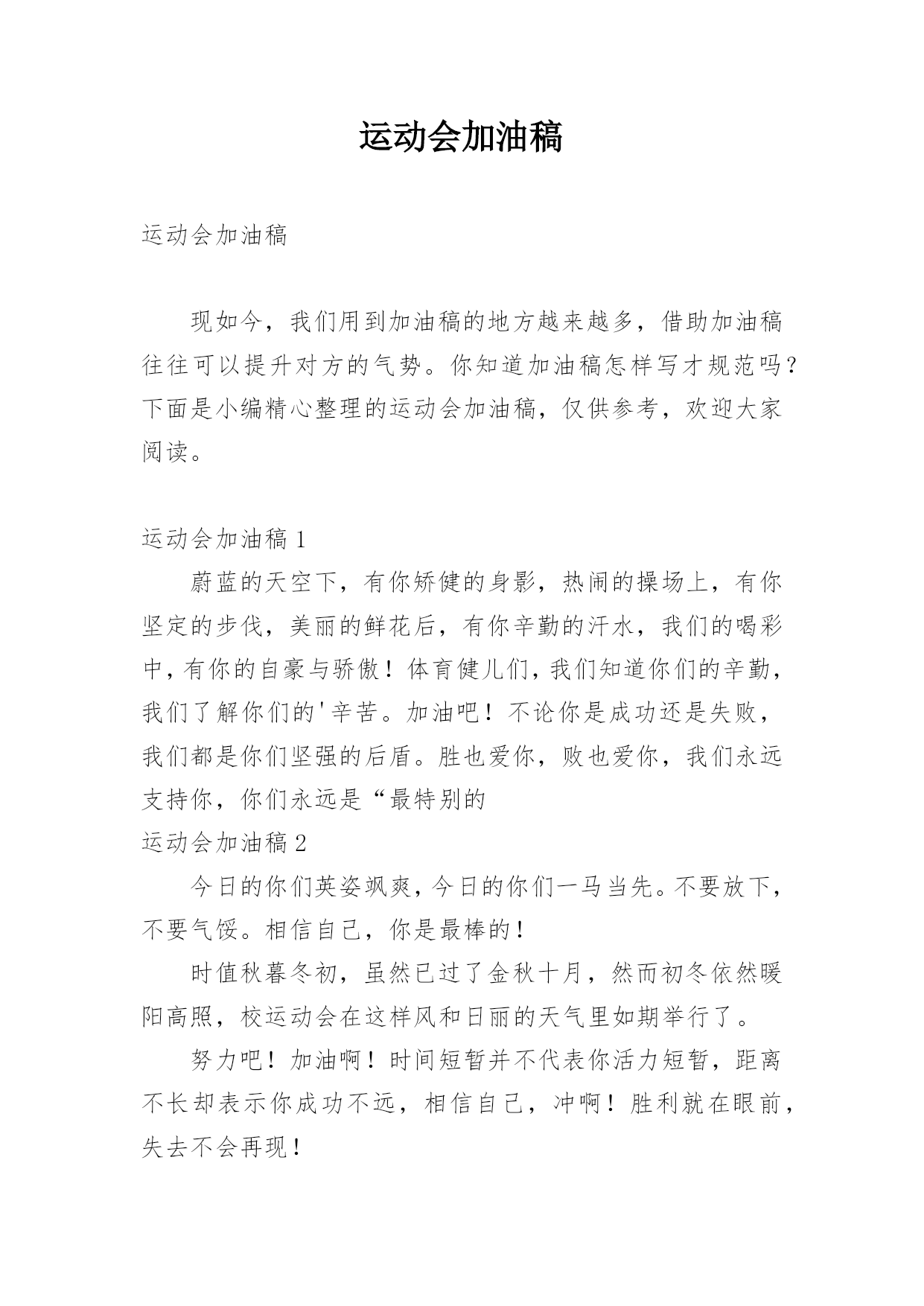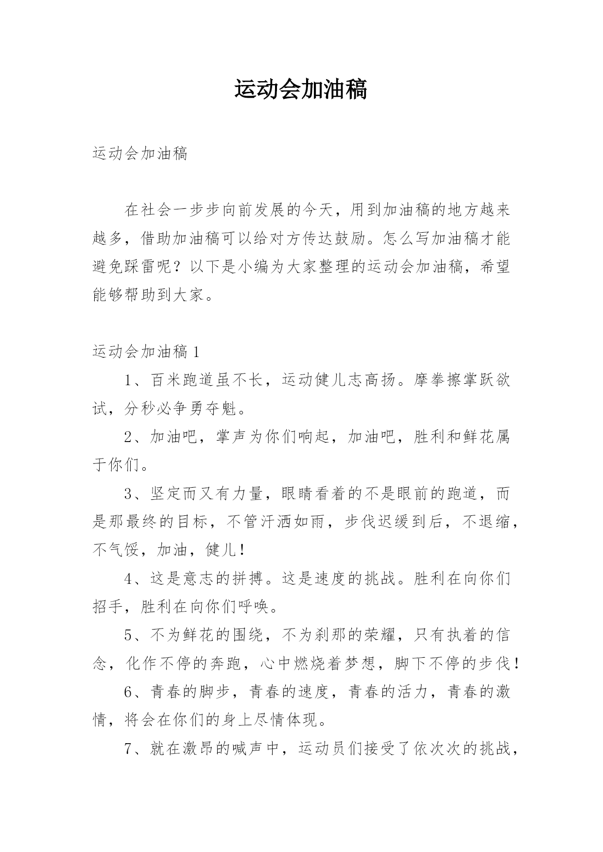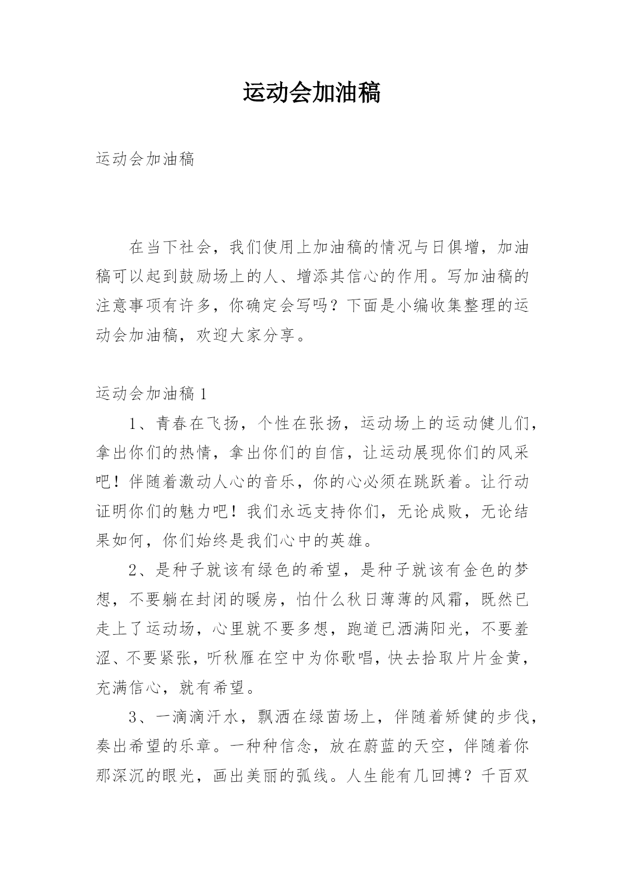 运动会加油稿运动会加油稿现如今,我们用到加油稿的地方越来越多,借助加油稿往往可以提升对方的气势。你知道加油稿怎样写才规范吗?下面是小编精心整理的运动会加油稿,仅供参考,欢迎大家阅读。运动会加油稿1蔚蓝的天空下,有你矫健的身影,热闹的操场上,有你坚定的步伐,美丽的鲜花后,有你辛勤的汗水,我们的喝彩中,有你的自豪与骄傲!体育健儿们,我们知道你们的辛勤,我们了解你们的'辛苦。加油吧!不论你是成功还是失败,我们都是你们坚强的后盾。胜也爱你,败也爱你,我们永远支持你,你们永远是“最特别的运动会加油稿2今日的你们英姿