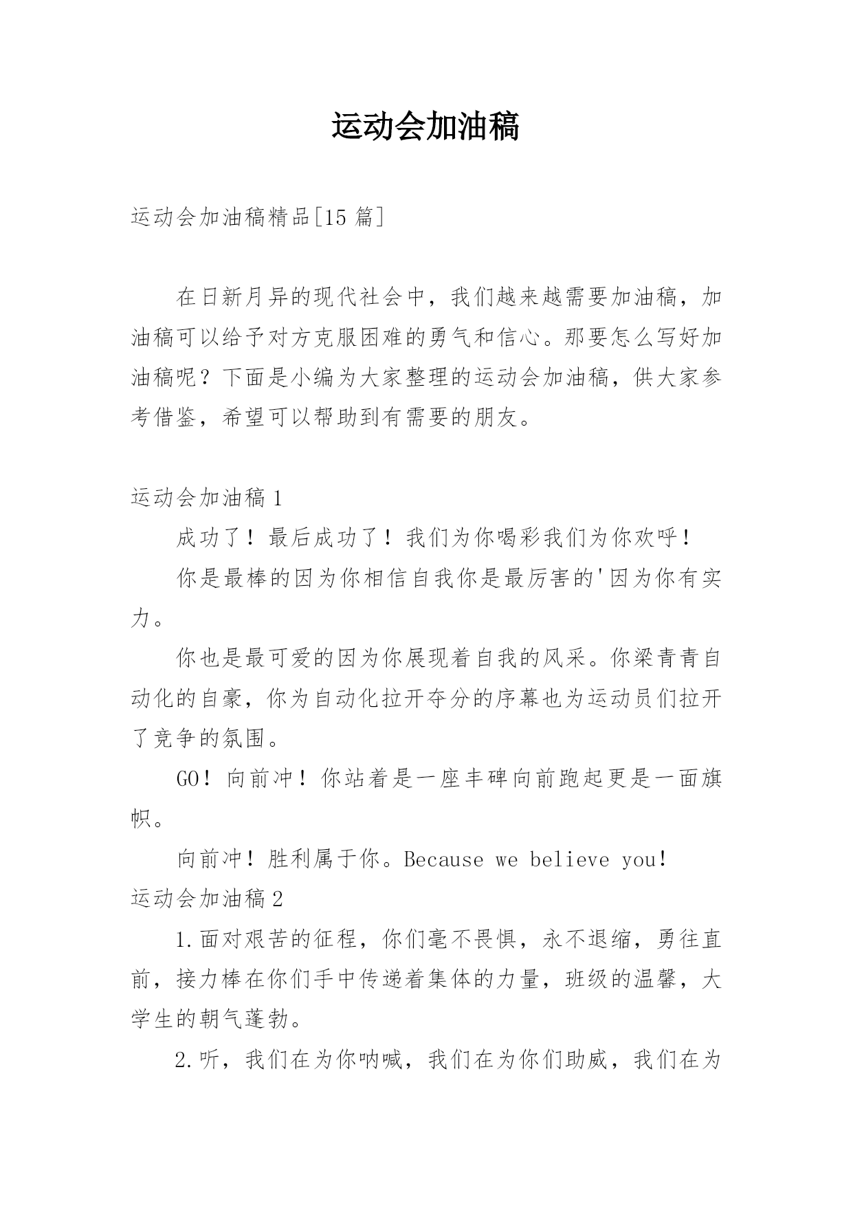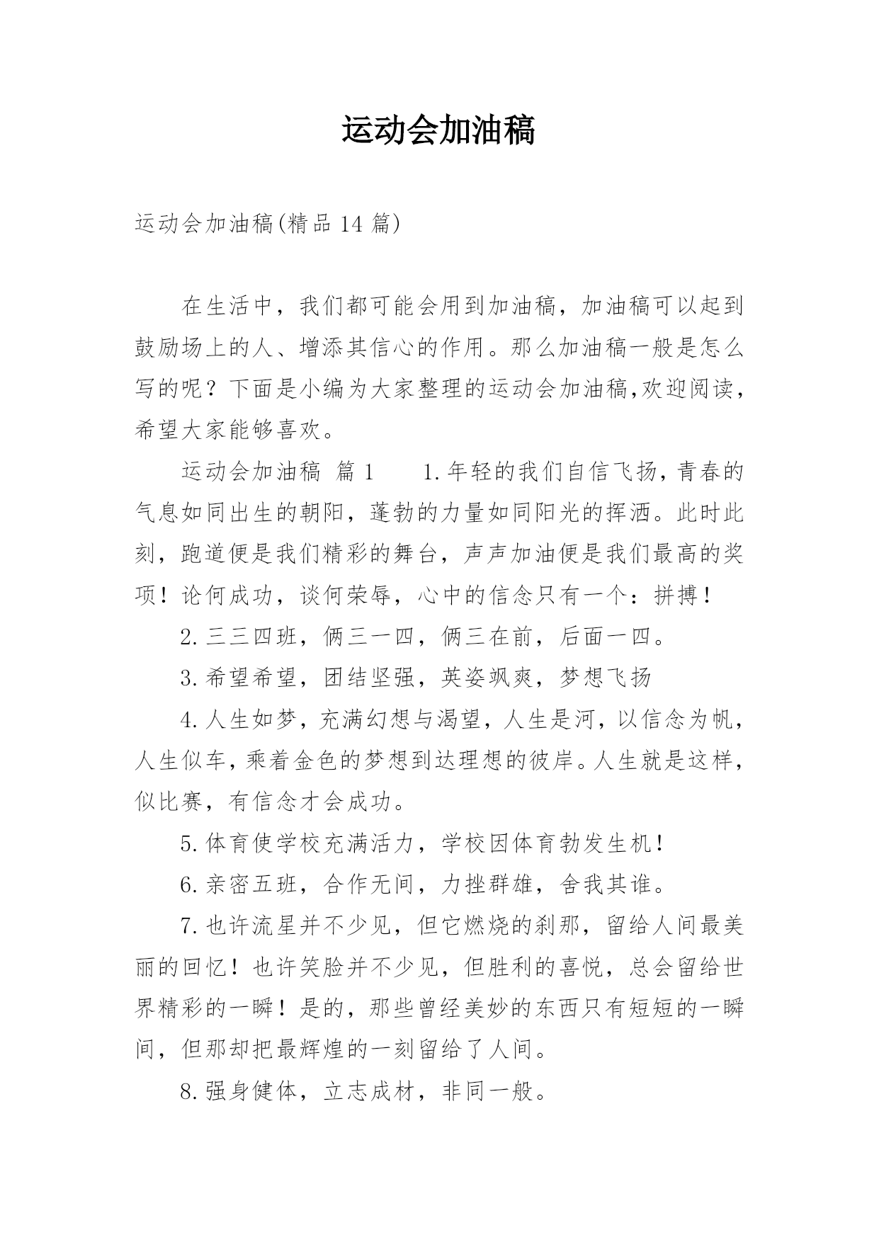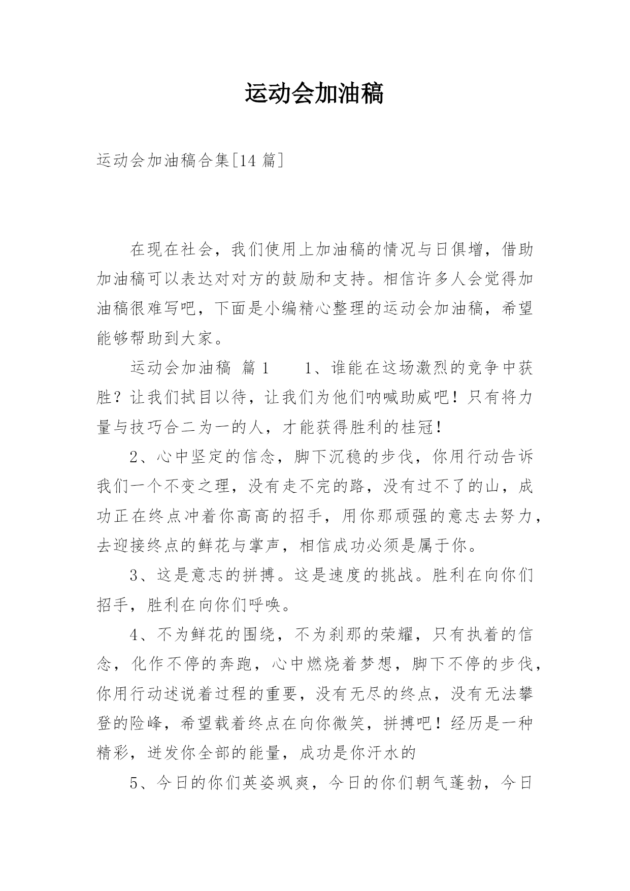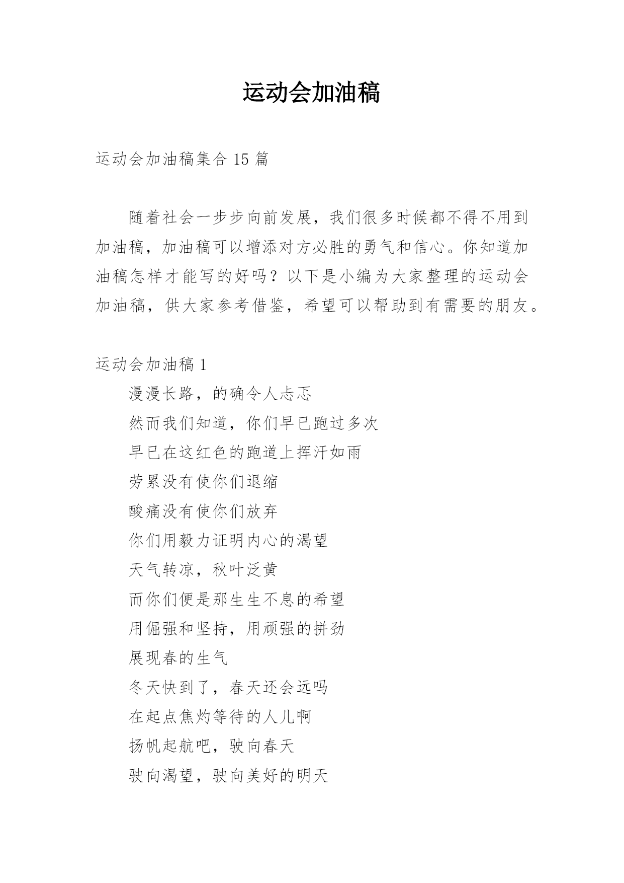 运动会加油稿运动会加油稿现如今,我们用到加油稿的地方越来越多,借助加油稿往往可以提升对方的气势。你知道加油稿怎样写才规范吗?下面是小编精心整理的运动会加油稿,仅供参考,欢迎大家阅读。运动会加油稿1蔚蓝的天空下,有你矫健的身影,热闹的操场上,有你坚定的步伐,美丽的鲜花后,有你辛勤的汗水,我们的喝彩中,有你的自豪与骄傲!体育健儿们,我们知道你们的辛勤,我们了解你们的'辛苦。加油吧!不论你是成功还是失败,我们都是你们坚强的后盾。胜也爱你,败也爱你,我们永远支持你,你们永远是“最特别的运动会加油稿2今日的你们英姿