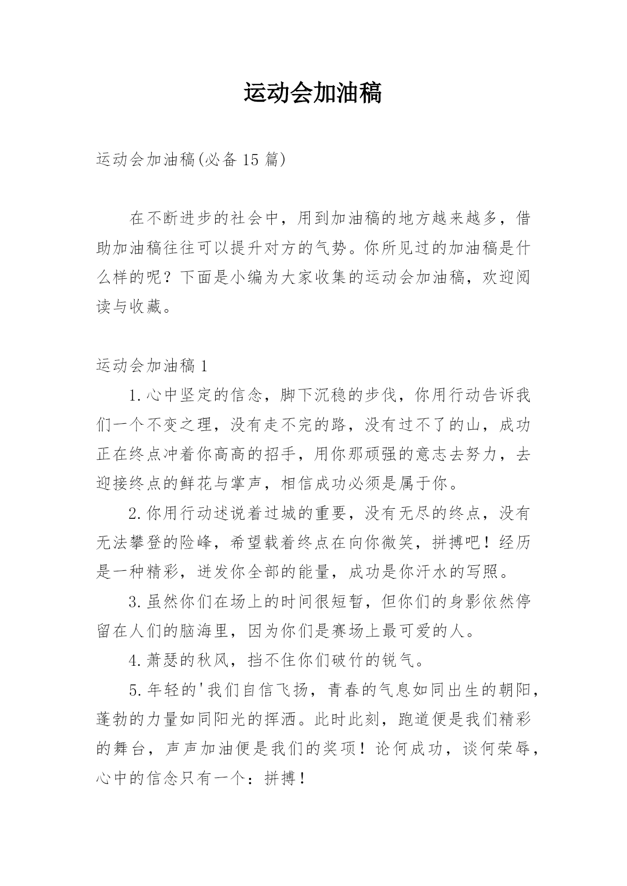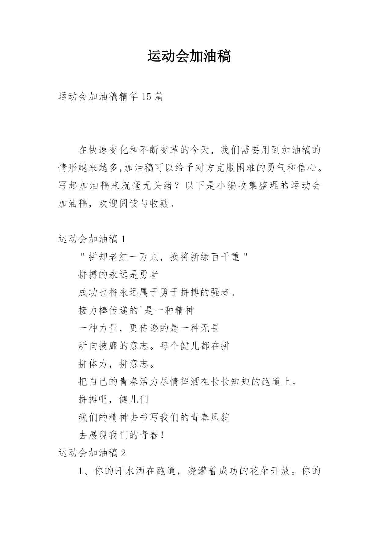 运动会加油稿运动会加油稿精华15篇在快速变化和不断变革的今天,我们需要用到加油稿的情形越来越多,加油稿可以给予对方克服困难的勇气和信心。写起加油稿来就毫无头绪?以下是小编收集整理的运动会加油稿,欢迎阅读与收藏。运动会加油稿1"拼却老红一万点,换将新绿百千重"拼搏的永远是勇者成功也将永远属于勇于拼搏的强者。接力棒传递的`是一种精神一种力量,更传递的是一种无畏所向披靡的意志。每个健儿都在拼拼体力,拼意志。把自己的青春活力尽情挥洒在长长短短的跑道上。拼搏吧,健儿们我们的精神去书写我们的青春风貌去展现我们的青春!