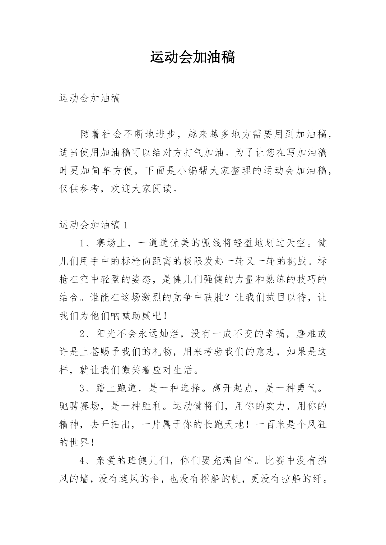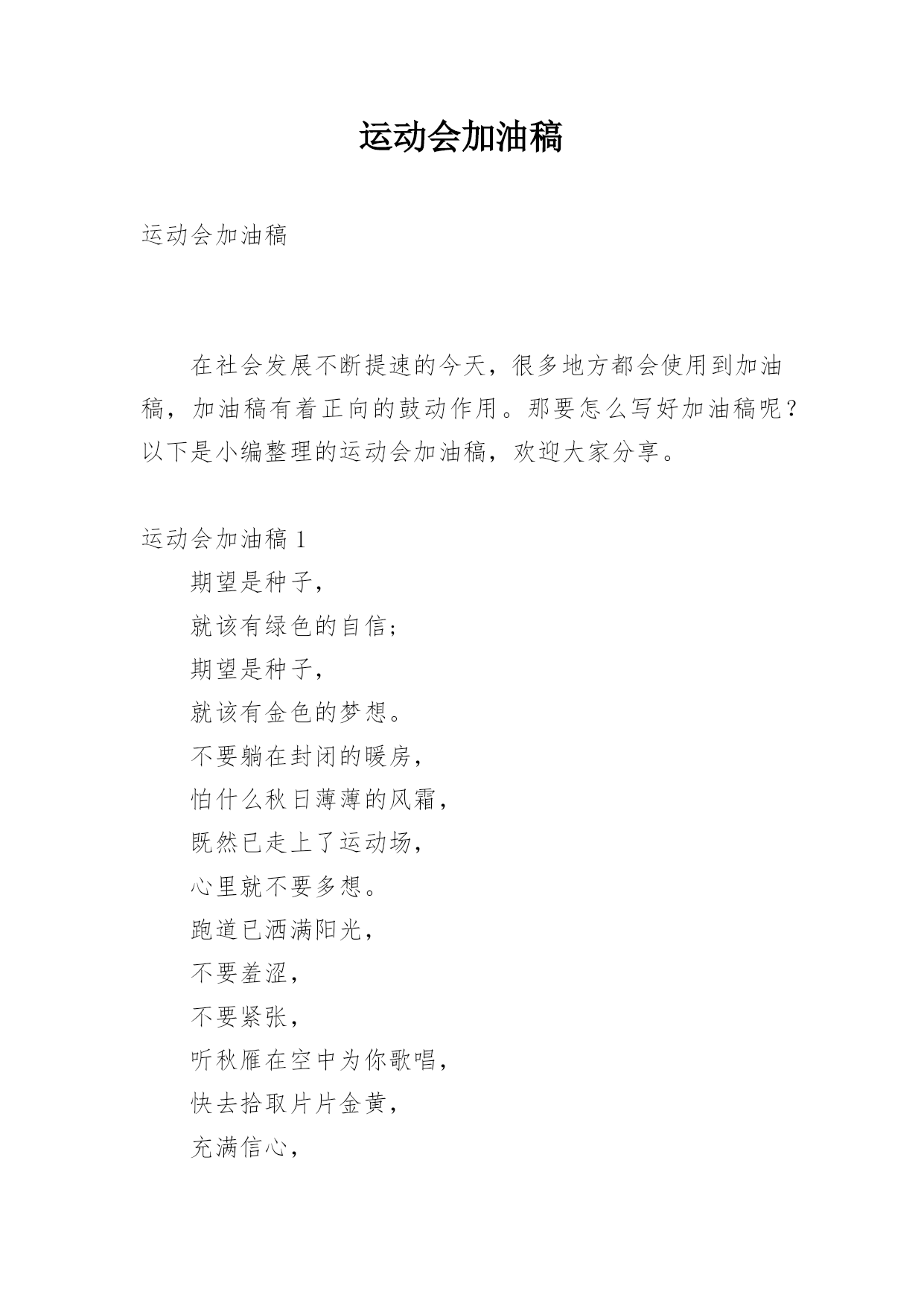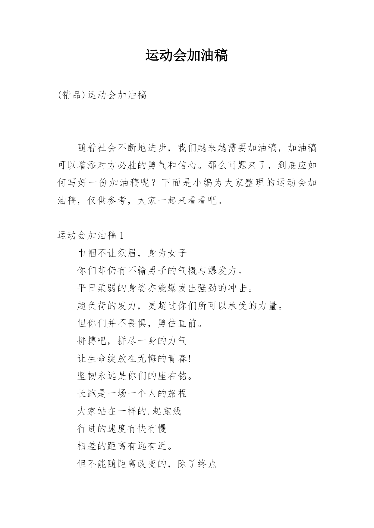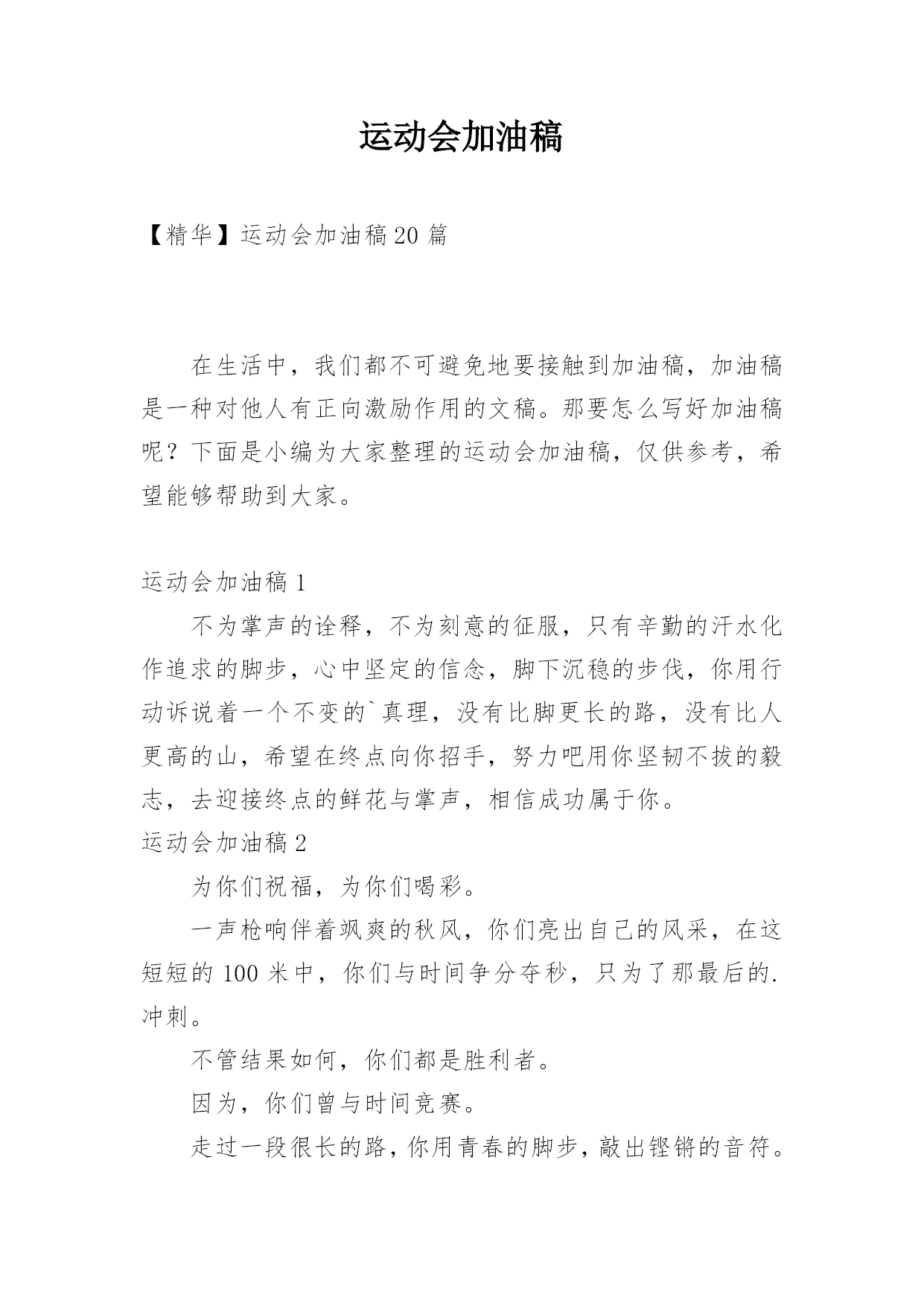 运动会加油稿【精华】运动会加油稿20篇在生活中,我们都不可避免地要接触到加油稿,加油稿是一种对他人有正向激励作用的文稿。那要怎么写好加油稿呢?下面是小编为大家整理的运动会加油稿,仅供参考,希望能够帮助到大家。运动会加油稿1不为掌声的诠释,不为刻意的征服,只有辛勤的汗水化作追求的脚步,心中坚定的信念,脚下沉稳的步伐,你用行动诉说着一个不变的`真理,没有比脚更长的路,没有比人更高的山,希望在终点向你招手,努力吧用你坚韧不拔的毅志,去迎接终点的鲜花与掌声,相信成功属于你。运动会加油稿2为你们祝福,为你们喝彩。一