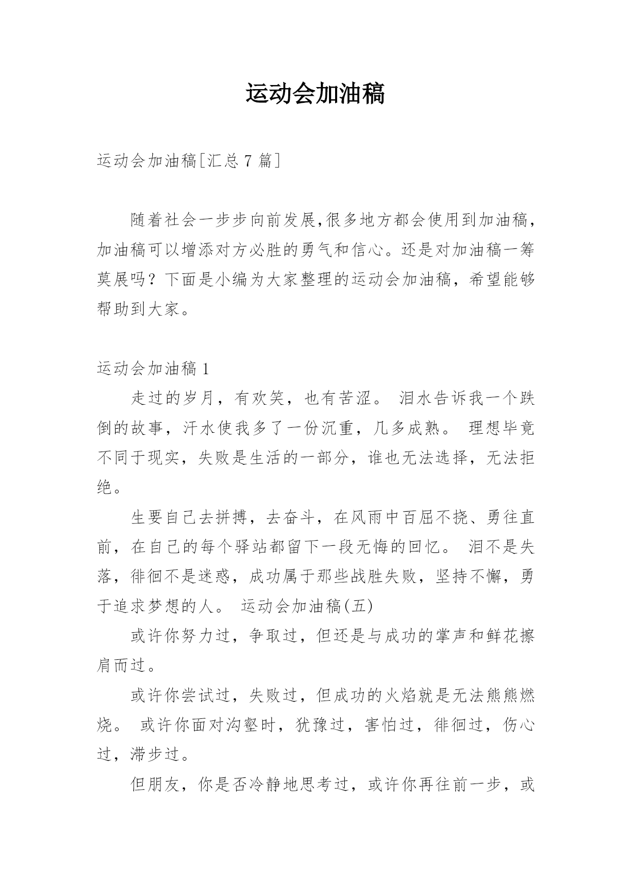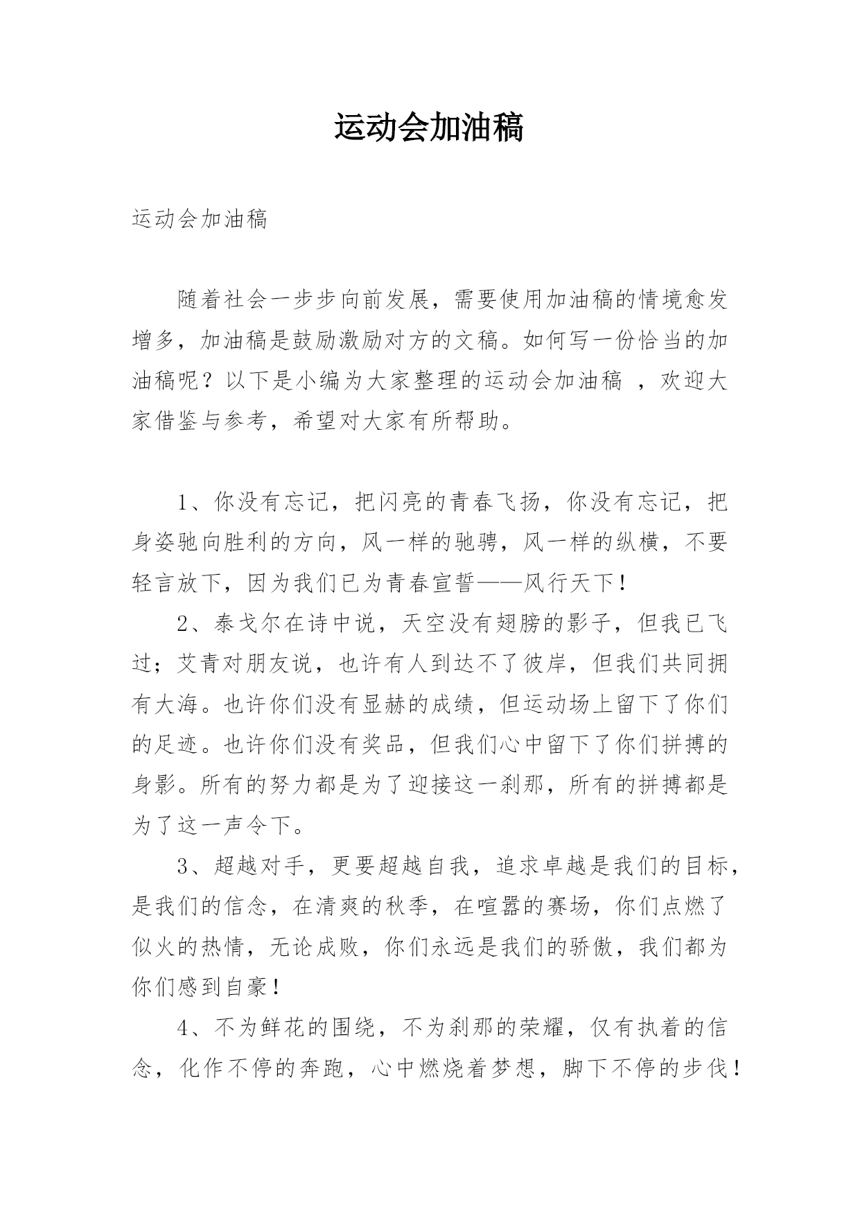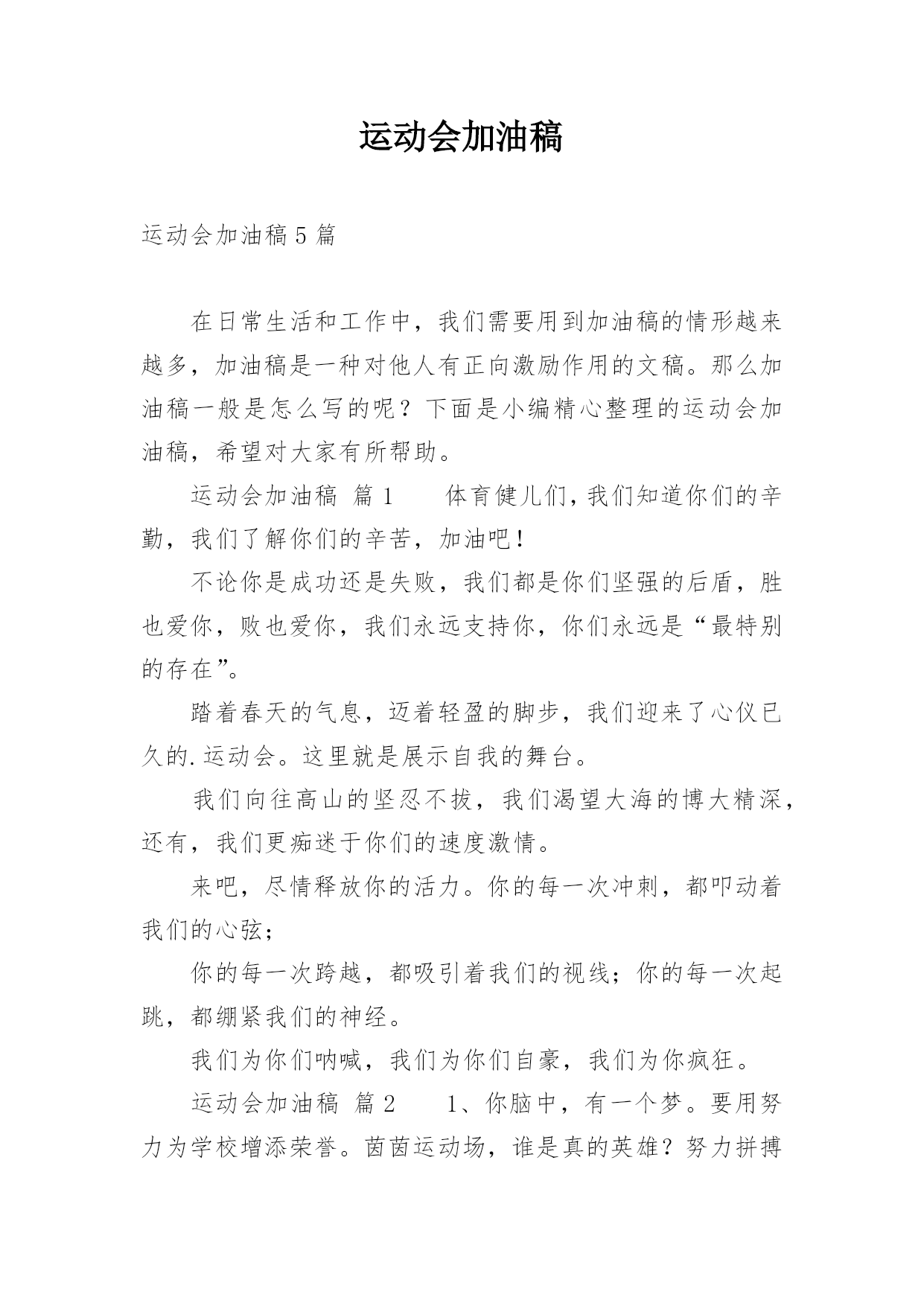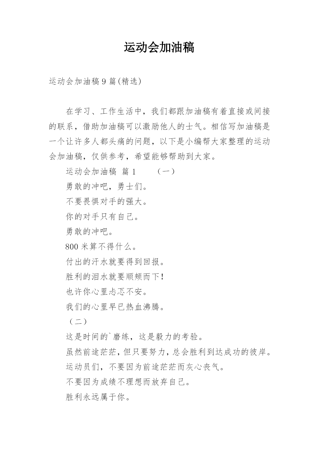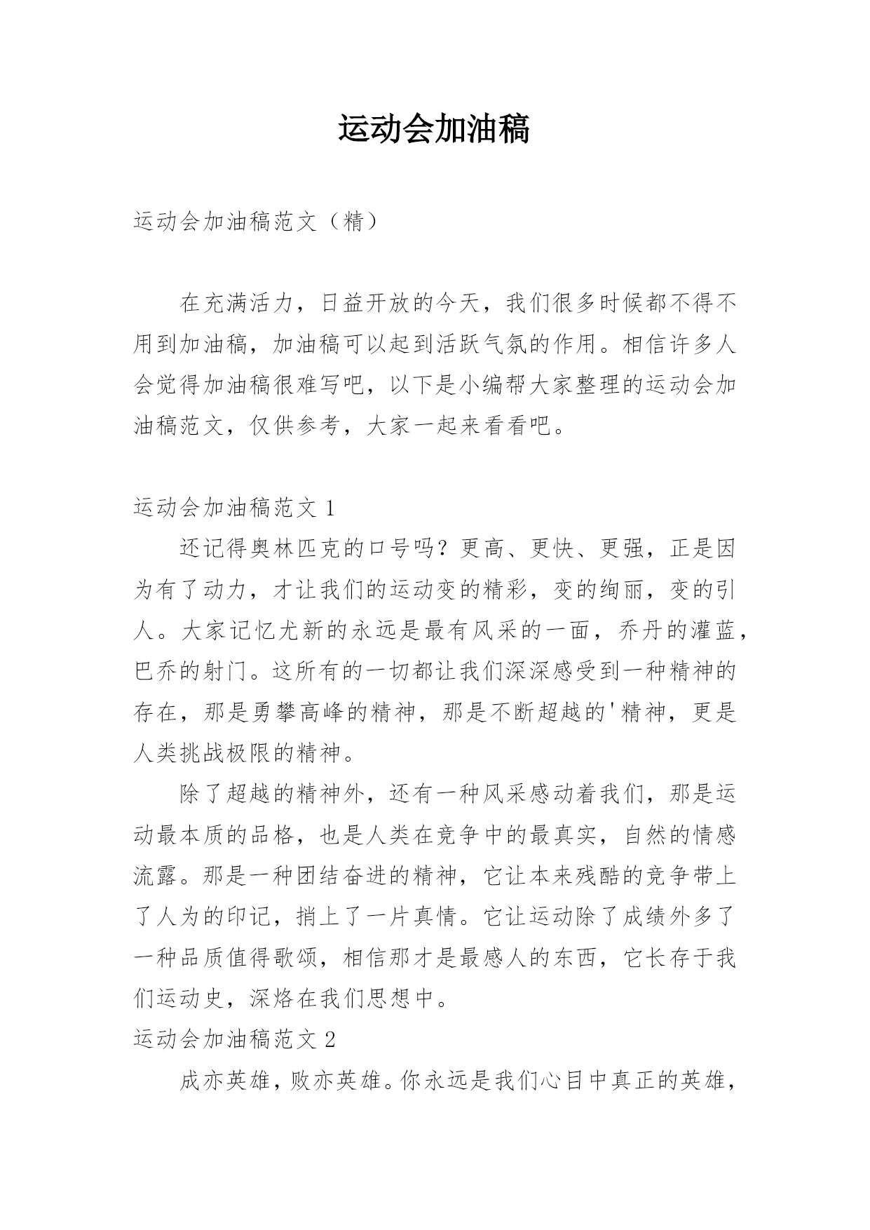 运动会加油稿【精华】运动会加油稿20篇在生活中,我们都不可避免地要接触到加油稿,加油稿是一种对他人有正向激励作用的文稿。那要怎么写好加油稿呢?下面是小编为大家整理的运动会加油稿,仅供参考,希望能够帮助到大家。运动会加油稿1不为掌声的诠释,不为刻意的征服,只有辛勤的汗水化作追求的脚步,心中坚定的信念,脚下沉稳的步伐,你用行动诉说着一个不变的`真理,没有比脚更长的路,没有比人更高的山,希望在终点向你招手,努力吧用你坚韧不拔的毅志,去迎接终点的鲜花与掌声,相信成功属于你。运动会加油稿2为你们祝福,为你们喝彩。一