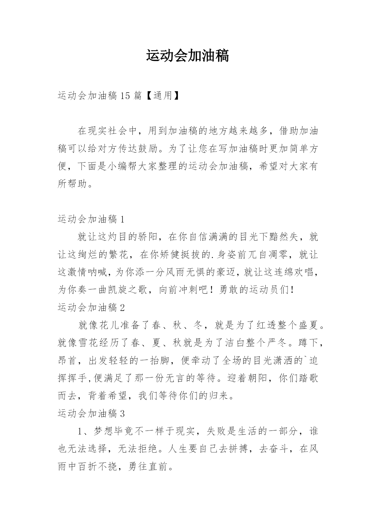运动会加油稿运动会加油稿15篇【通用】在现实社会中,用到加油稿的地方越来越多,借助加油稿可以给对方传达鼓励。为了让您在写加油稿时更加简单方便,下面是小编帮大家整理的运动会加油稿,希望对大家有所帮助。运动会加油稿1就让这灼目的骄阳,在你自信满满的目光下黯然失,就让这绚烂的繁花,在你矫健挺拔的.身姿前兀自凋零,就让这激情呐喊,为你添一分风雨无惧的豪迈,就让这连绵欢唱,为你奏一曲凯旋之歌,向前冲刺吧!勇敢的运动员们!运动会加油稿2就像花儿准备了春、秋、冬,就是为了红透整个盛夏。就像雪花经历了春、夏、秋就是为了洁