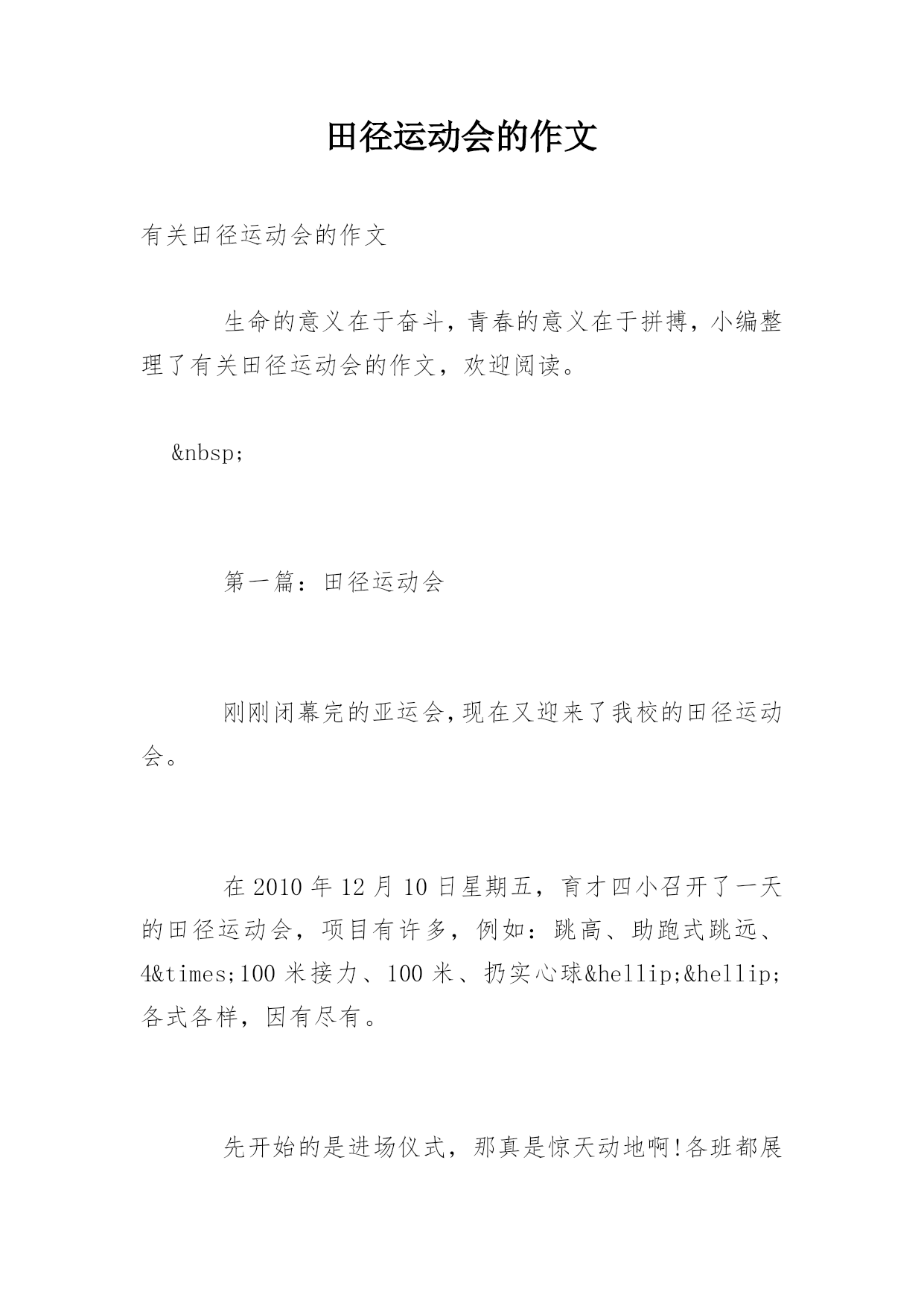田径运动会的作文有关田径运动会的作文生命的意义在于奋斗,青春的意义在于拼搏,小编整理了有关田径运动会的作文,欢迎阅读。 第一篇:田径运动会刚刚闭幕完的亚运会,现在又迎来了我校的田径运动会。在2010年12月10日星期五,育才四小召开了一天的田径运动会,项目有许多,例如:跳高、助跑式跳远、4×100米接力、100米、扔实心球……各式各样,因有尽有。先开始的是进场仪式,那真是惊天动地啊!各班都展现出了自班的风采,都把最优状态展现出来了,每班都有不同的特色与创新