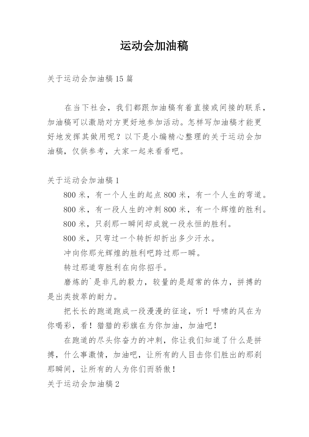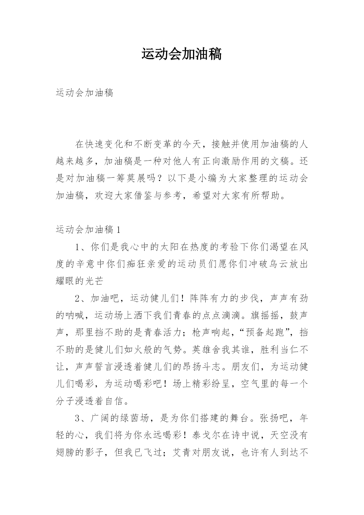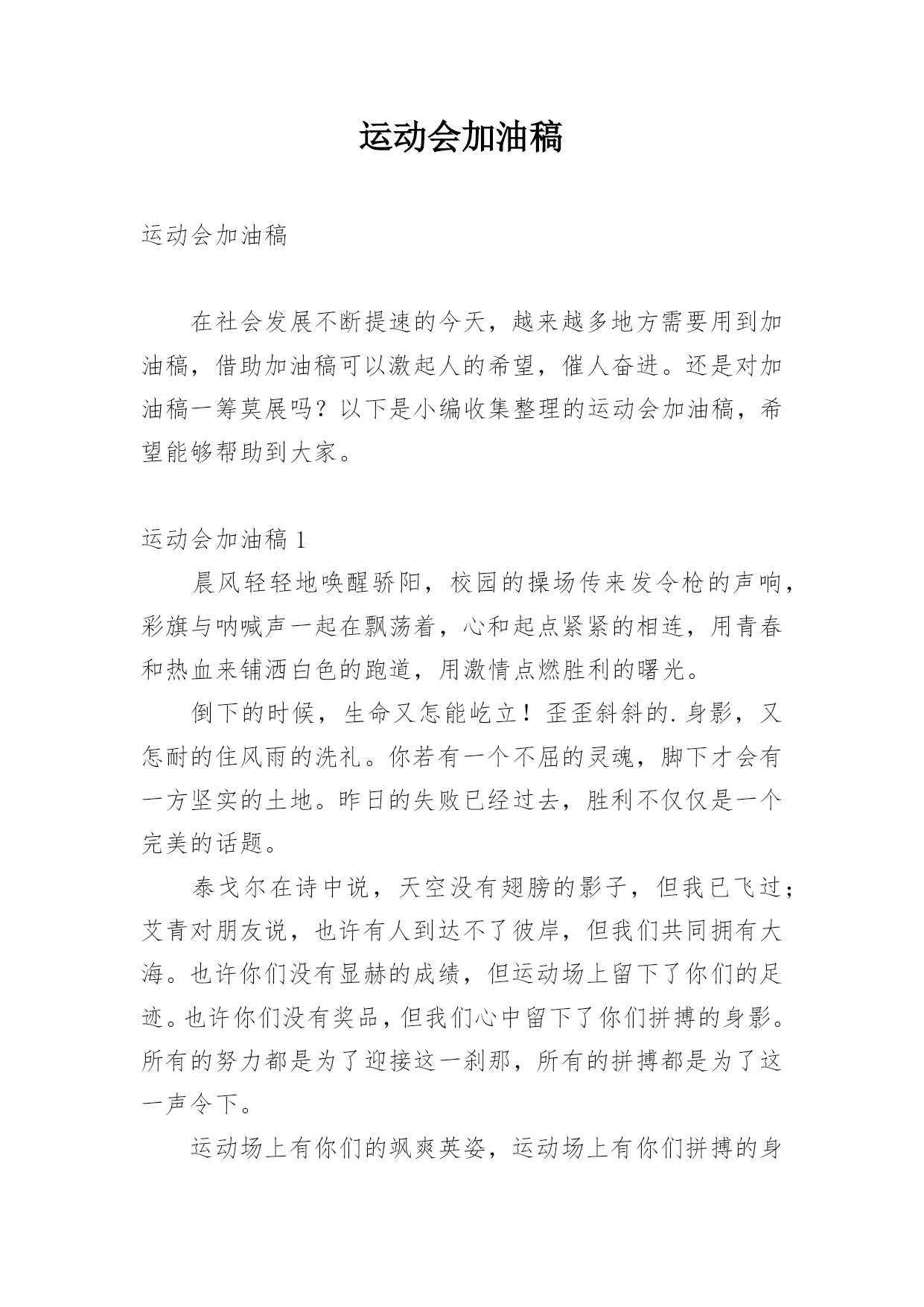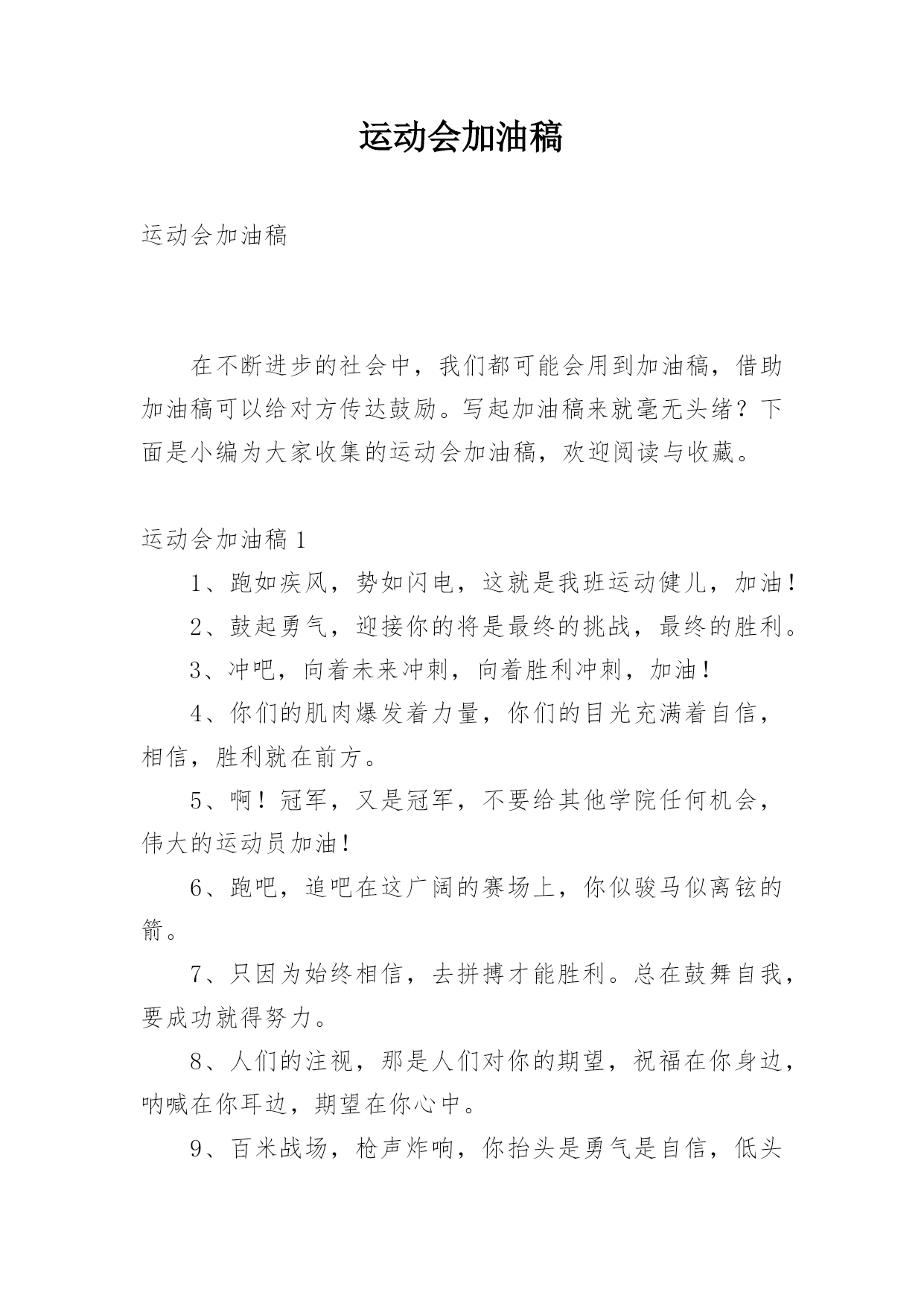 运动会加油稿运动会加油稿在社会发展不断提速的今天,越来越多地方需要用到加油稿,借助加油稿可以激起人的希望,催人奋进。还是对加油稿一筹莫展吗?以下是小编收集整理的运动会加油稿,希望能够帮助到大家。运动会加油稿1晨风轻轻地唤醒骄阳,校园的操场传来发令枪的声响,彩旗与呐喊声一起在飘荡着,心和起点紧紧的相连,用青春和热血来铺洒白色的跑道,用激情点燃胜利的曙光。倒下的时候,生命又怎能屹立!歪歪斜斜的.身影,又怎耐的住风雨的洗礼。你若有一个不屈的灵魂,脚下才会有一方坚实的土地。昨日的失败已经过去,胜利不仅仅是一个完美