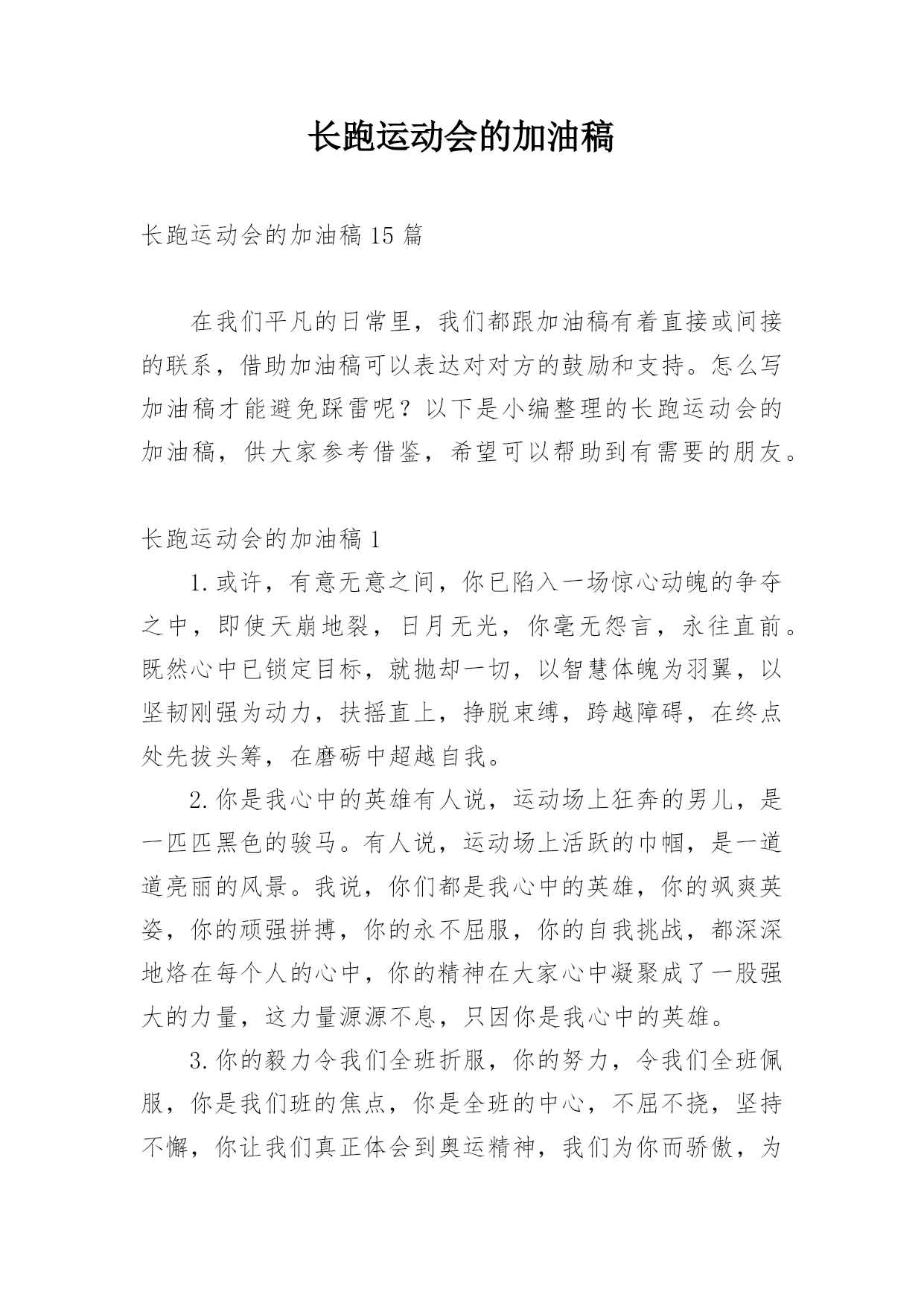 长跑运动会的加油稿长跑运动会的加油稿15篇在我们平凡的日常里,我们都跟加油稿有着直接或间接的联系,借助加油稿可以表达对对方的鼓励和支持。怎么写加油稿才能避免踩雷呢?以下是小编整理的长跑运动会的加油稿,供大家参考借鉴,希望可以帮助到有需要的朋友。长跑运动会的加油稿11.或许,有意无意之间,你已陷入一场惊心动魄的争夺之中,即使天崩地裂,日月无光,你毫无怨言,永往直前。既然心中已锁定目标,就抛却一切,以智慧体魄为羽翼,以坚韧刚强为动力,扶摇直上,挣脱束缚,跨越障碍,在终点处先拔头筹,在磨砺中超越自我。2.你是我