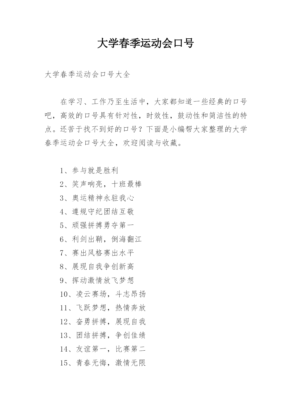 大学春季运动会口号大学春季运动会口号大全在学习、工作乃至生活中,大家都知道一些经典的口号吧,高效的口号具有针对性,时效性,鼓动性和简洁性的特点。还苦于找不到好的口号?下面是小编帮大家整理的大学春季运动会口号大全,欢迎阅读与收藏。1、参与就是胜利2、笑声响亮,十班最棒3、奥运精神永驻我心4、遵规守纪团结互敬5、顽强拼搏勇夺第一6、利剑出鞘,倒海翻江7、赛出风格赛出水平8、展现自我争创新高9、挥动激情放飞梦想10、凌云赛场,斗志昂扬11、飞跃梦想,热情奔放12、奋勇拼搏,展现自我13、团结拼搏,争创佳绩14、
