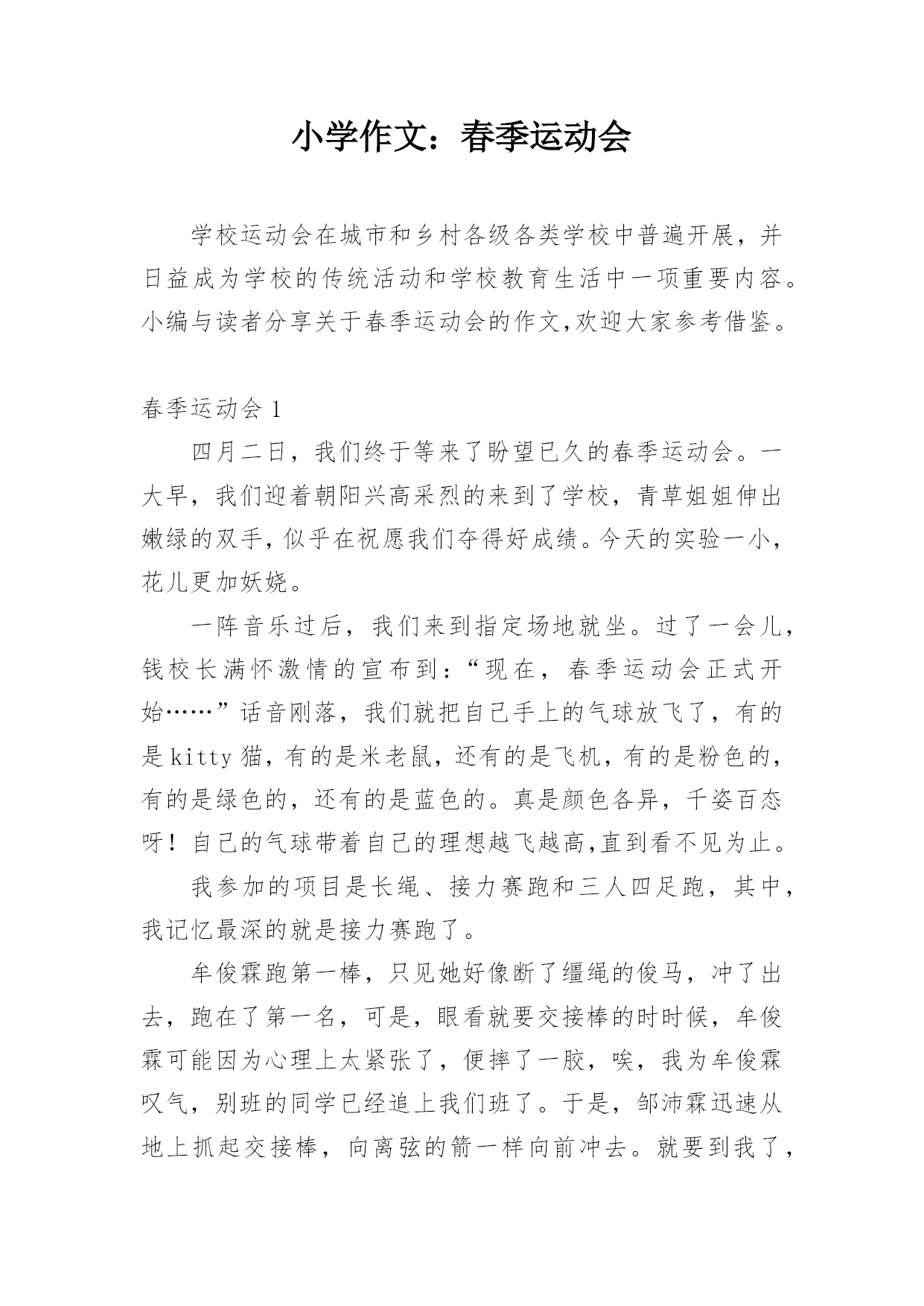 小学作文:春季运动会学校运动会在城市和乡村各级各类学校中普遍开展,并日益成为学校的传统活动和学校教育生活中一项重要内容。小编与读者分享关于春季运动会的作文,欢迎大家参考借鉴。春季运动会1四月二日,我们终于等来了盼望已久的春季运动会。一大早,我们迎着朝阳兴高采烈的来到了学校,青草姐姐伸出嫩绿的双手,似乎在祝愿我们夺得好成绩。今天的实验一小,花儿更加妖娆。一阵音乐过后,我们来到指定场地就坐。过了一会儿,钱校长满怀激情的宣布到:“现在,春季运动会正式开始……”话音刚落,我们就把自己手上的气球放飞了,有的是kit