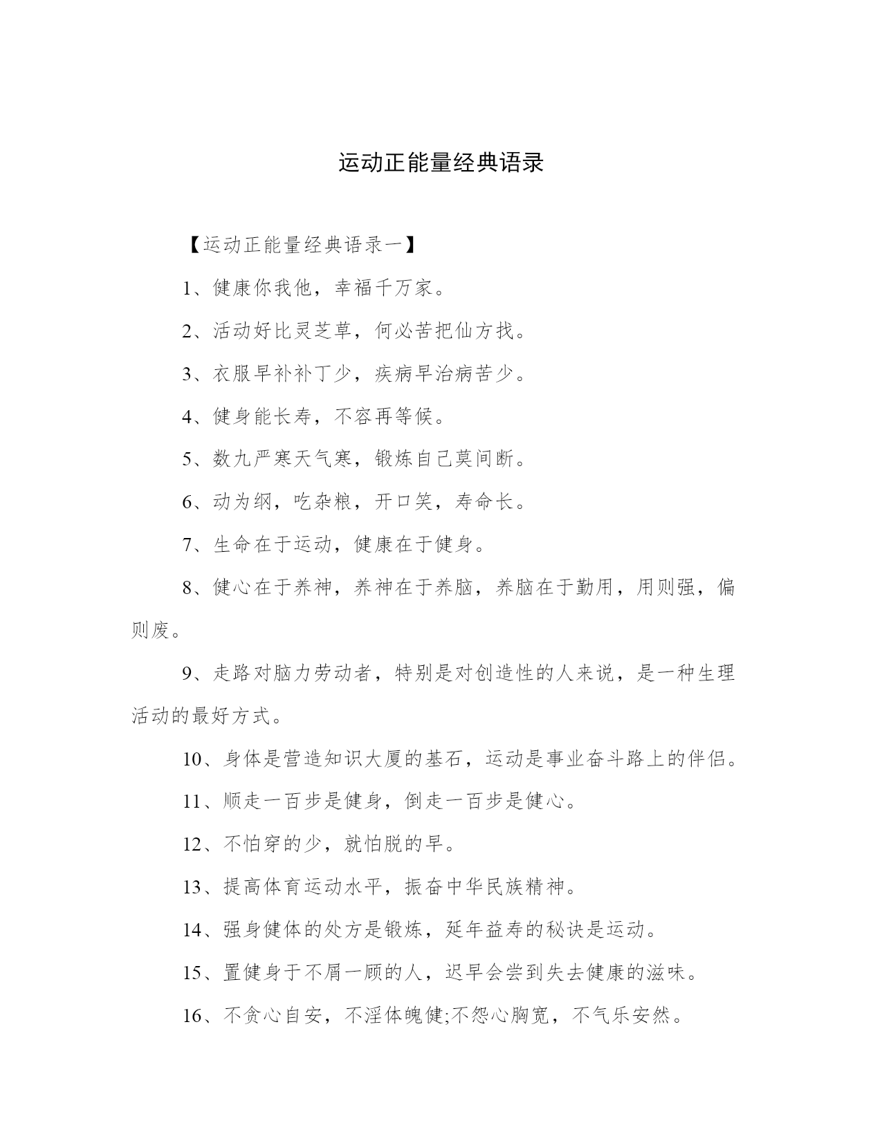 运动正能量经典语录【运动正能量经典语录一】1、健康你我他,幸福千万家。2、活动好比灵芝草,何必苦把仙方找。3、衣服早补补丁少,疾病早治病苦少。4、健身能长寿,不容再等候。5、数九严寒天气寒,锻炼自己莫间断。6、动为纲,吃杂粮,开口笑,寿命长。7、生命在于运动,健康在于健身。8、健心在于养神,养神在于养脑,养脑在于勤用,用则强,偏则废。9、走路对脑力劳动者,特别是对创造性的人来说,是一种生理活动的最好方式。10、身体是营造知识大厦的基石,运动是事业奋斗路上的伴侣。11、顺走一百步是健身,倒走一百步是健心。1