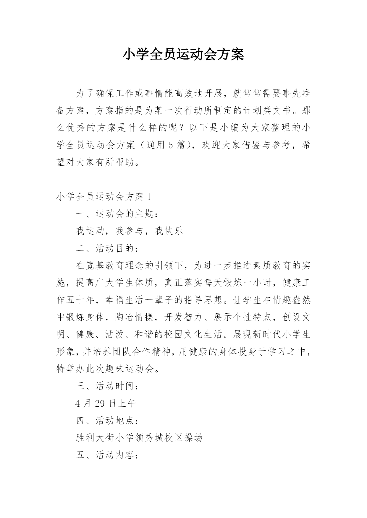 小学全员运动会方案为了确保工作或事情能高效地开展,就常常需要事先准备方案,方案指的是为某一次行动所制定的计划类文书。那么优秀的方案是什么样的呢?以下是小编为大家整理的小学全员运动会方案(通用5篇),欢迎大家借鉴与参考,希望对大家有所帮助。小学全员运动会方案1一、运动会的主题:我运动,我参与,我快乐二、活动目的:在宽基教育理念的引领下,为进一步推进素质教育的实施,提高广大学生体质,真正落实每天锻炼一小时,健康工作五十年,幸福生活一辈子的指导思想。让学生在情趣盎然中锻炼身体,陶冶情操,开发智力、展示个性特点,