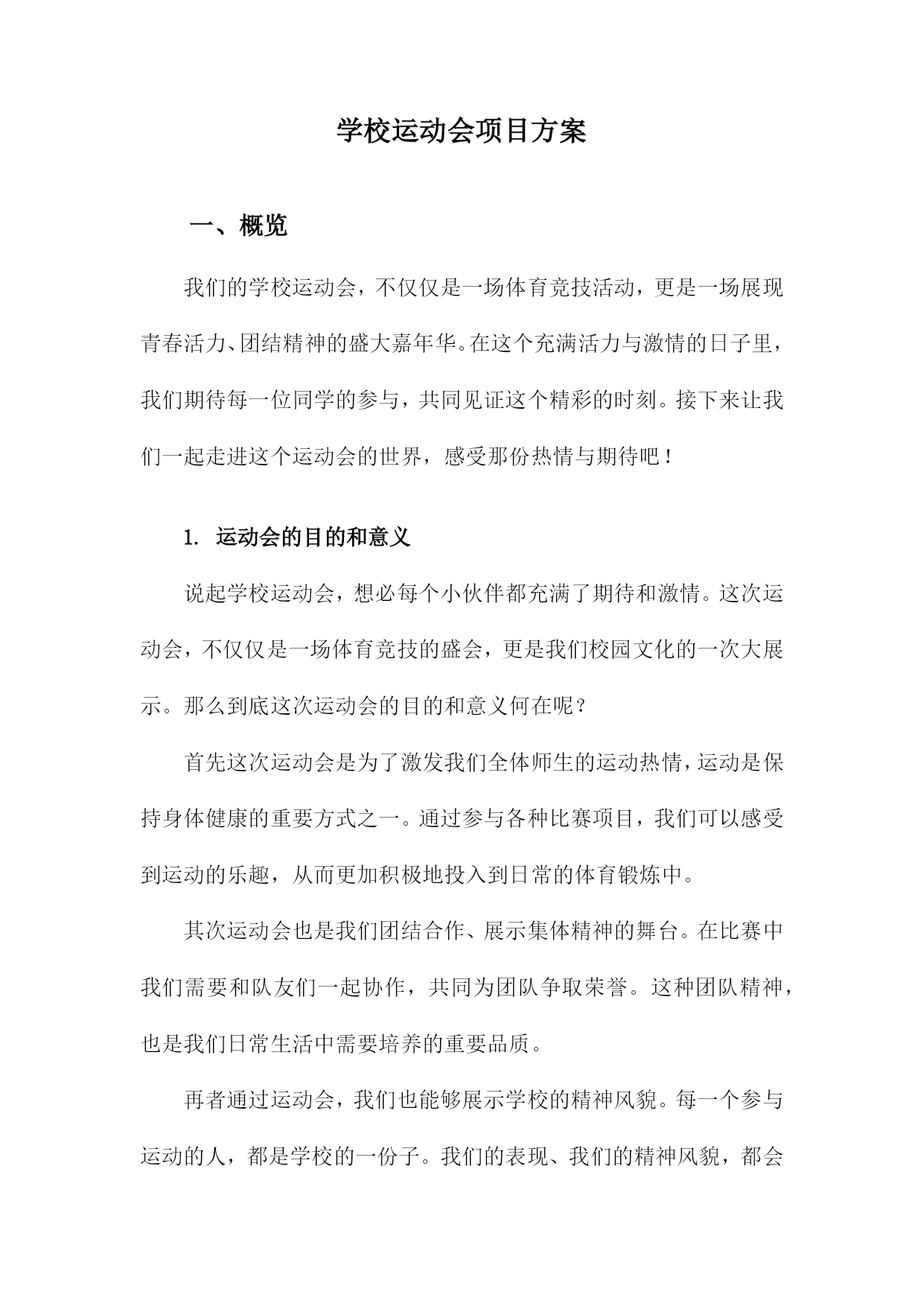 学校运动会项目方案一、概览我们的学校运动会,不仅仅是一场体育竞技活动,更是一场展现青春活力、团结精神的盛大嘉年华。在这个充满活力与激情的日子里,我们期待每一位同学的参与,共同见证这个精彩的时刻。接下来让我们一起走进这个运动会的世界,感受那份热情与期待吧!1.运动会的目的和意义说起学校运动会,想必每个小伙伴都充满了期待和激情。这次运动会,不仅仅是一场体育竞技的盛会,更是我们校园文化的一次大展示。那么到底这次运动会的目的和意义何在呢?首先这次运动会是为了激发我们全体师生的运动热情,运动是保持身体健康的重要方式