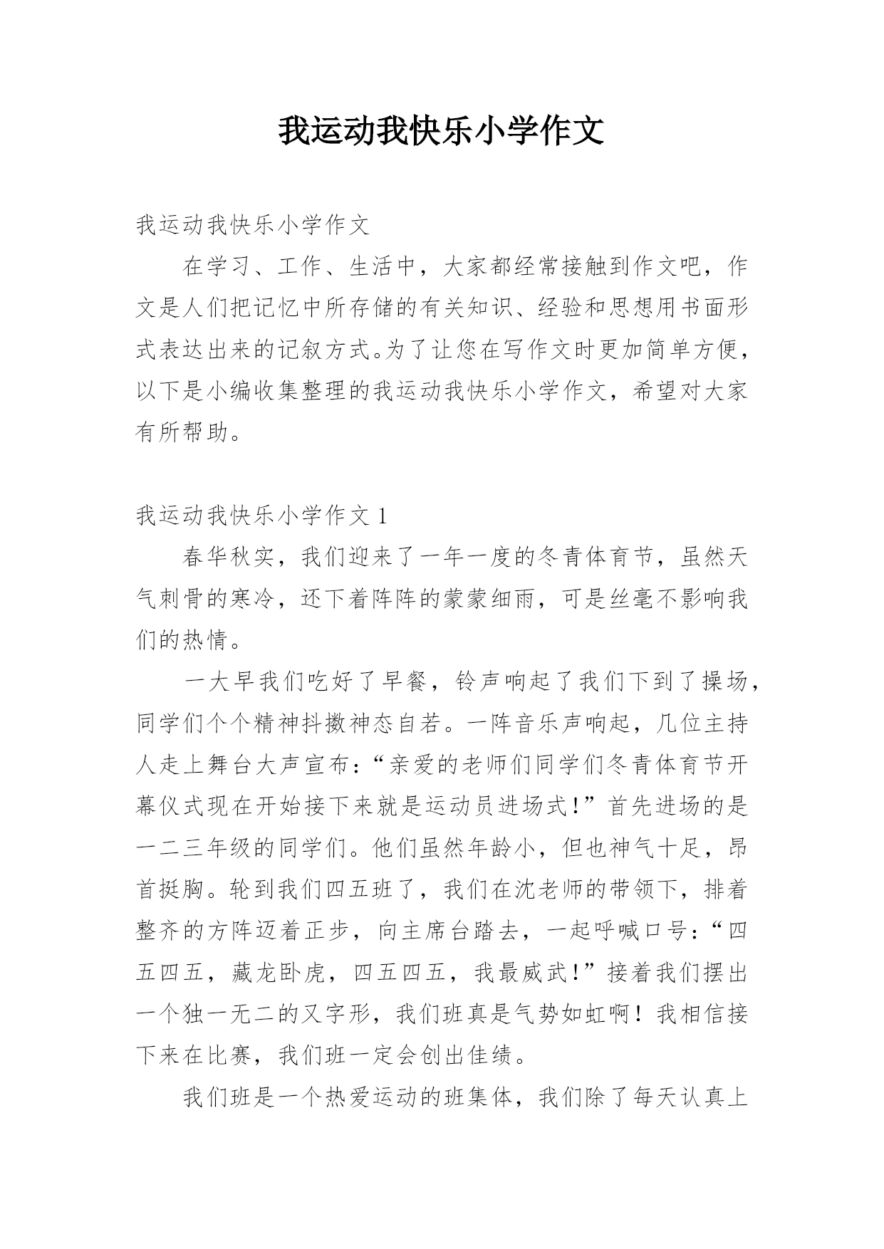 我运动我快乐小学作文我运动我快乐小学作文在学习、工作、生活中,大家都经常接触到作文吧,作文是人们把记忆中所存储的有关知识、经验和思想用书面形式表达出来的记叙方式。为了让您在写作文时更加简单方便,以下是小编收集整理的我运动我快乐小学作文,希望对大家有所帮助。我运动我快乐小学作文1春华秋实,我们迎来了一年一度的冬青体育节,虽然天气刺骨的寒冷,还下着阵阵的蒙蒙细雨,可是丝毫不影响我们的热情。一大早我们吃好了早餐,铃声响起了我们下到了操场,同学们个个精神抖擞神态自若。一阵音乐声响起,几位主持人走上舞台大声宣布:“