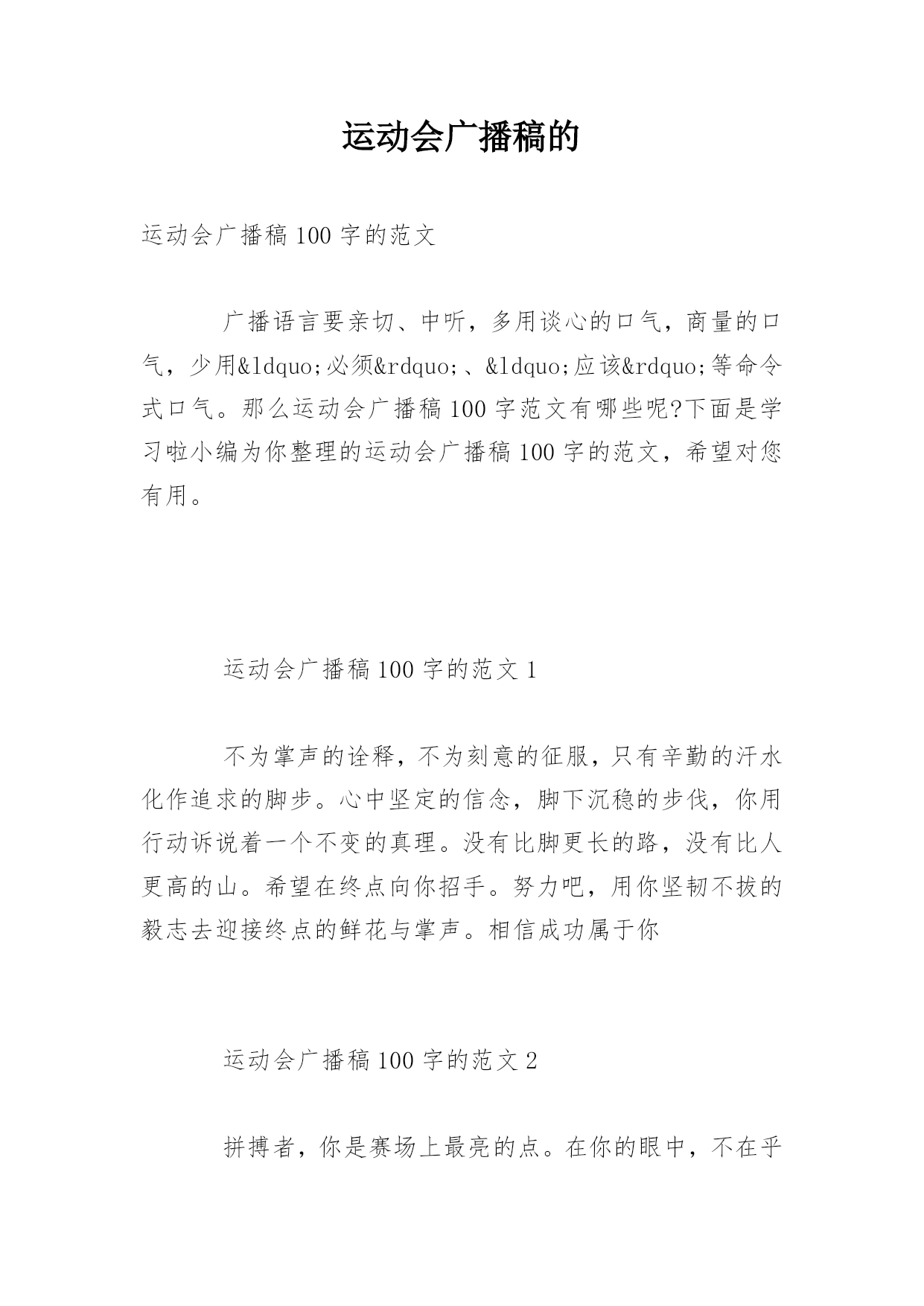 运动会广播稿的运动会广播稿100字的范文广播语言要亲切、中听,多用谈心的口气,商量的口气,少用“必须”、“应该”等命令式口气。那么运动会广播稿100字范文有哪些呢?下面是学习啦小编为你整理的运动会广播稿100字的范文,希望对您有用。运动会广播稿100字的范文1不为掌声的诠释,不为刻意的征服,只有辛勤的汗水化作追求的脚步。心中坚定的信念,脚下沉稳的步伐,你用行动诉说着一个不变的真理。没有比脚更长的路,没有比人更高的山。希望在终点向你招手。努力吧,用你坚韧不拔的