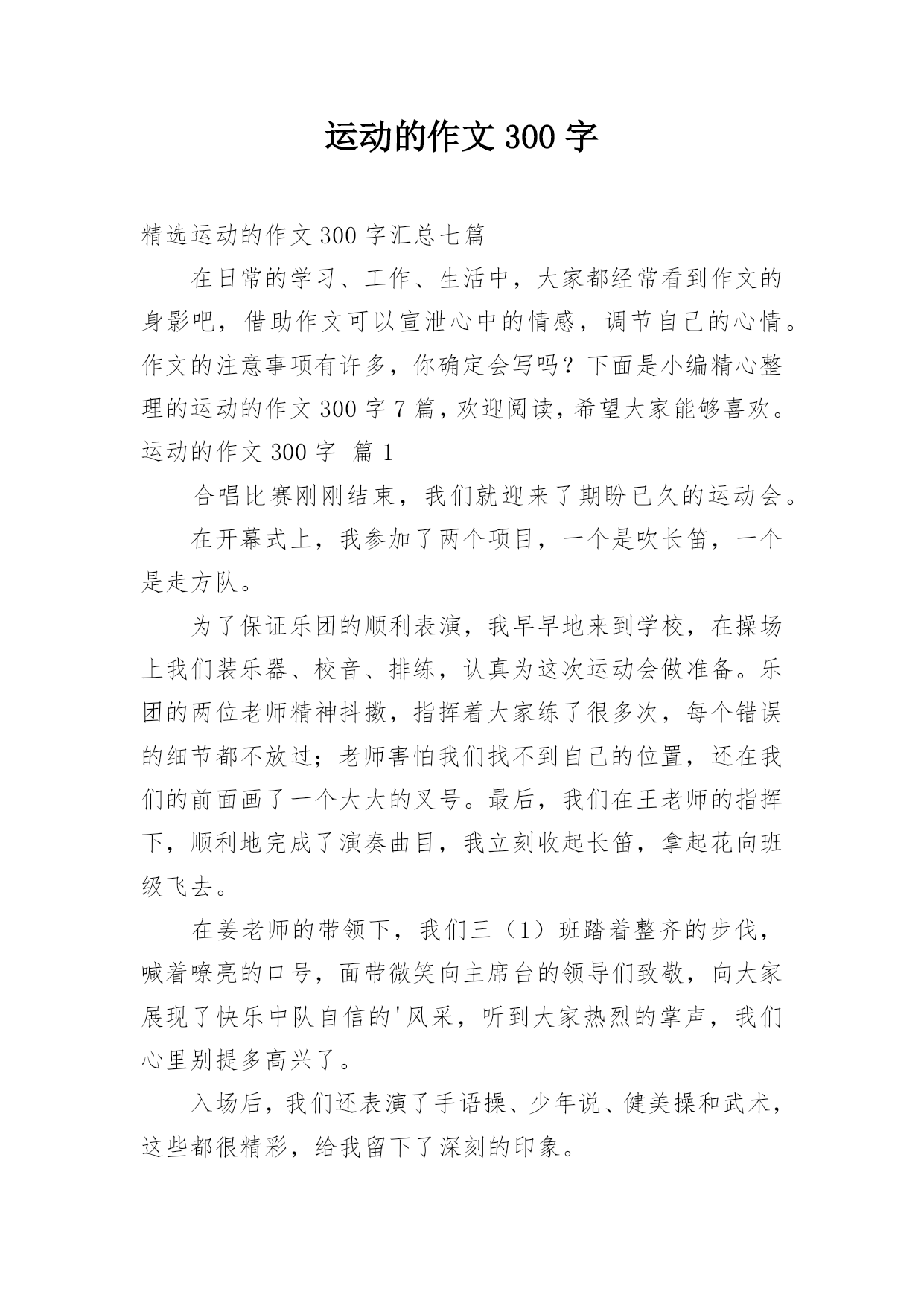 运动的作文300字精选运动的作文300字汇总七篇在日常的学习、工作、生活中,大家都经常看到作文的身影吧,借助作文可以宣泄心中的情感,调节自己的心情。作文的注意事项有许多,你确定会写吗?下面是小编精心整理的运动的作文300字7篇,欢迎阅读,希望大家能够喜欢。运动的作文300字篇1合唱比赛刚刚结束,我们就迎来了期盼已久的运动会。在开幕式上,我参加了两个项目,一个是吹长笛,一个是走方队。为了保证乐团的顺利表演,我早早地来到学校,在操场上我们装乐器、校音、排练,认真为这次运动会做准备。乐团的两位老师精神抖擞,指挥