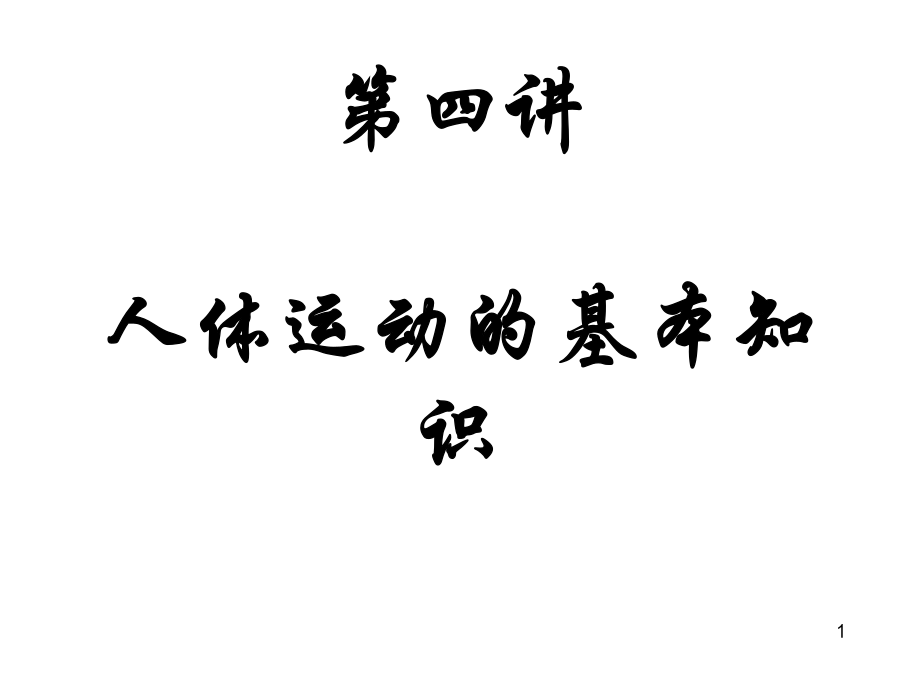 第四讲人体运动的基本知识第四节人体运动的形式和原理(二)人体关节的运动形式1.屈曲(flexion)/伸展(extension):主要是以横轴为中心,在矢状面上的运动。2.内收(adduction)/外展(abduction):主要是以矢状轴为中心,在前额面上的运动。3.内旋(internalrotation)/外旋(externalrotation):主要是以纵轴为中心,在水平面上的运动。4.前臂和小腿有旋前/旋后运动。5.足踝部还有内翻(inversion)/外翻(eversion)运动。第四节人体运